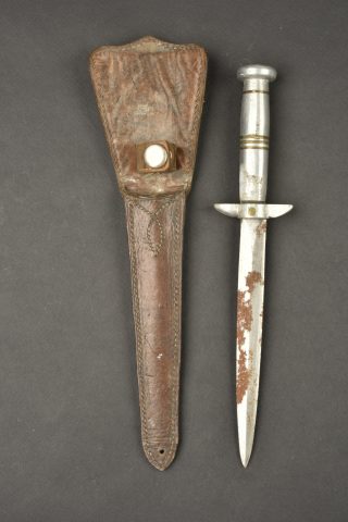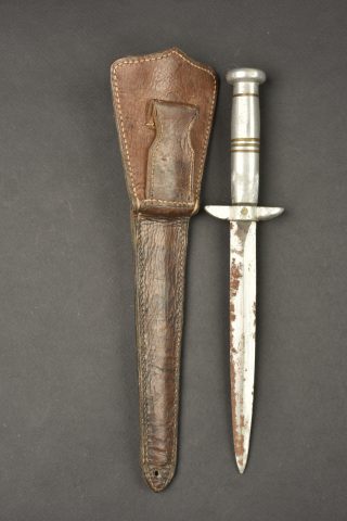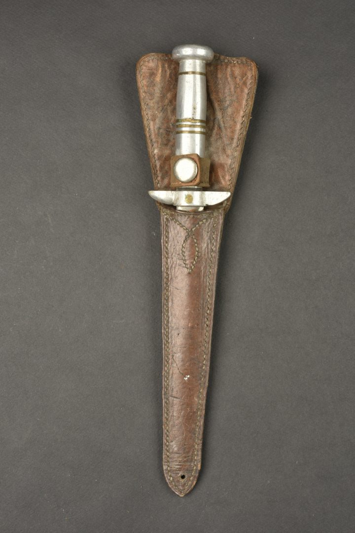 Dague poignard de combat poignée aluminium. Lame à double tranchant longue de 18 cm. Oxydation. Longueur totale 29 cm. Poignée et garde en aluminium, avec inclusions de listels en laiton. Fourreau cuir avec passant de ceinturon et patte de serrage, pression fonctionelle.