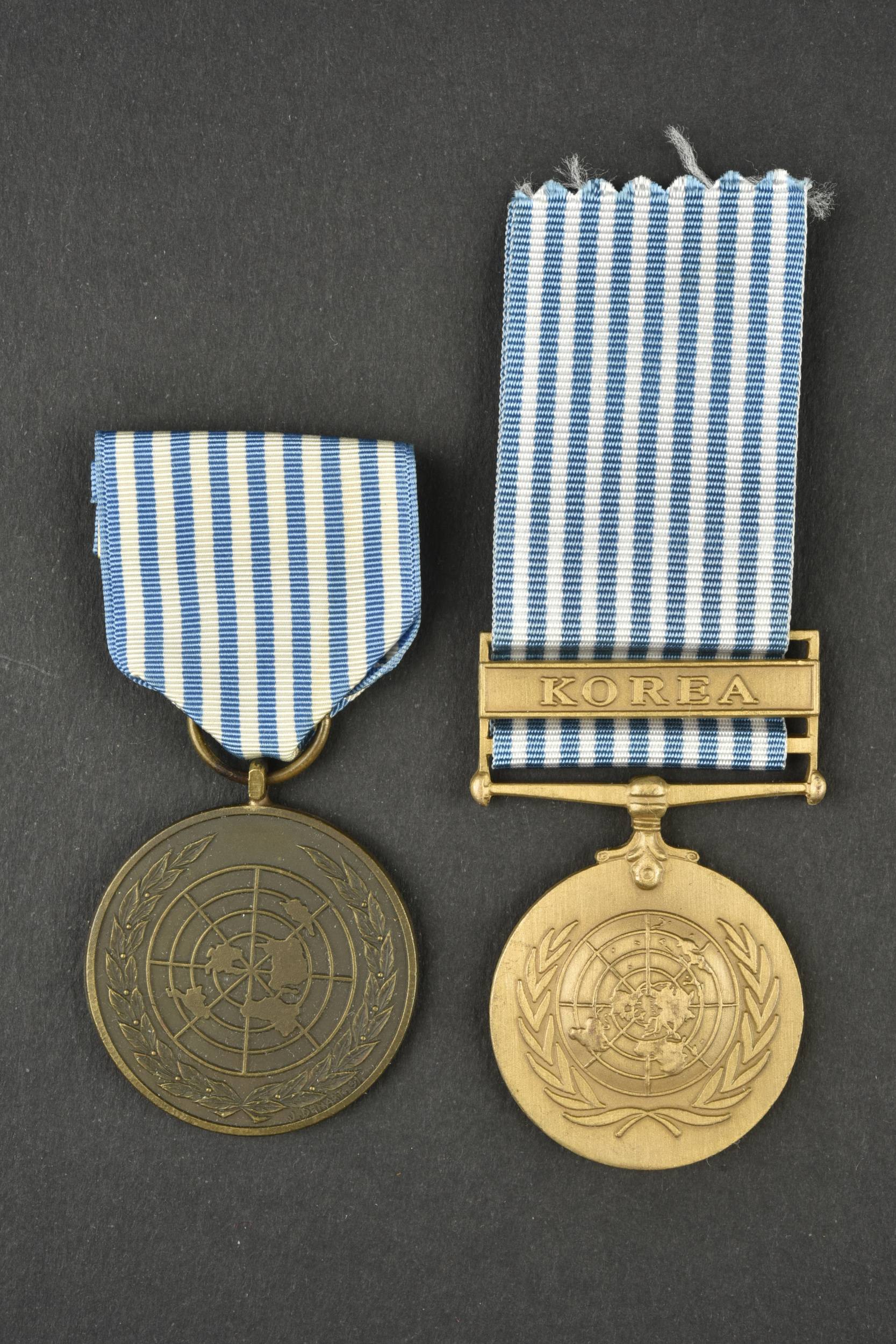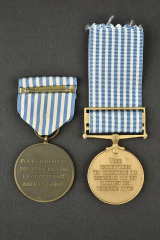 Deux médailles de Corée ONU du Bataillon de Volontaires Belges. Une texte francophone, l’autre texte en Néerlandais
