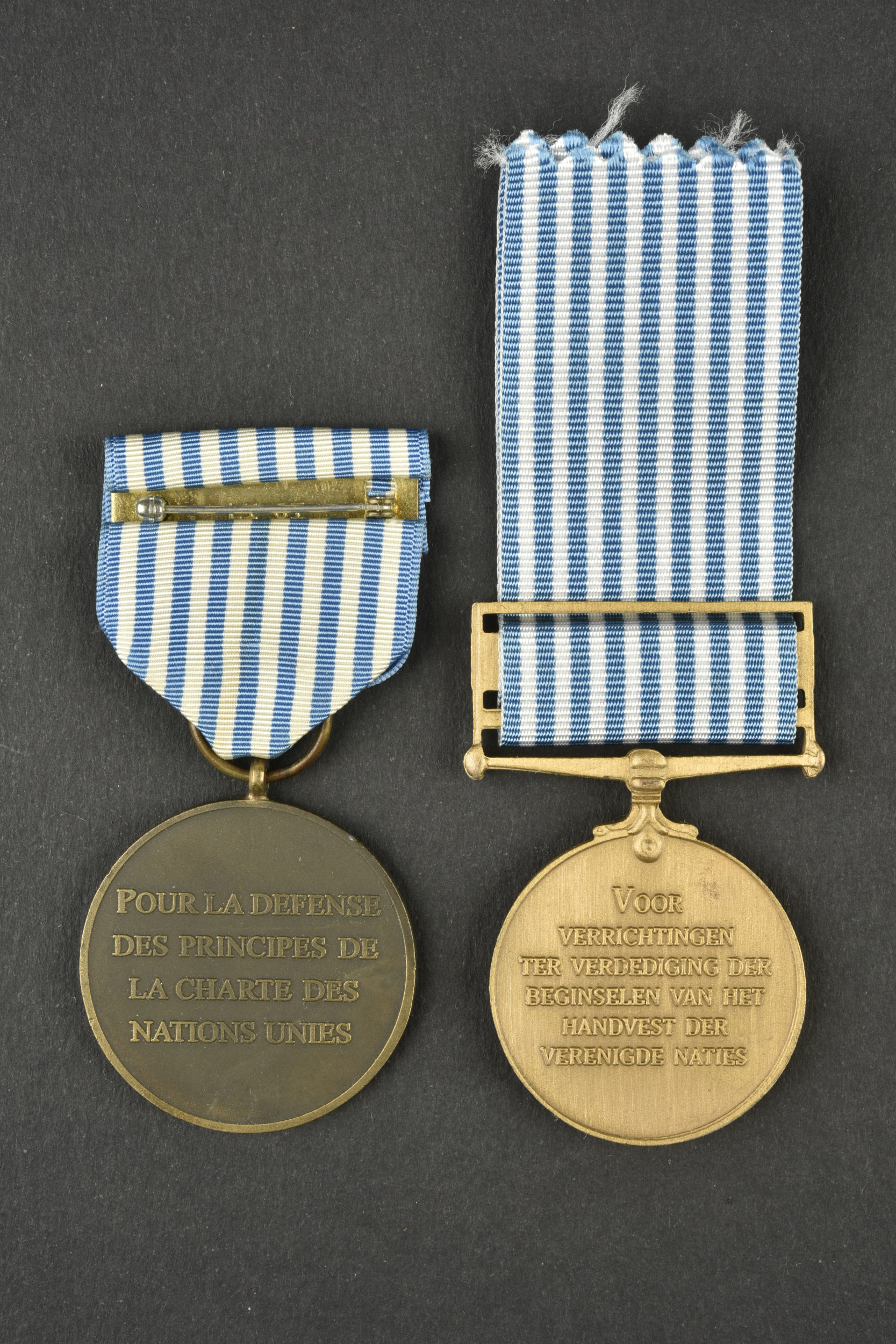 Détails de la vente >Deux médailles de Corée ONU du Bataillon de Volontaires Belges. Une texte francophone, l’autre texte en Néerlandais