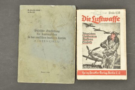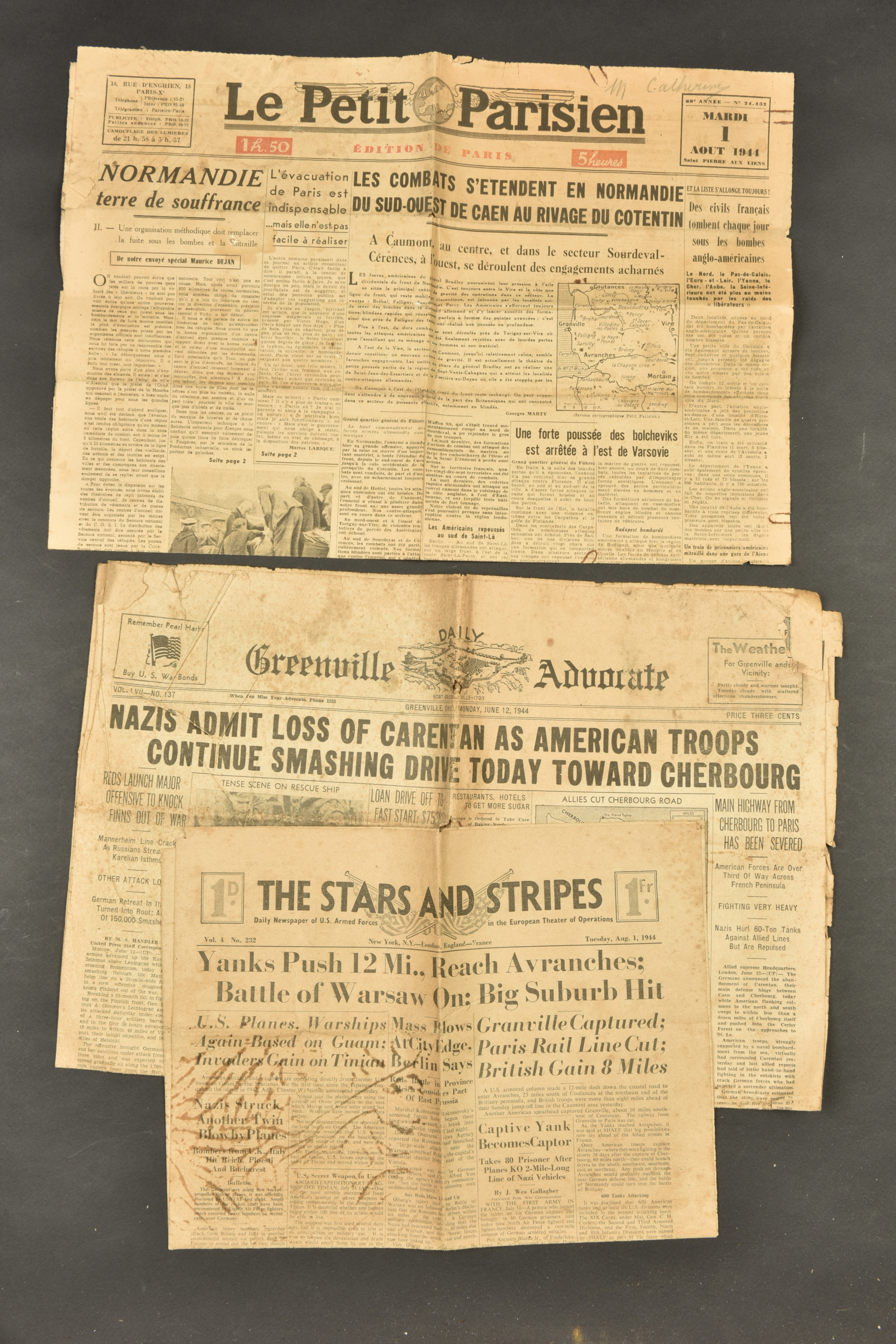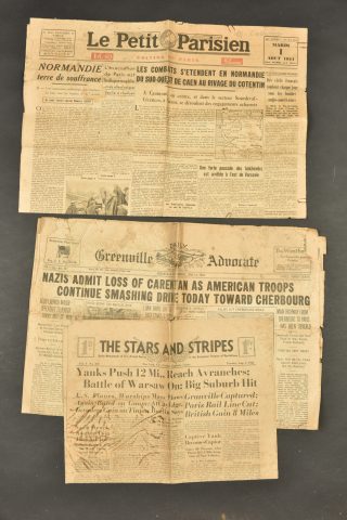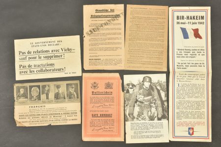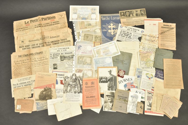 Documents divers. Comprenant un billet de 1000 francs de 1939. Un billet de 10 francs et un billet de 500 francs. Un livret Inter Diocesan Pictures. Un document US retrouvé dans les Ardennes. Un document US marqué Pouch Tobacco Roll Type. Un tract Maréchal Pétain. Divers documents US. Un livret Kartenfiblel, 1944. Un document Die Luftwaffe. Une carte postale du Général Pétain. Un livret ausbildungsvoschrift für die Artillerie 1937. Une carte postale du général Leclerc. Une carte postale Cœur de Française. Une photo du Général Leclerc. Une carte de la Russie. Une photo du Soldatenheim de Bayeux. Une enveloppe V Mail. Un journal The Stars and Stripes 1er août 1944. Un courrier de l’air 13 janvier 1944. Un journal Greenville Ohio, 12 juin 1944. Deux feuilles V Mail. Un journal Ouest, daté du 15 novembre 1944. Une revue de la presse libre. Un courrier de l’air, 1er avril 1943. Divers cartes de rationnement. Une demande de carte de jardinage. Un livret Hymnes alliés. Un livret Marche Lorraine. Un livret Bir Hakeim. 5 tracts allemand et US. Dix billets de banque allemand et français. Plusieurs cartes d’identité. Un journal le parisien du 1er août 1944. Un livret l’armée française au combat. A noter une certaine usure et patine des pièces. Etat II+.