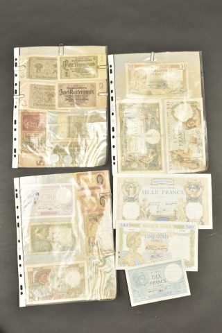 Détails de la vente >Documents divers. Comprenant un billet de 1000 francs de 1939. Un billet de 10 francs et un billet de 500 francs. Un livret Inter Diocesan Pictures. Un document US retrouvé dans les Ardennes. Un... en savoir plus