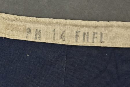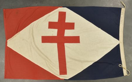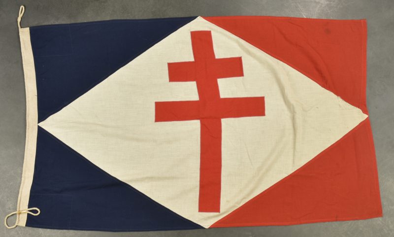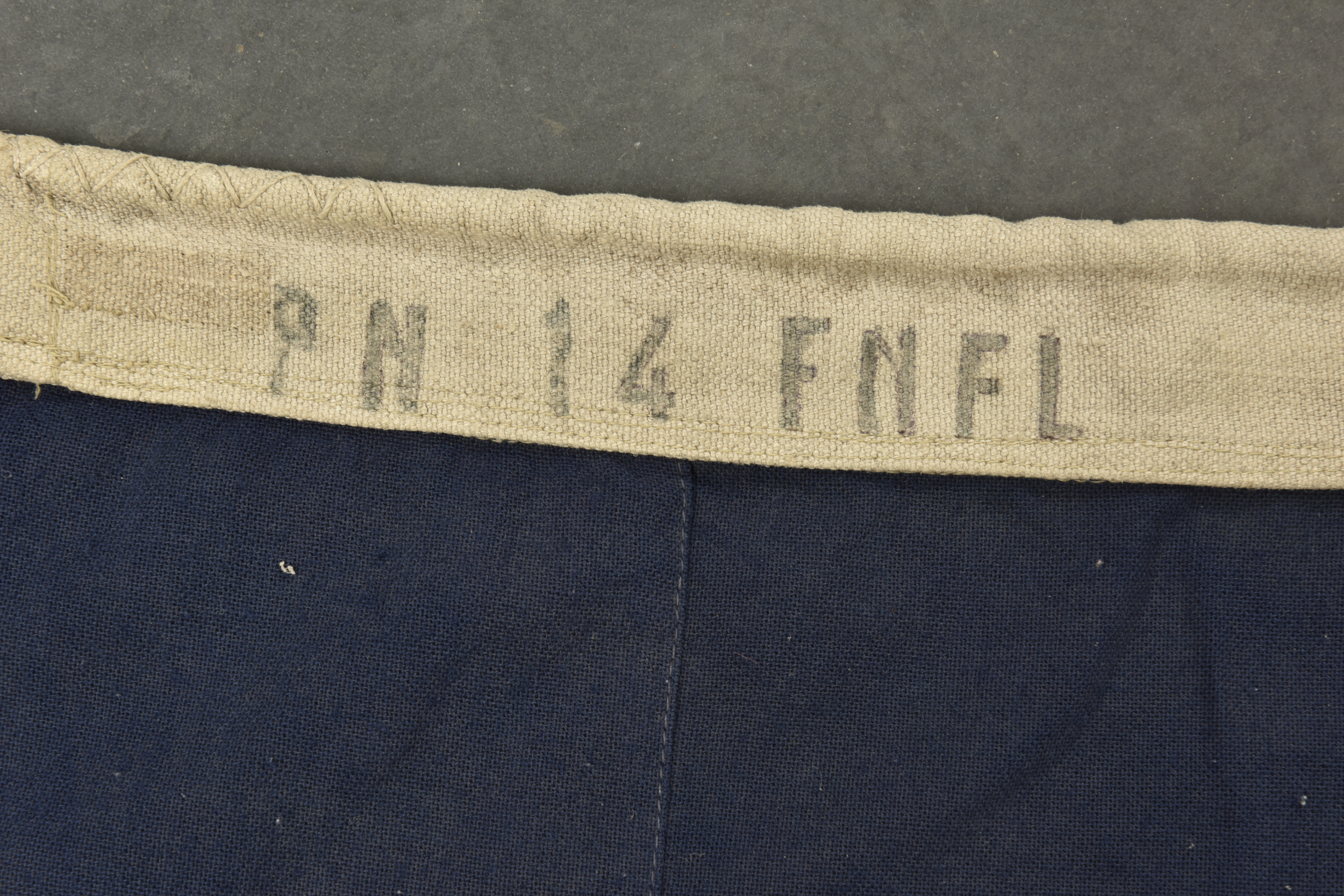 Drapeau des Forces navales de la France Libre. En tissu coton. Fabrication en plusieurs parties. Double face. Le cordon de fixation est présent, un morceau est réparé avec du scotch. Marquages PN 14 FNFL au pochoir. Quelques réparations visibles sur la totalité du drapeau. Dimensions 90 x 160 cm. A noter une certaine usure et patine de la pièce, ainsi que des tâches et accrocs. Etat II+.