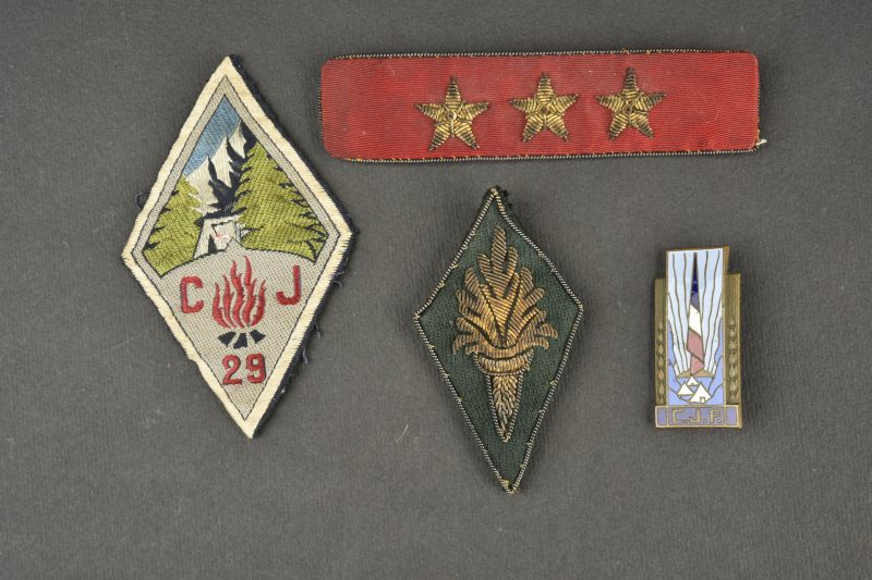 Détails de la vente >Ensemble Chantiers de Jeunesse. Comprenant l’insigne tissu du Groupement 29 sur fond blanc, correspondant au groupe de direction. Insigne de l’Ecole des Chefs Administratifs des... en savoir plus