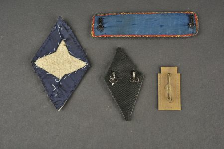 Ensemble Chantiers de Jeunesse. Comprenant l’insigne tissu du Groupement 29 sur fond blanc, correspondant au groupe de direction. Insigne de l’Ecole des Chefs Administratifs des Chantiers de la Jeunesse, destiné aux cadres supérieurs et moyens des services administratifs, notamment les apprentis commis après leur sortie de l’Ecole des Chefs Administratifs. L’insigne se porte au-dessus de la barrette de grade, doublure en satinette bleue portant 2 crochets de fixations.. Brodé en cannetille dorée sur un drap sergé vert forêt, revers doublé en satinette et possédant deux crochets. Barette de grade d’un commissaire chef de groupement. Insigne général en métal émaillé des JF Drago Béranger.