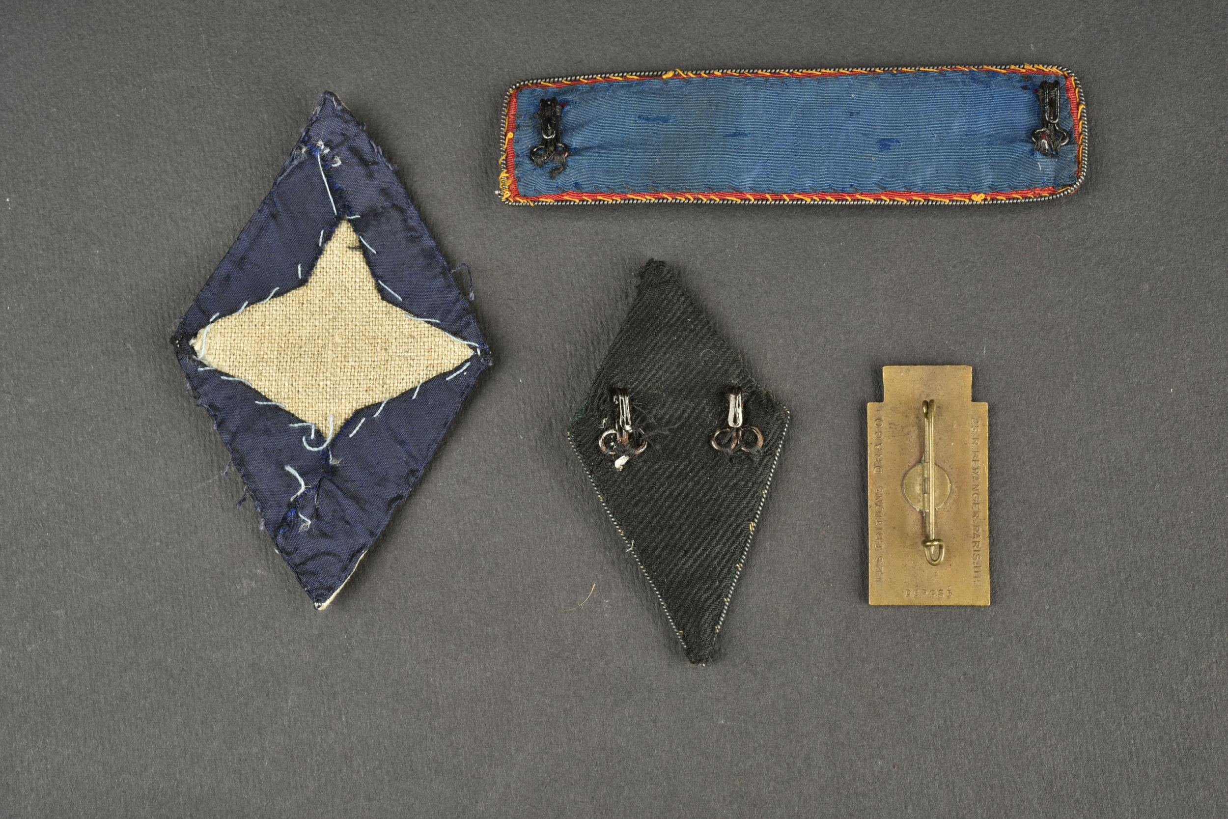 Ensemble Chantiers de Jeunesse. Comprenant l’insigne tissu du Groupement 29 sur fond blanc, correspondant au groupe de direction. Insigne de l’Ecole des Chefs Administratifs des... en savoir plus