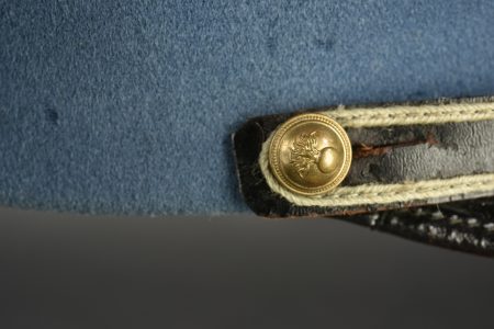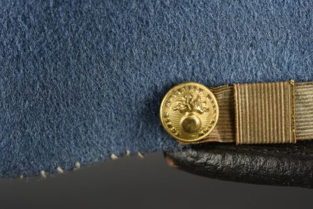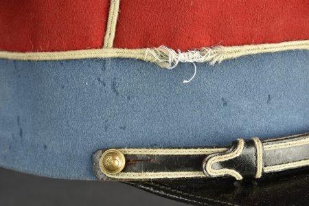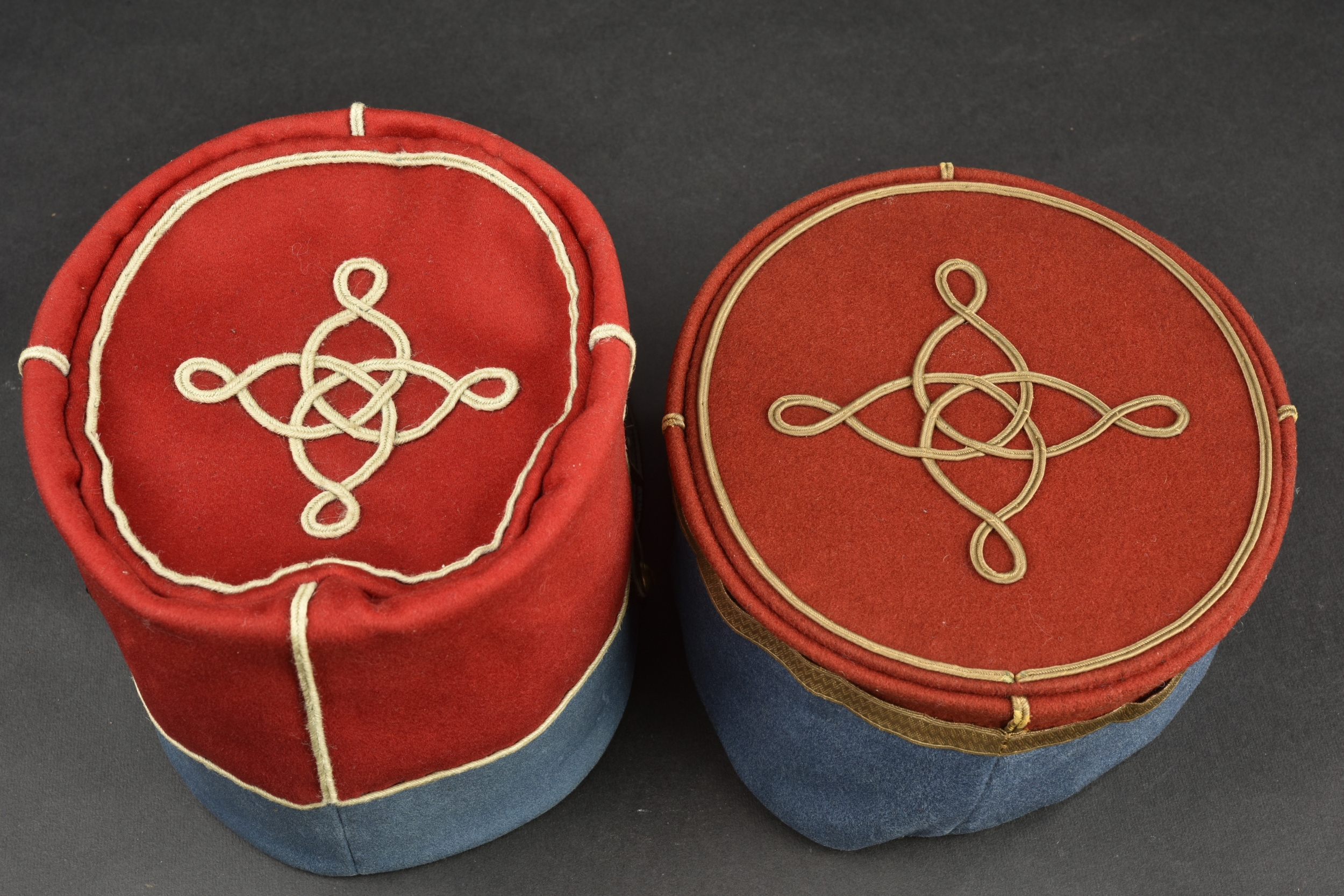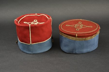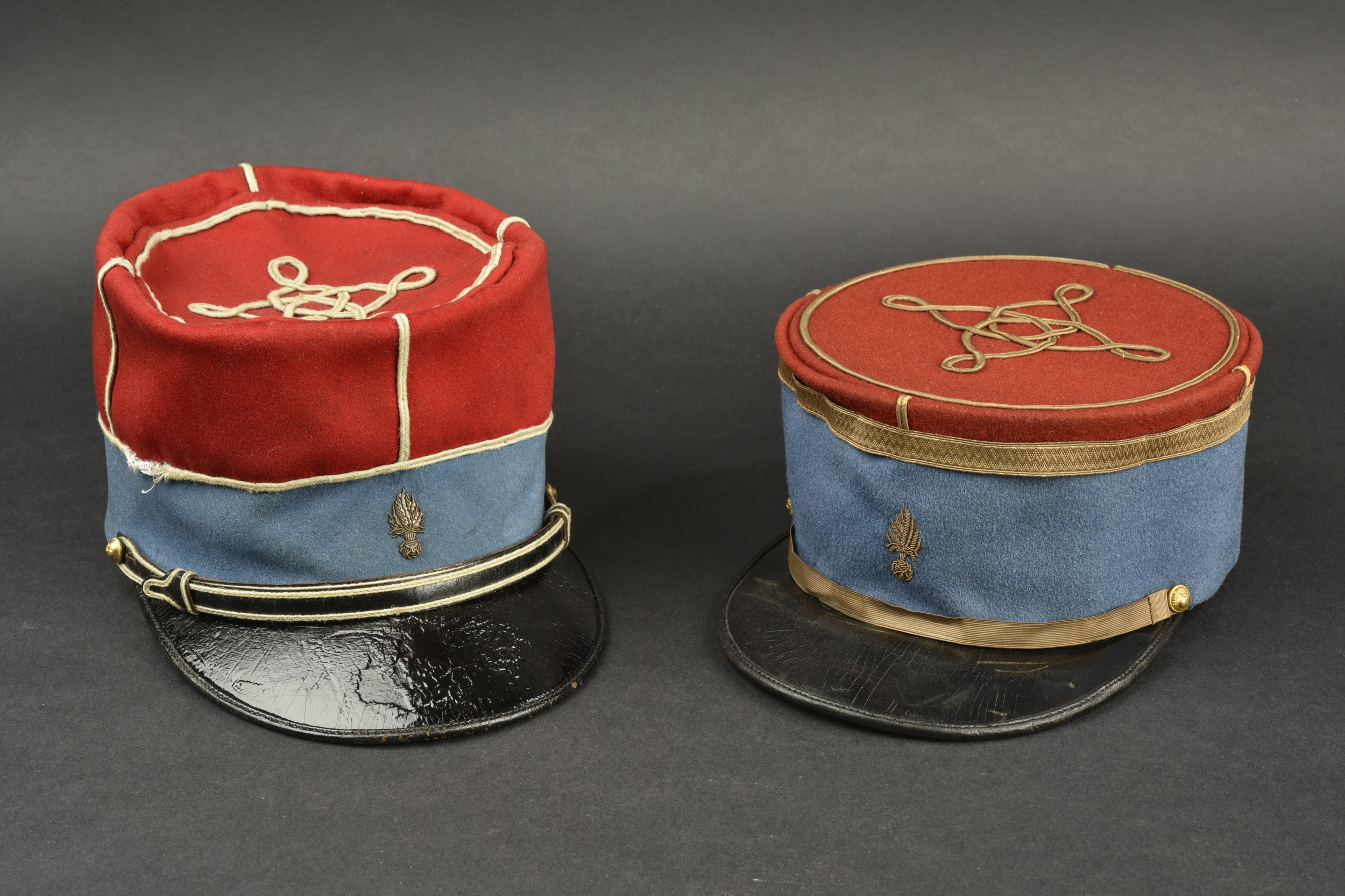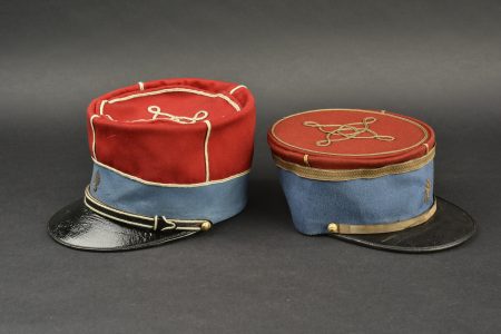 Ensemble de képis. Comprenant un képi foulard d’école militaire, bandeau en drap gris bleu, plateau garance, nœud hongrois et galons en coton blanc. Grenade brodée en cannetille dorée,... en savoir plus