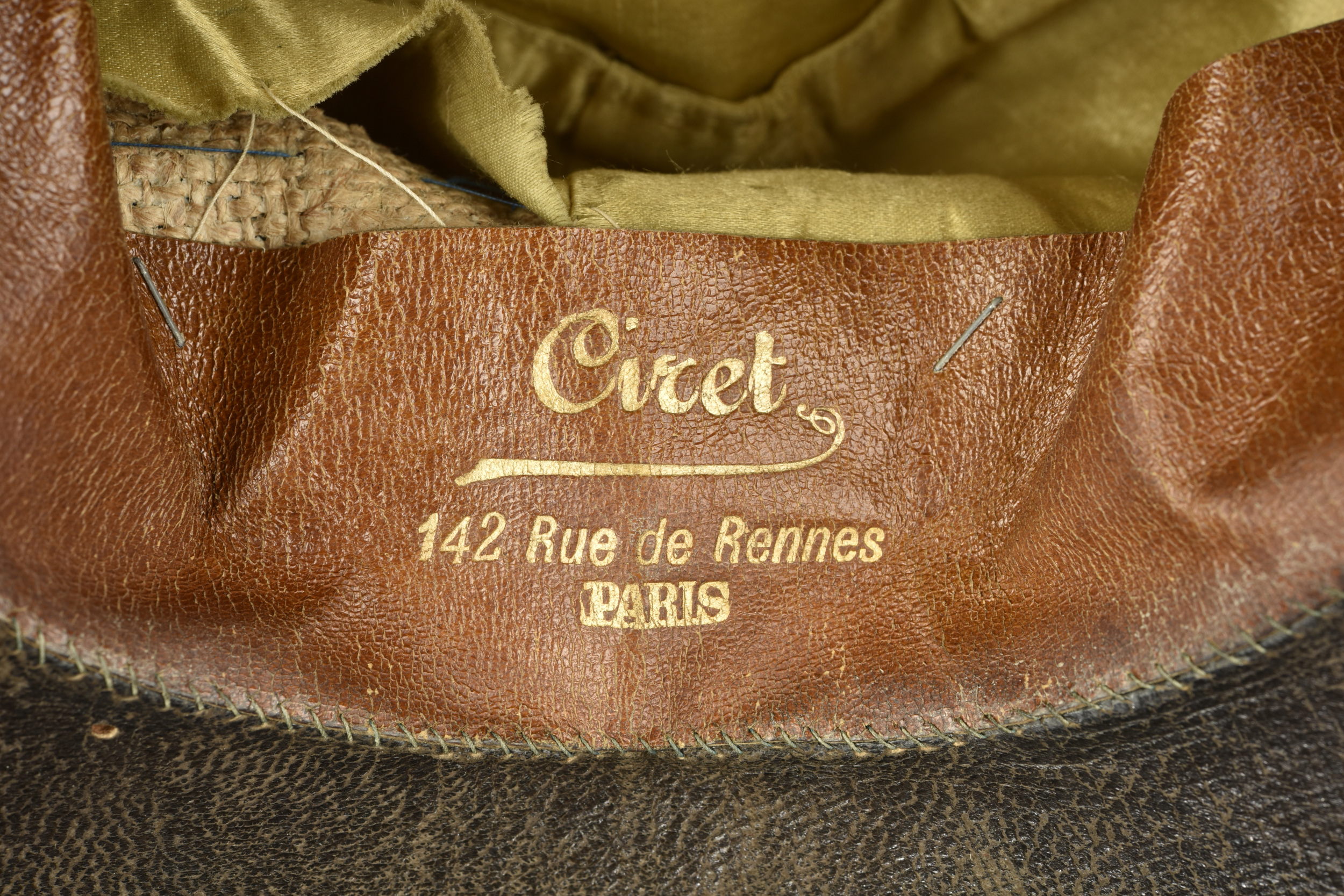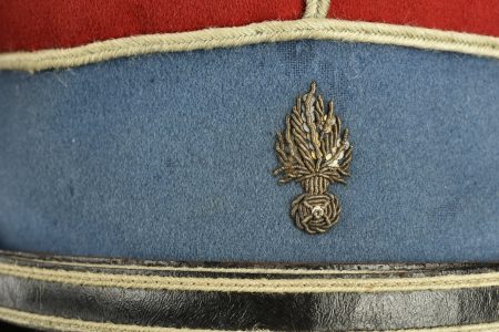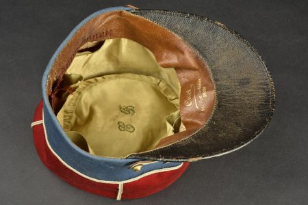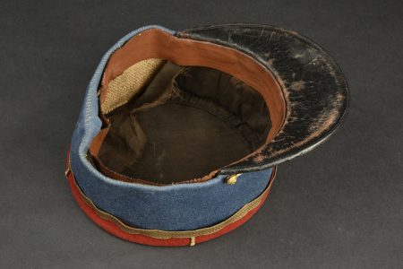 Ensemble de képis. Comprenant un képi foulard d’école militaire, bandeau en drap gris bleu, plateau garance, nœud hongrois et galons en coton blanc. Grenade brodée en cannetille dorée, boutons dorés à la grenade de l’infanterie. Fausse jugulaire en cuir, visière souple en cuir. Doublure en satinette portant les initiales EB au fond du képi, bandeau de sudation en cuir fauve avec marquage de tailleur Ciret à Paris. A noter deux agrafes sur le bandeau. Un képi polo de l’école militaire, bandeau en drap gris bleu, grades et nœuds hongrois dorés, grenade brodée cannetille, boutons de l’ESM. Bandeau de sudation décousu sur la moitié.
