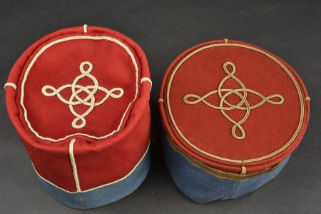 Détails de la vente >Ensemble de képis. Comprenant un képi foulard d’école militaire, bandeau en drap gris bleu, plateau garance, nœud hongrois et galons en coton blanc. Grenade brodée en cannetille dorée,... en savoir plus