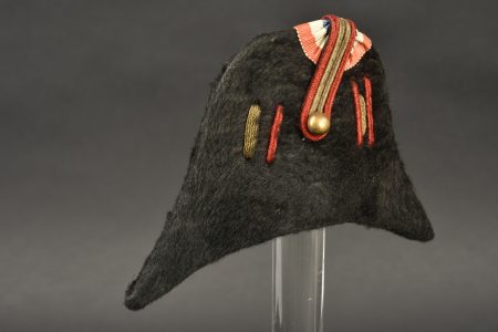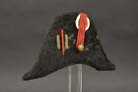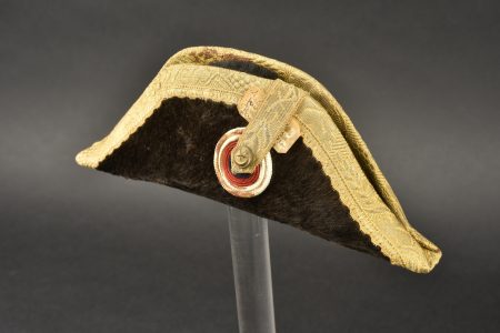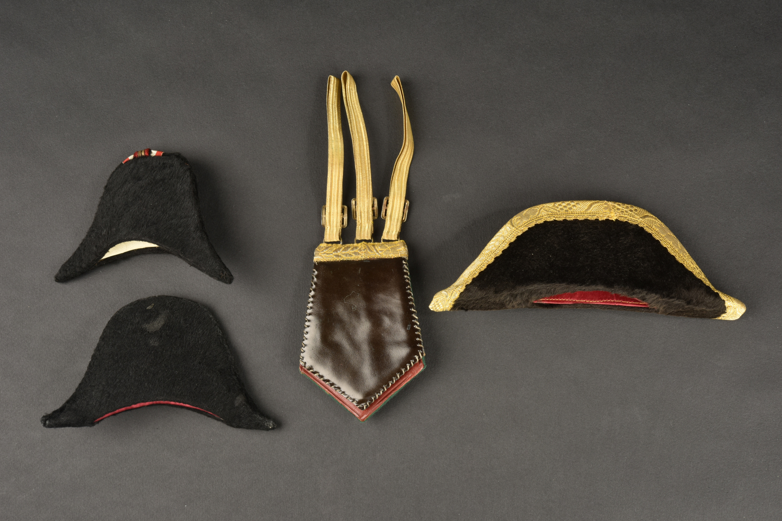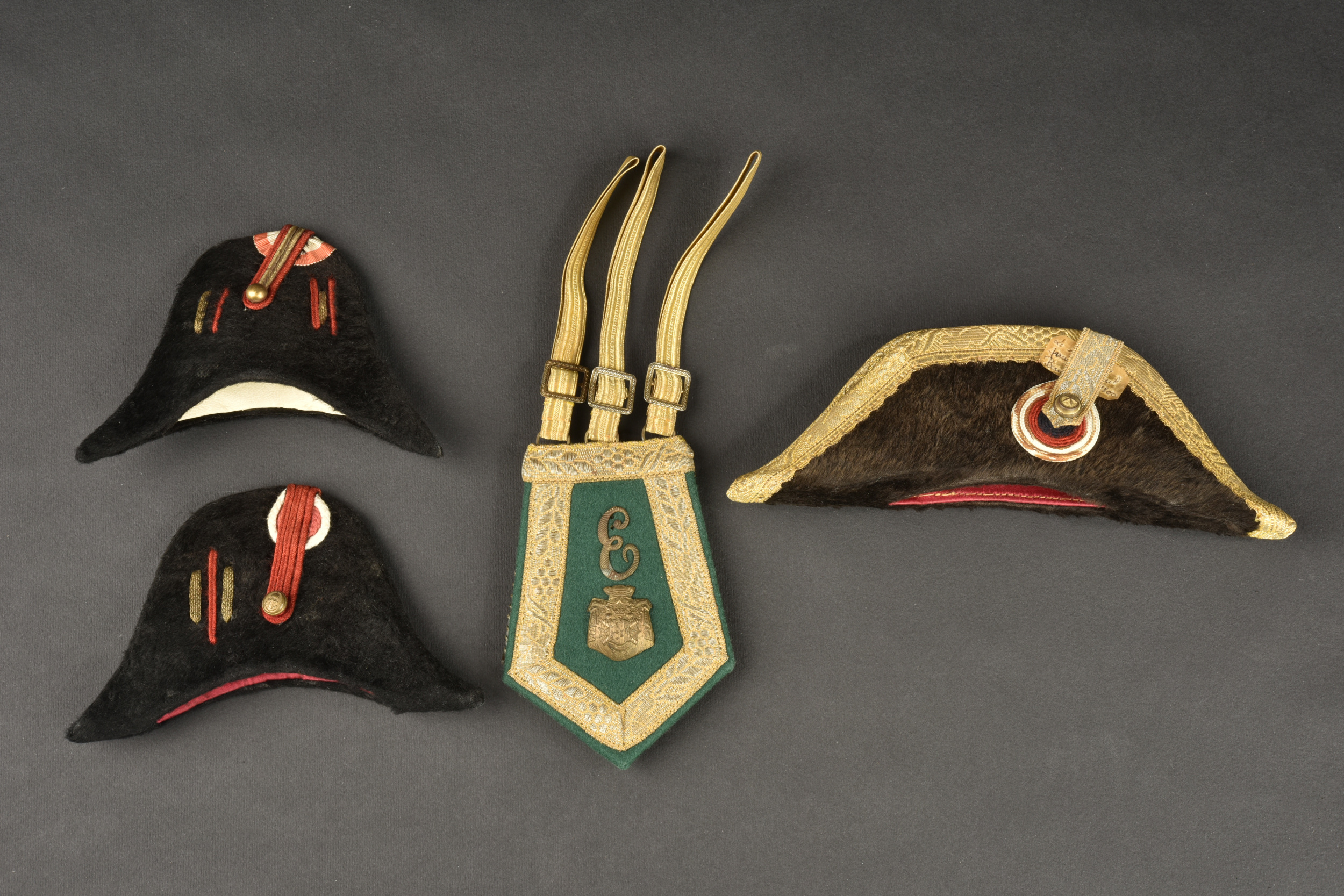 Détails de la vente >Ensemble de miniatures de bicornes et sabretache. 3 miniatures de bicornes et une miniature de sabretache avec monogramme E et armoiries. Jolis objets de vitrine. Bon état.