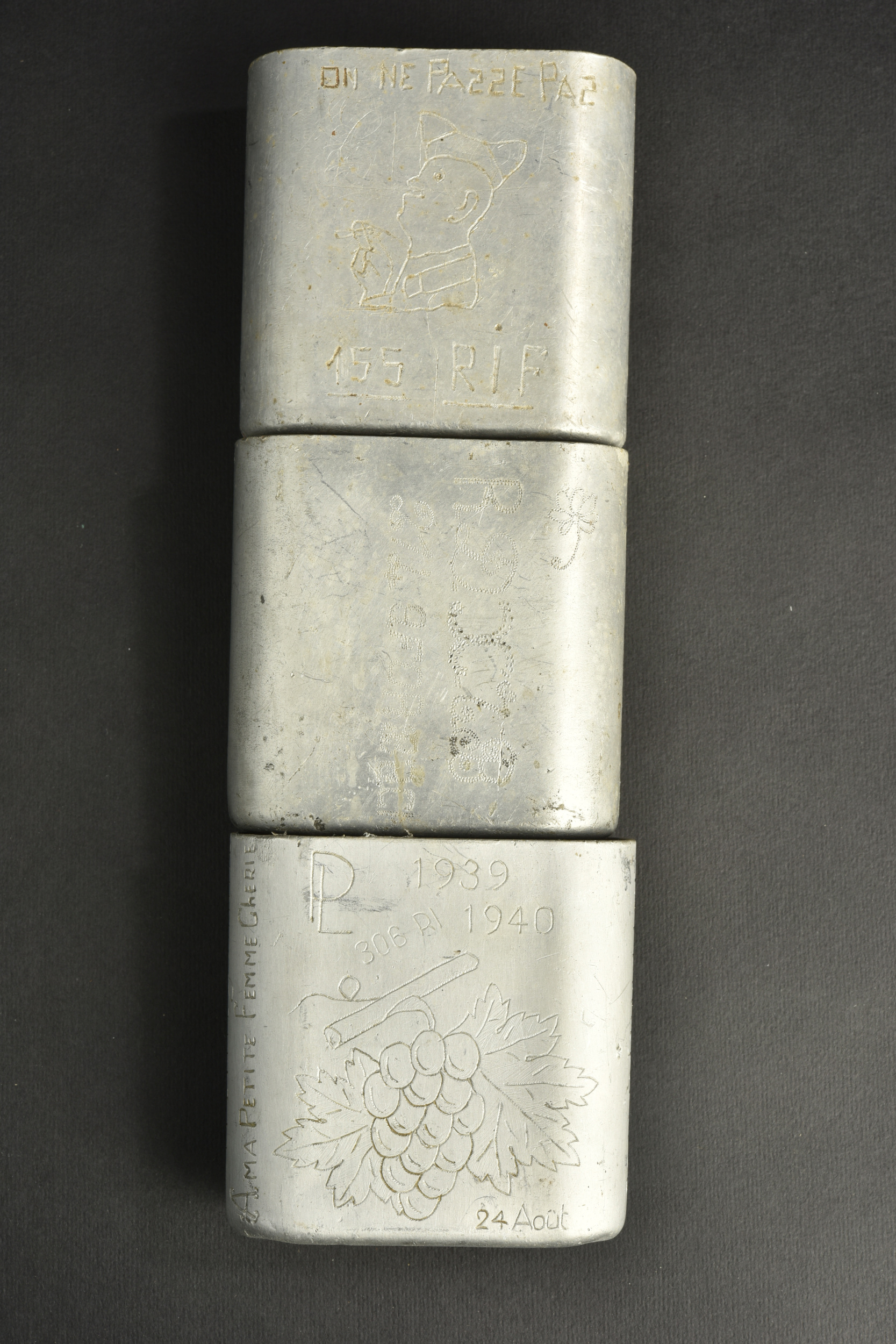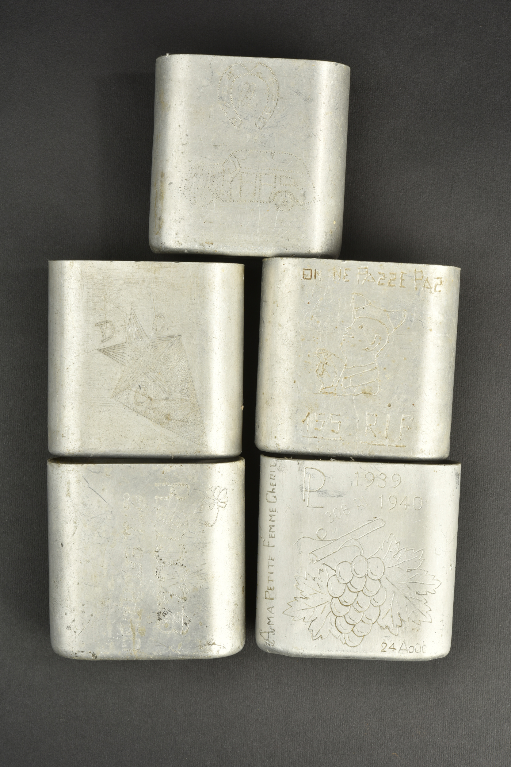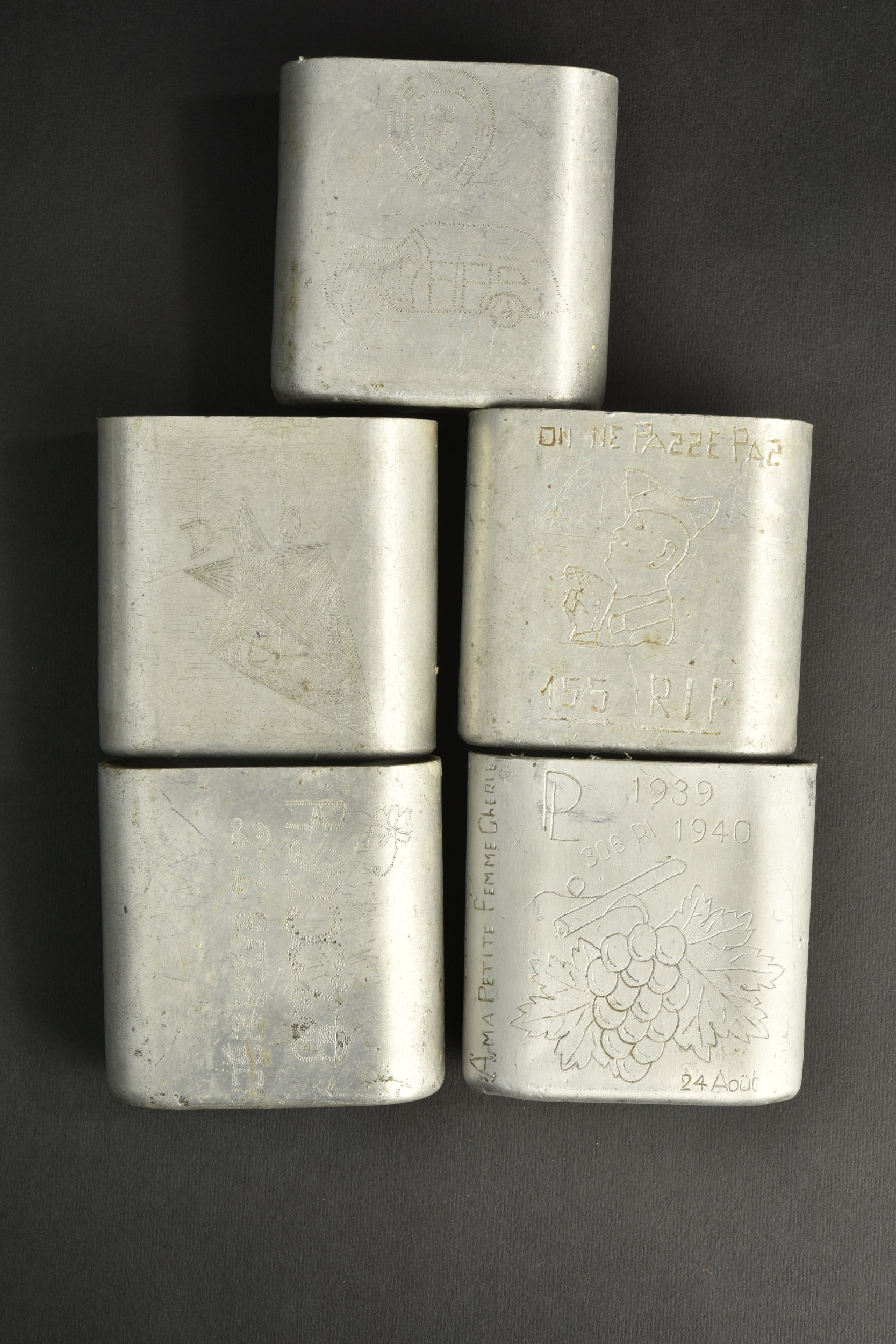 Ensemble de quarts gravés 1935. Comprenant cinq quarts gravés modèle 1935 dont un du155ème RIF On ne passe pas avec un soldat fumant une cigarette, un du 306ème RI 1939-1940 avec des décors de vigne et de fleurs, un gravé d’une voiture et d’un fer à cheval et un autre difficileent lisible.
