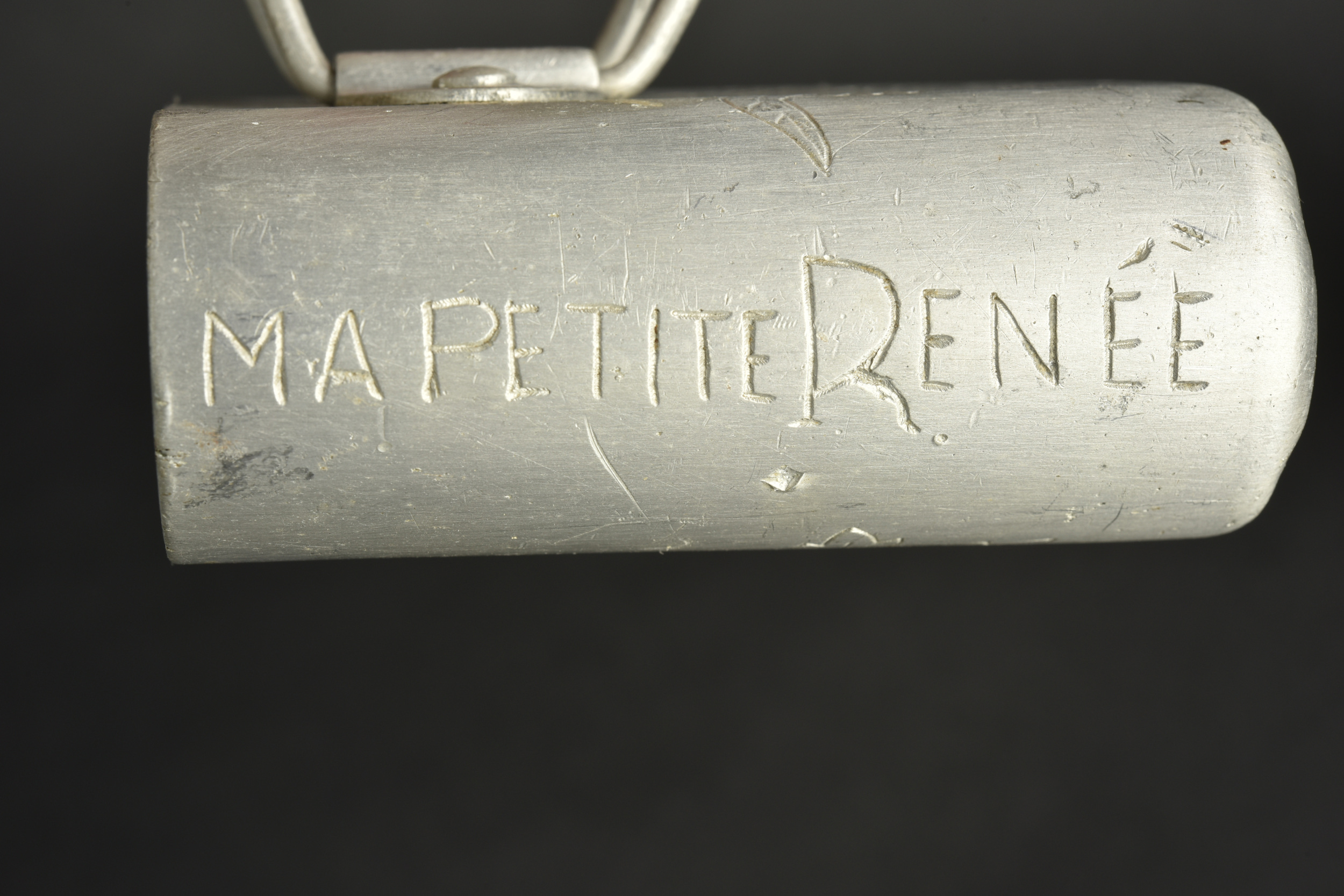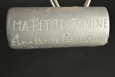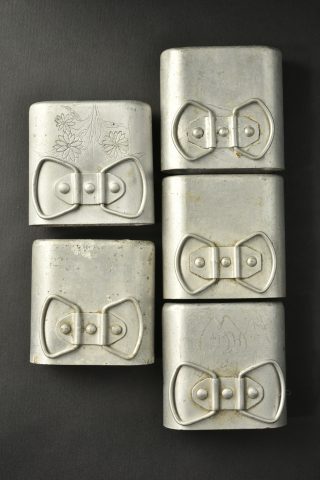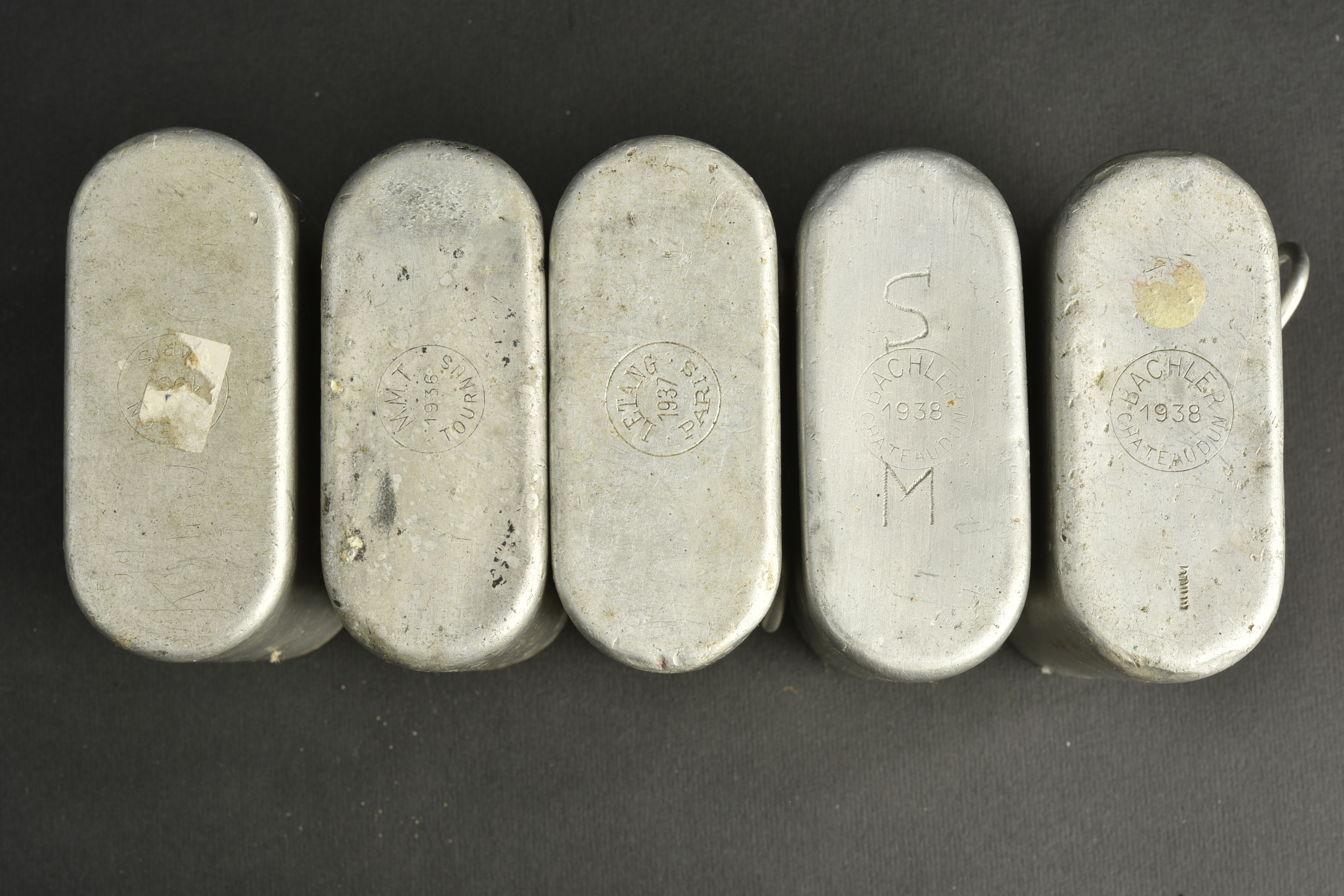Ensemble de quarts gravés 1935. Comprenant cinq quarts gravés modèle 1935 dont un du155ème RIF On ne passe pas avec un soldat fumant une cigarette, un du 306ème RI 1939-1940 avec des décors de vigne et de fleurs, un gravé d’une voiture et d’un fer à cheval et un autre difficileent lisible.