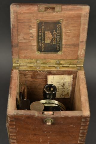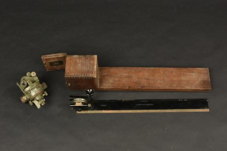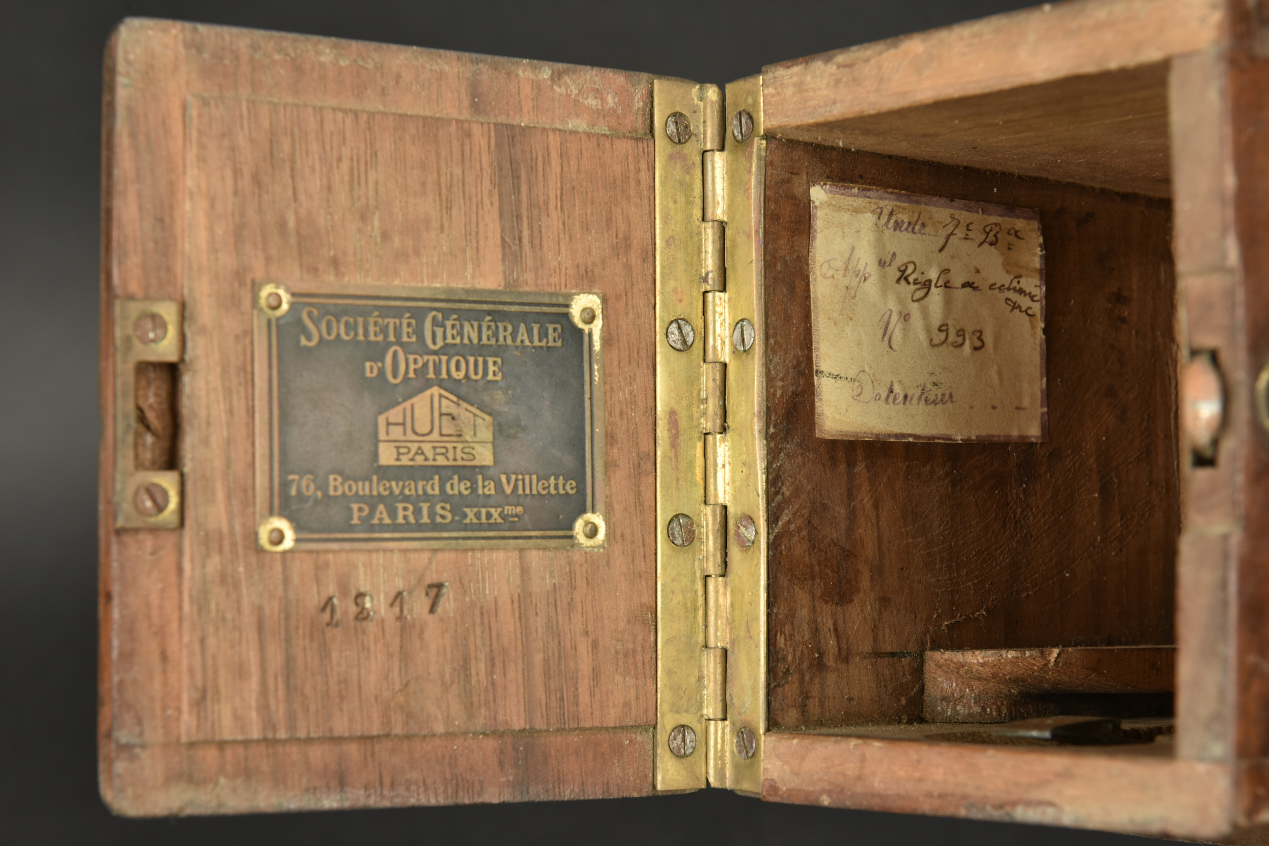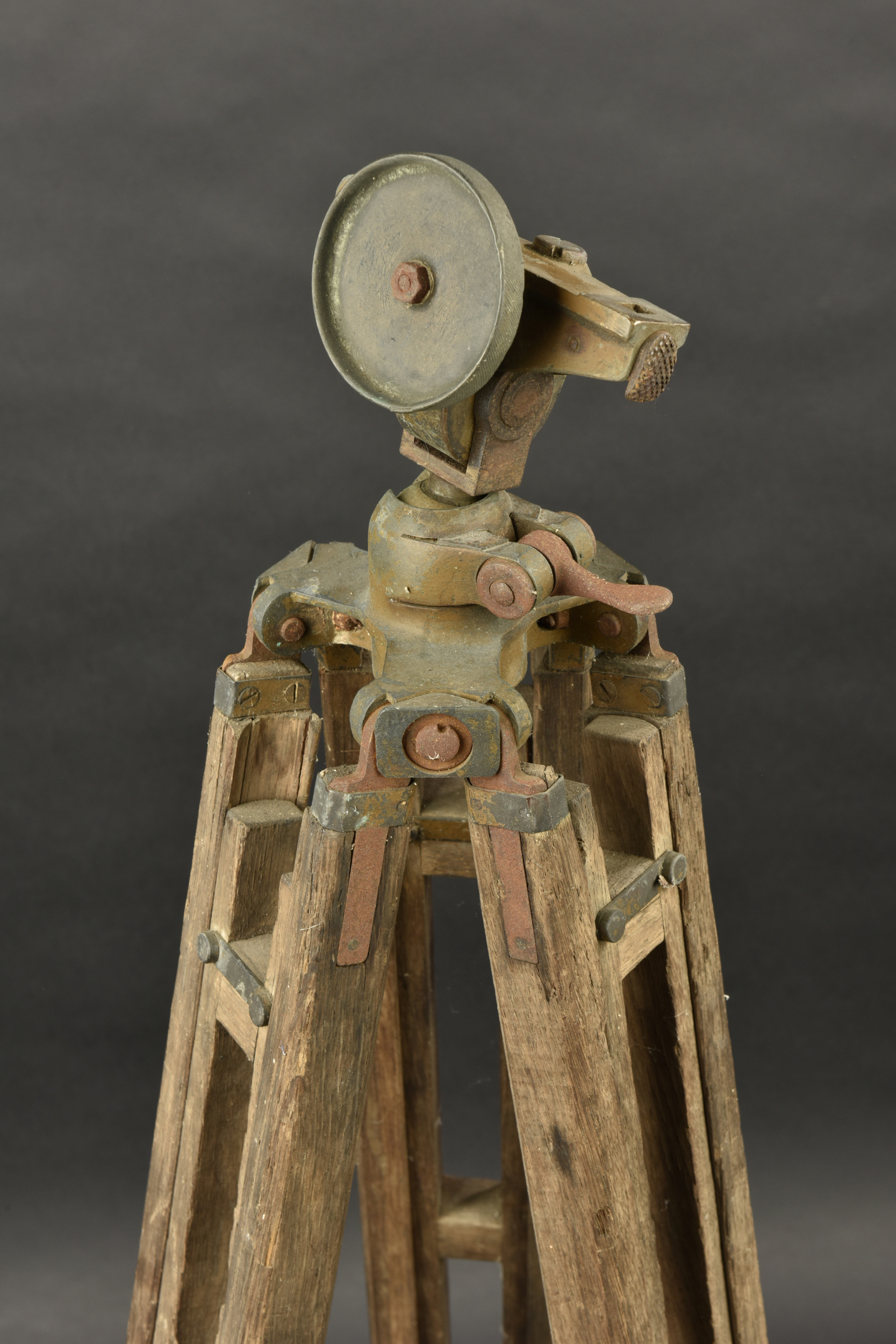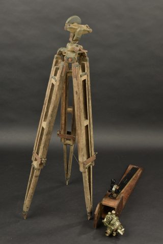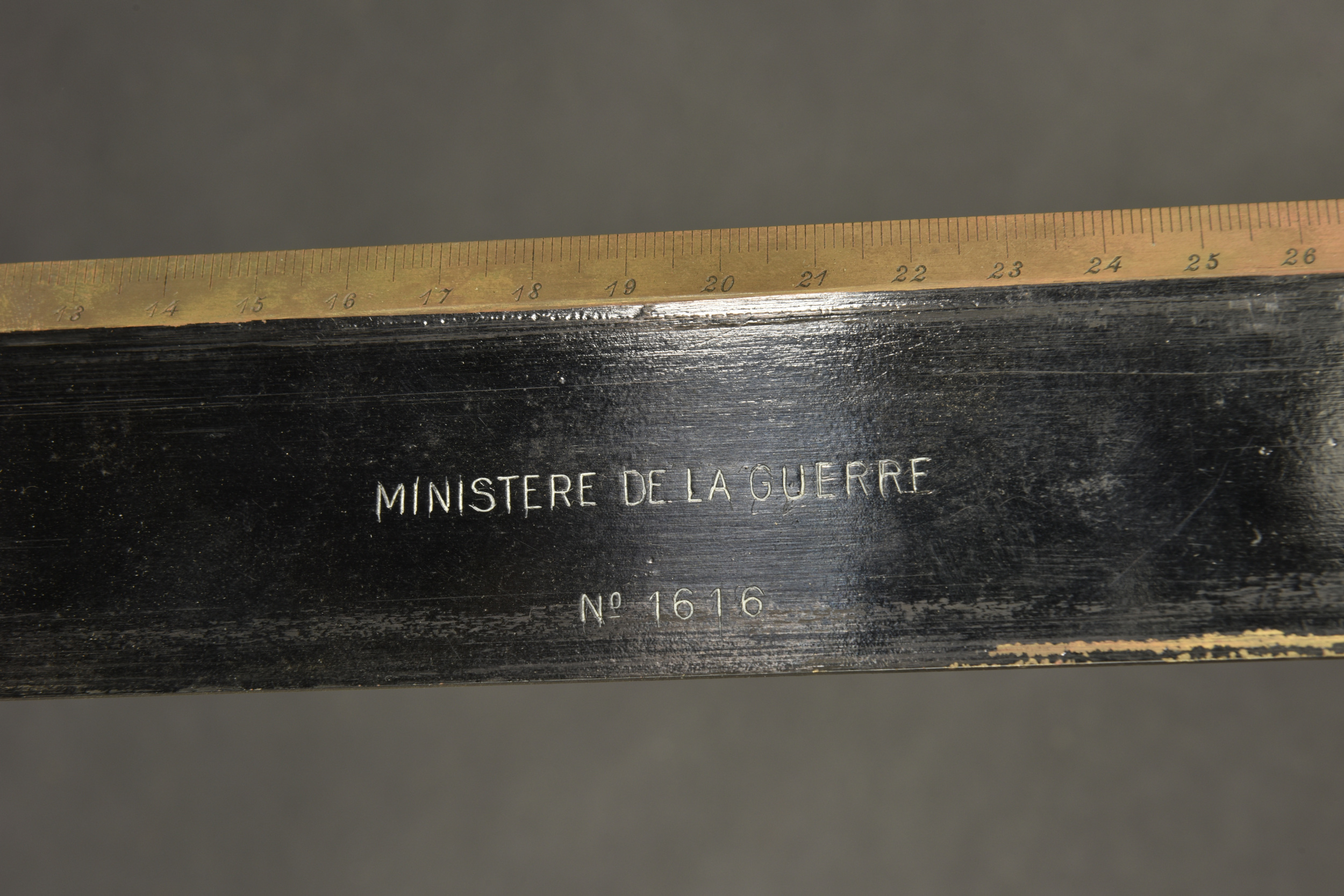 Ensemble de topographe. Comprenant le goniomètre boussole modèle 1916 portant les marquages Gaumont R35. Règle éclimètre à rallonge modèle 1931 bien marquée Ministère de la Guerre ,dans son étui de transport en bois d’origine portant la plaque du fabricant Huet. On y joint un trépied de télémètre modèle 1912,complet .
