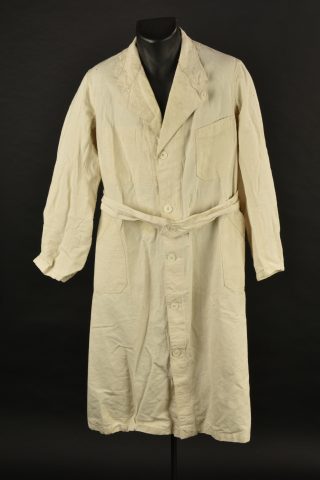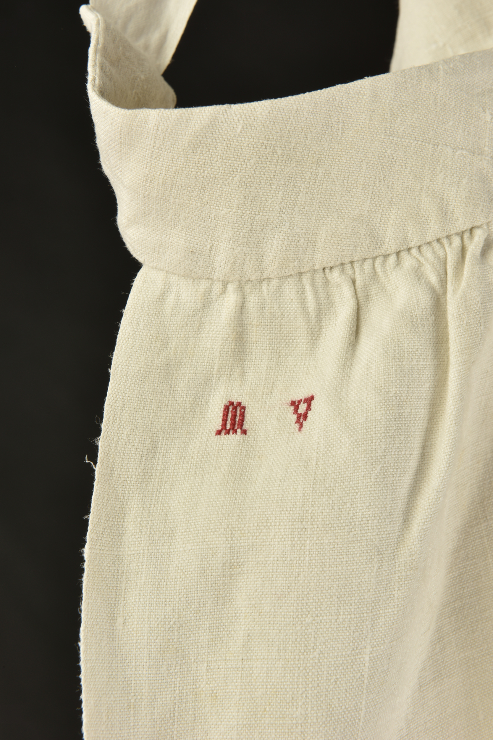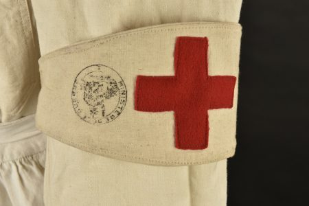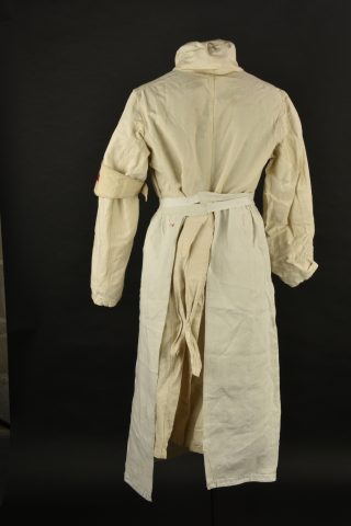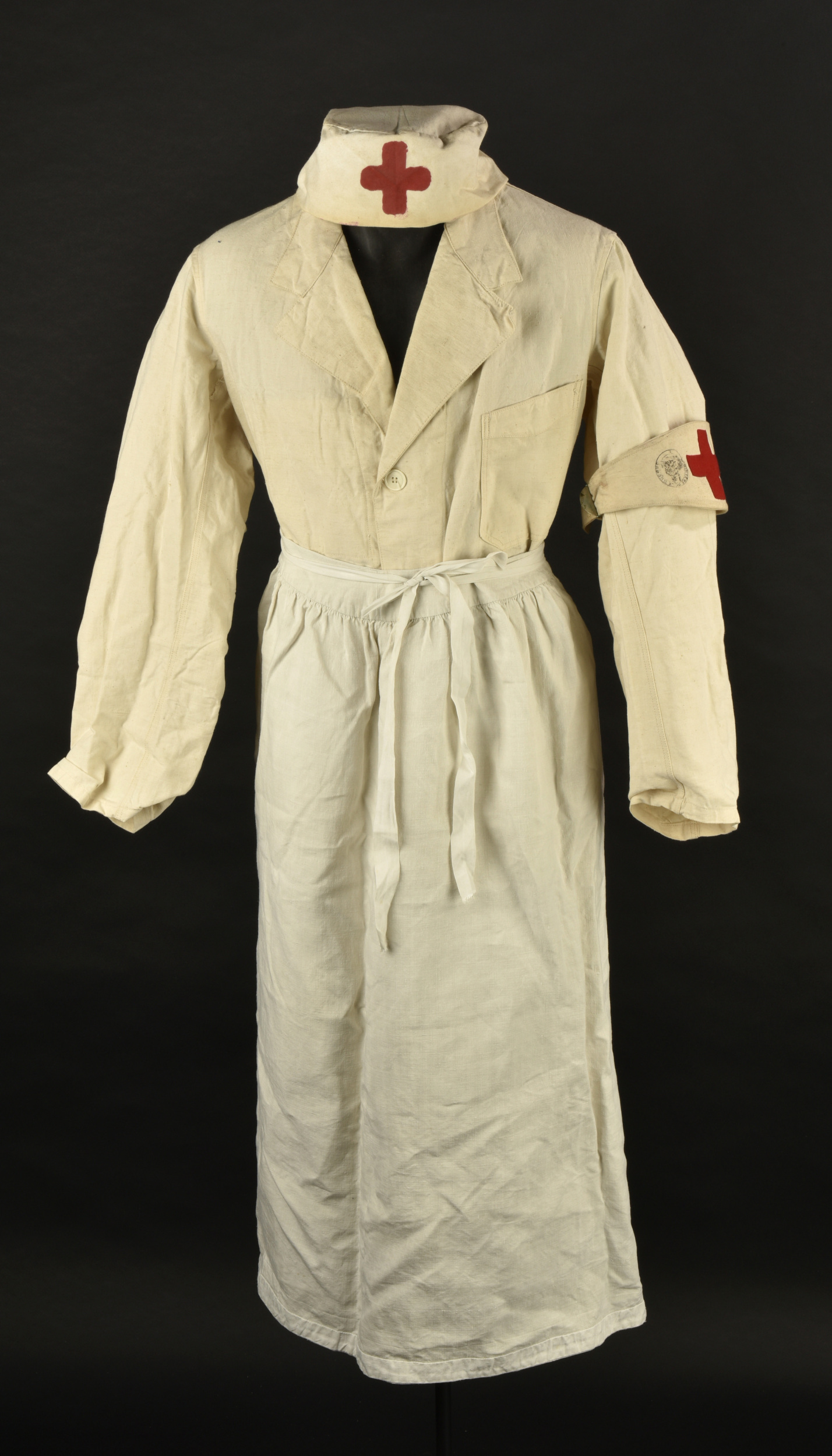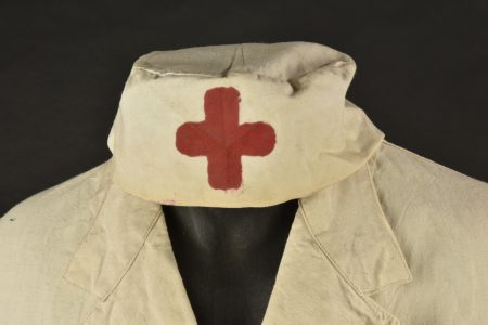 Ensemble d’infirmier. Comprenant sa coiffe avec l’insigne peint, un tablier en coton écru portant les initiales MV, sa blouse des hôpitaux militaires en toile écrue et un brassard du service de santé.