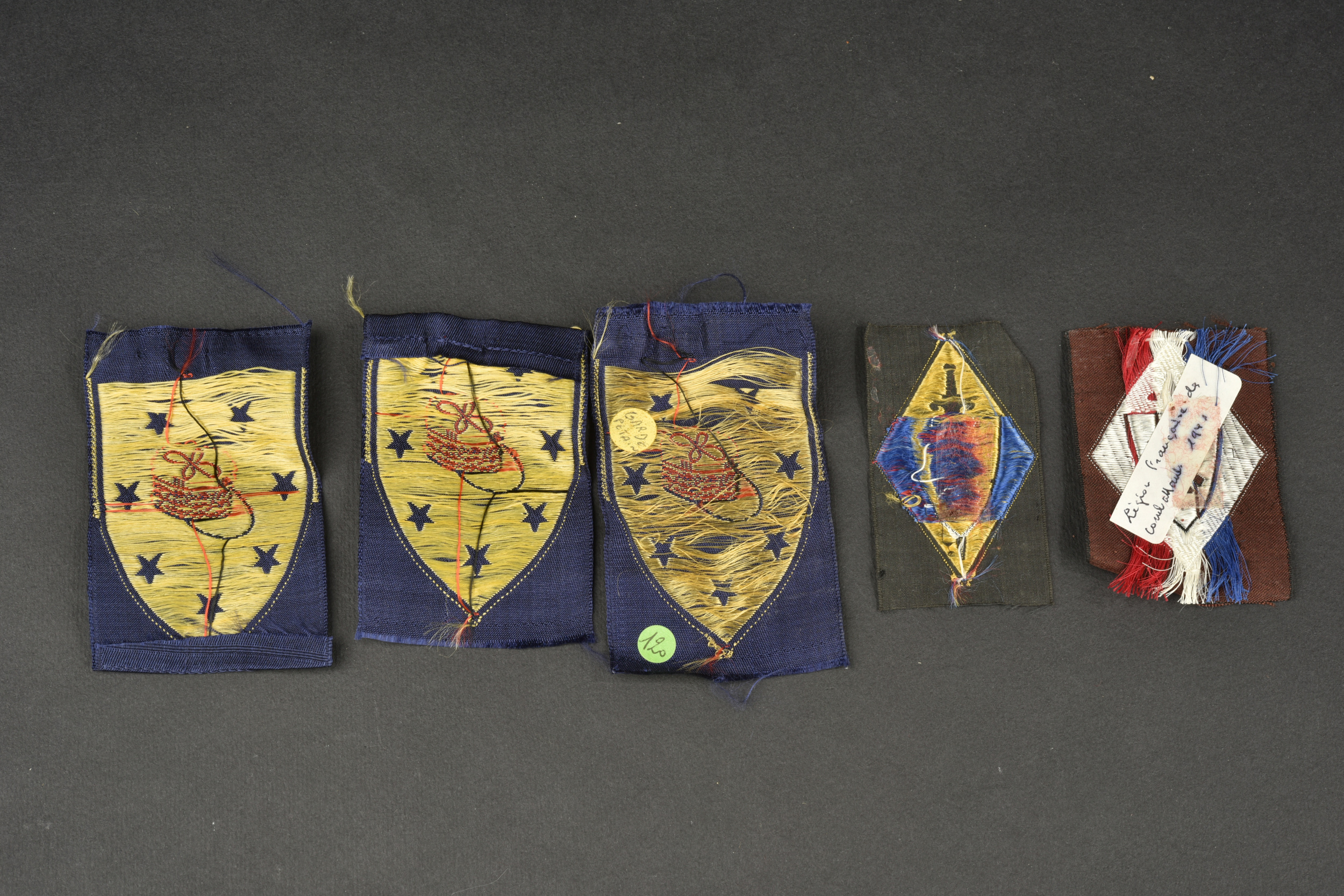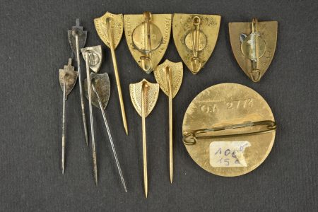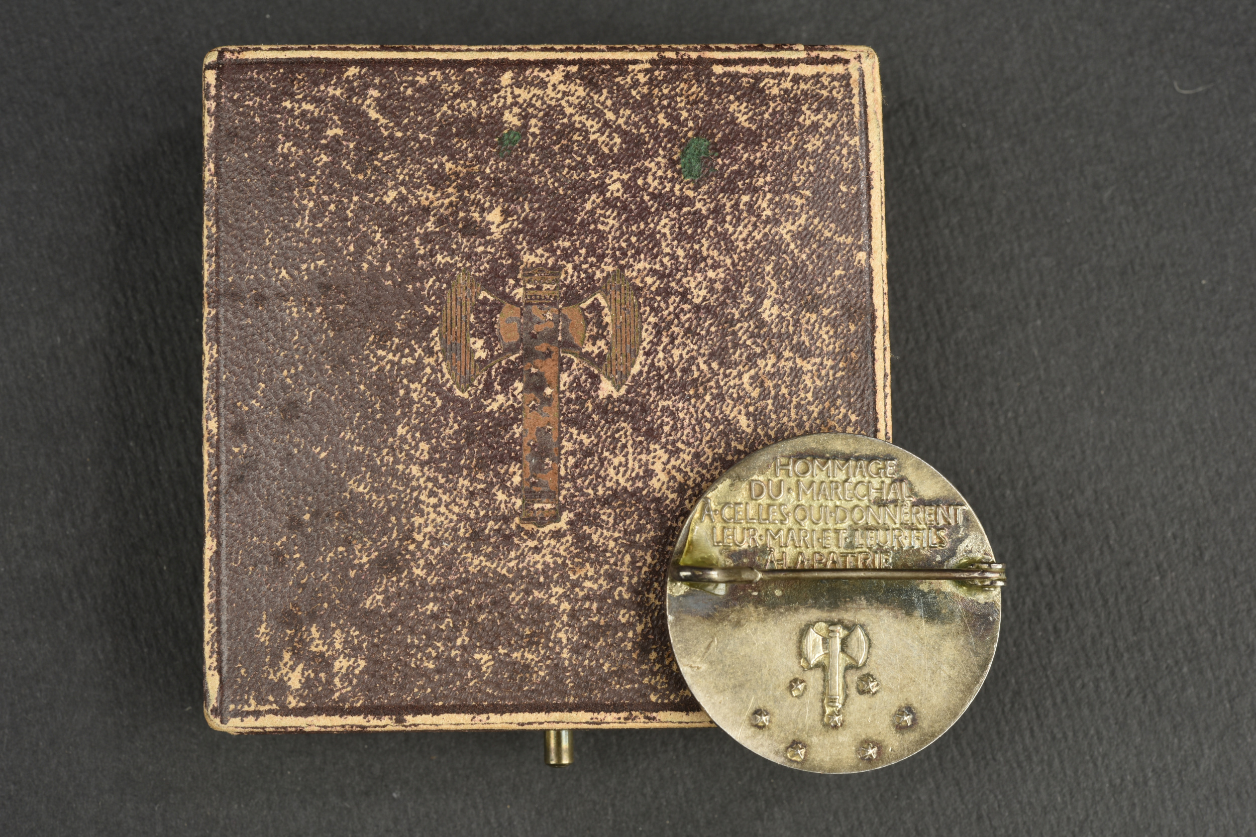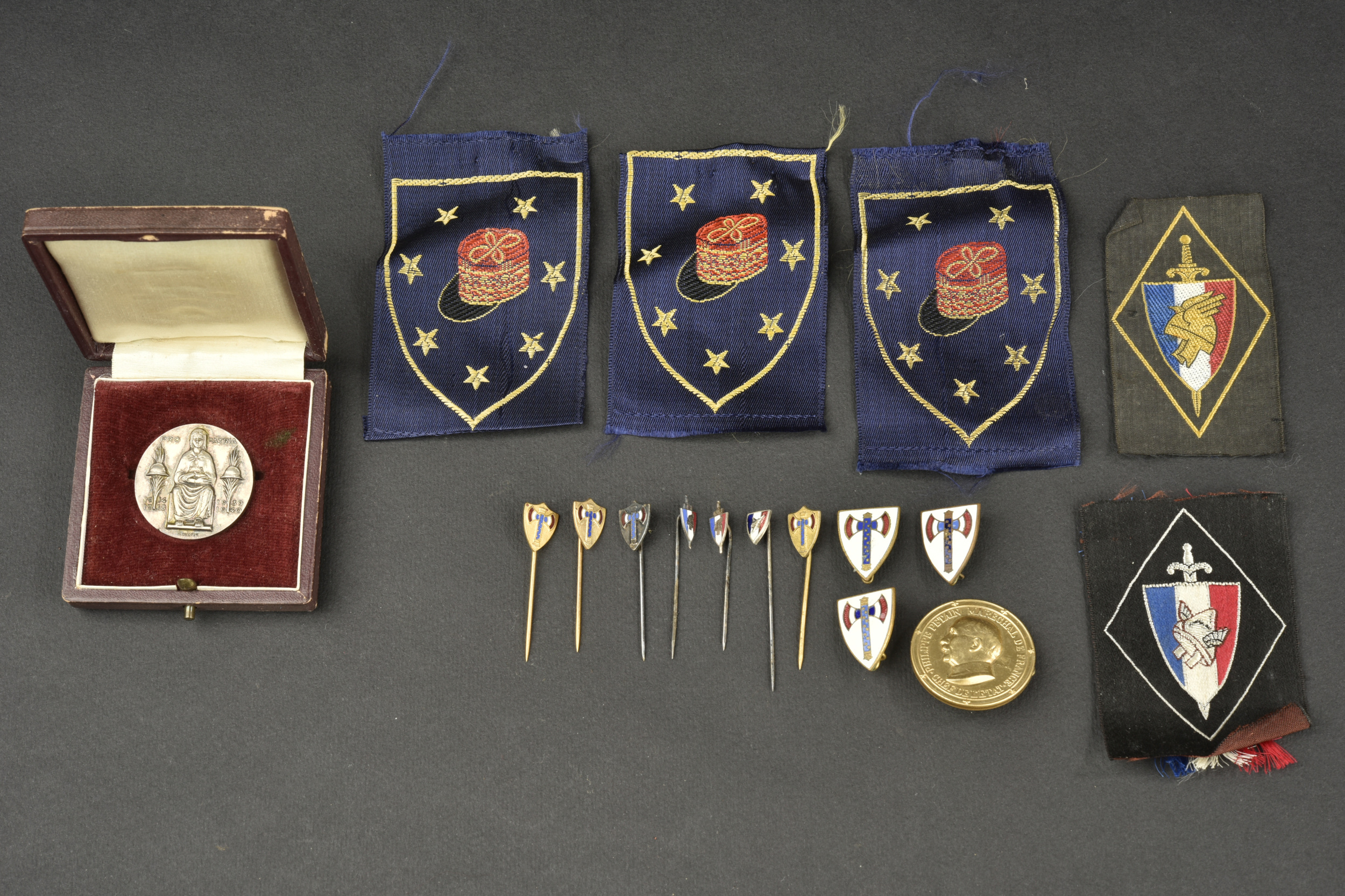 Ensemble d’insignes Vichy. Comprenant un insigne en argent dans son écrin recouvert de cuir fin frappé d’une francisque, on peut lire Pro Patria sur la face, par M . Dropsy, au revers se trouve le texte Hommage du Maréchal à celles qui donnèrent leur maris et leurs fils à la patrie. Trois insignes tissu, trois épingles de cravate de propagande, trois épingles de cravate LFC, trois insignes émaillés de propagande, une broche à l’effigie du Maréchal par Cogné et deux inisgnes tissus LFC.