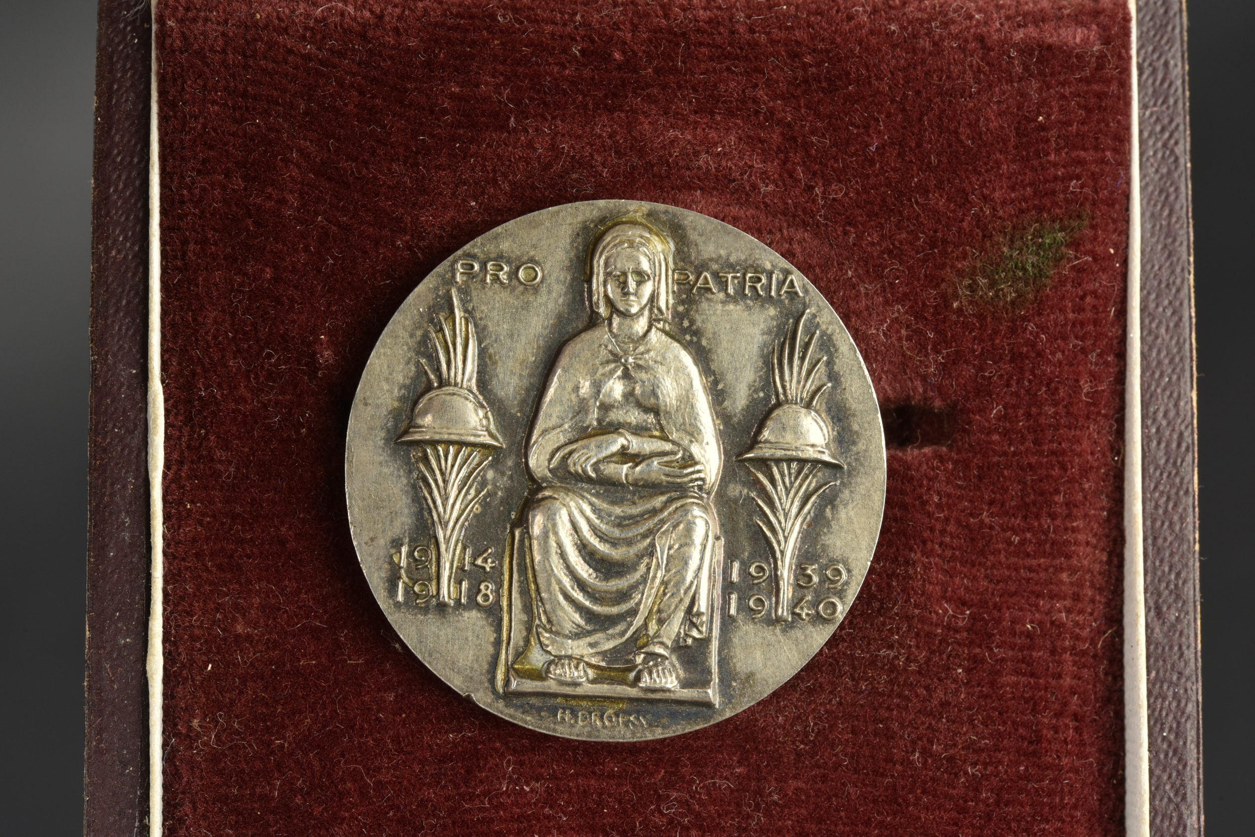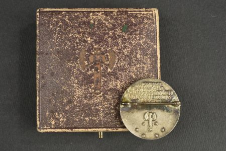 Détails de la vente >Ensemble d’insignes Vichy. Comprenant un insigne en argent dans son écrin recouvert de cuir fin frappé d’une francisque, on peut lire Pro Patria sur la face, par M . Dropsy, au... en savoir plus