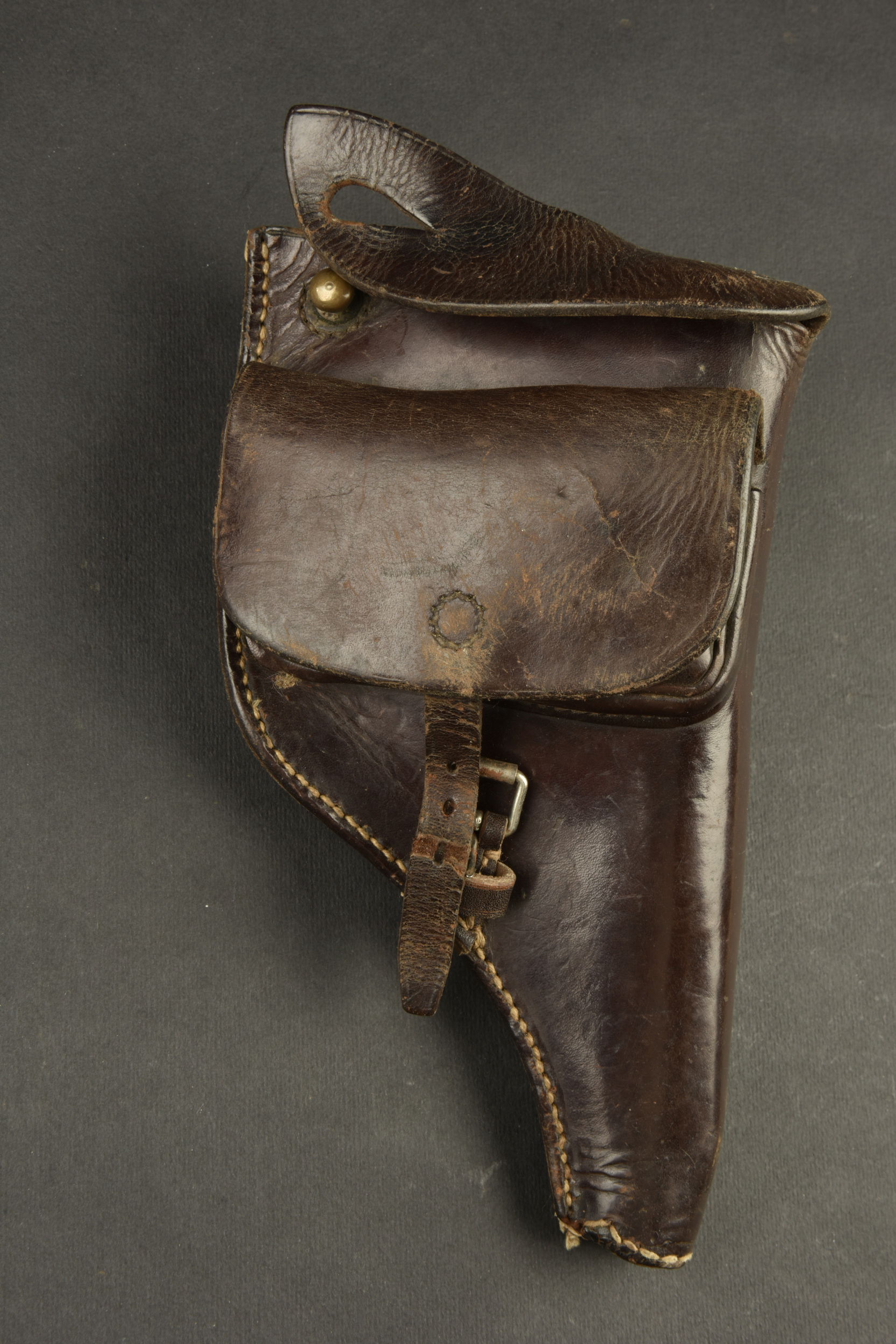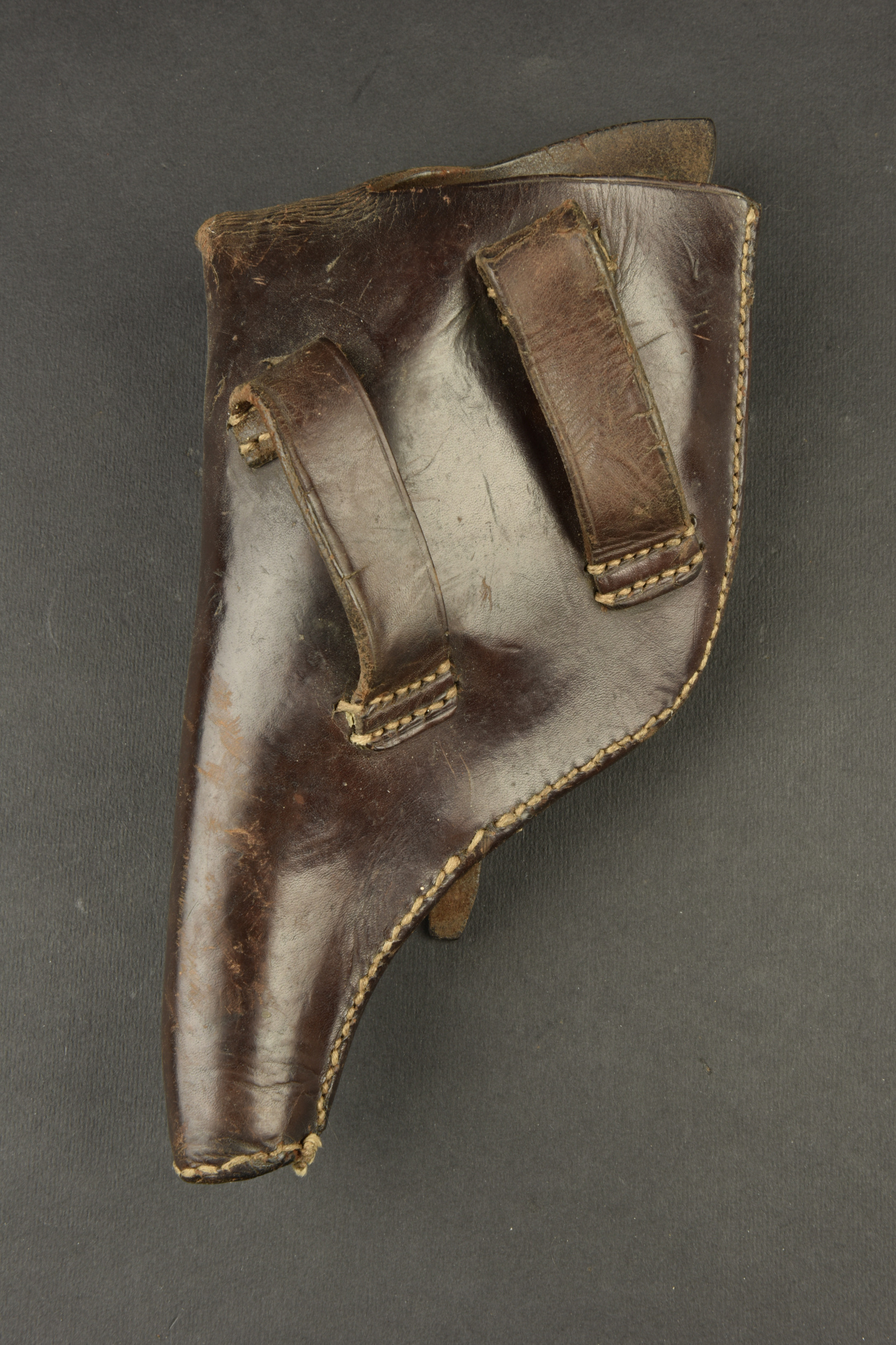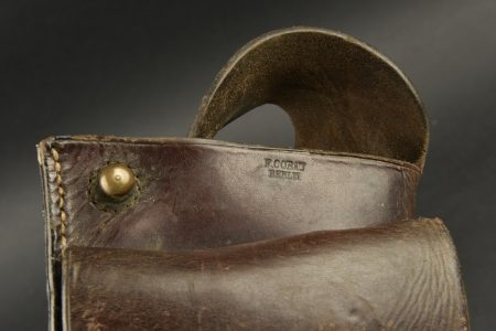 Détails de la vente >Etui cuir pour Reichsrevolver M1883. Bel étui en cuir marron, marqué du fabricant F. COBAU de BERLIN. Têton de fermeture laiton, poche à cartouche, boucle à ardillon nickelée. Bon état