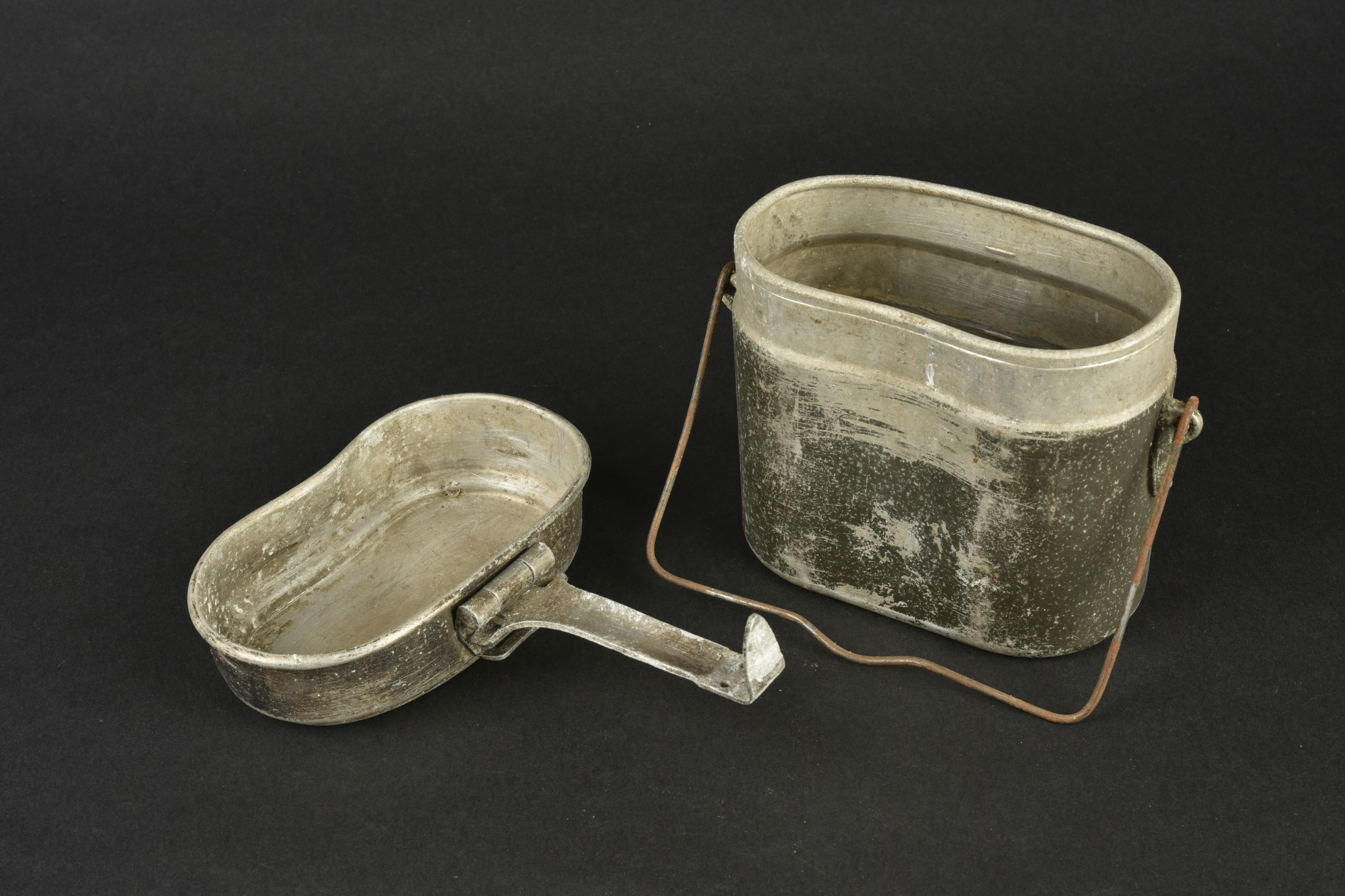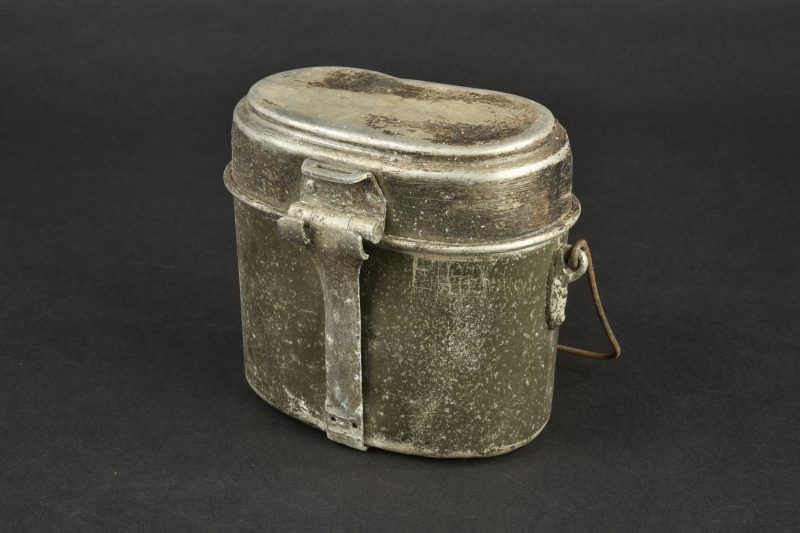 Gamelle allemande. En aluminium. La poignée de transport est présente, mais oxydée. Peinture Feldgrau à 40%. Les marquages sont illisibles. A noter une certaine usure et patine de la pièce. Etat II+.