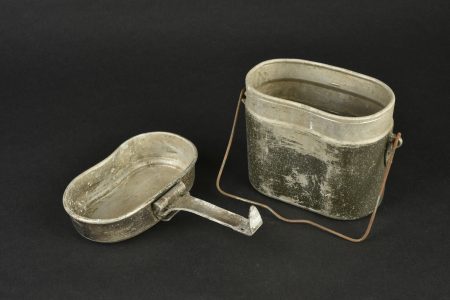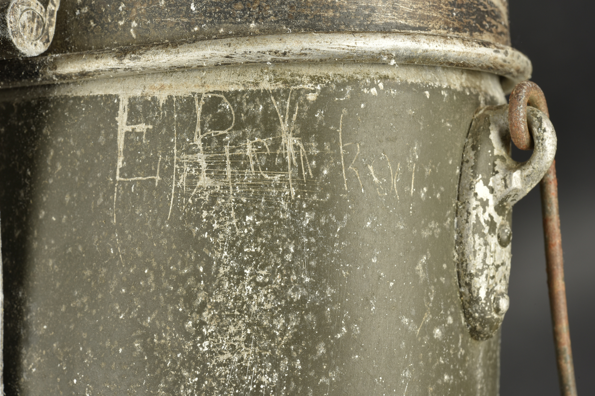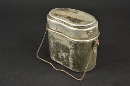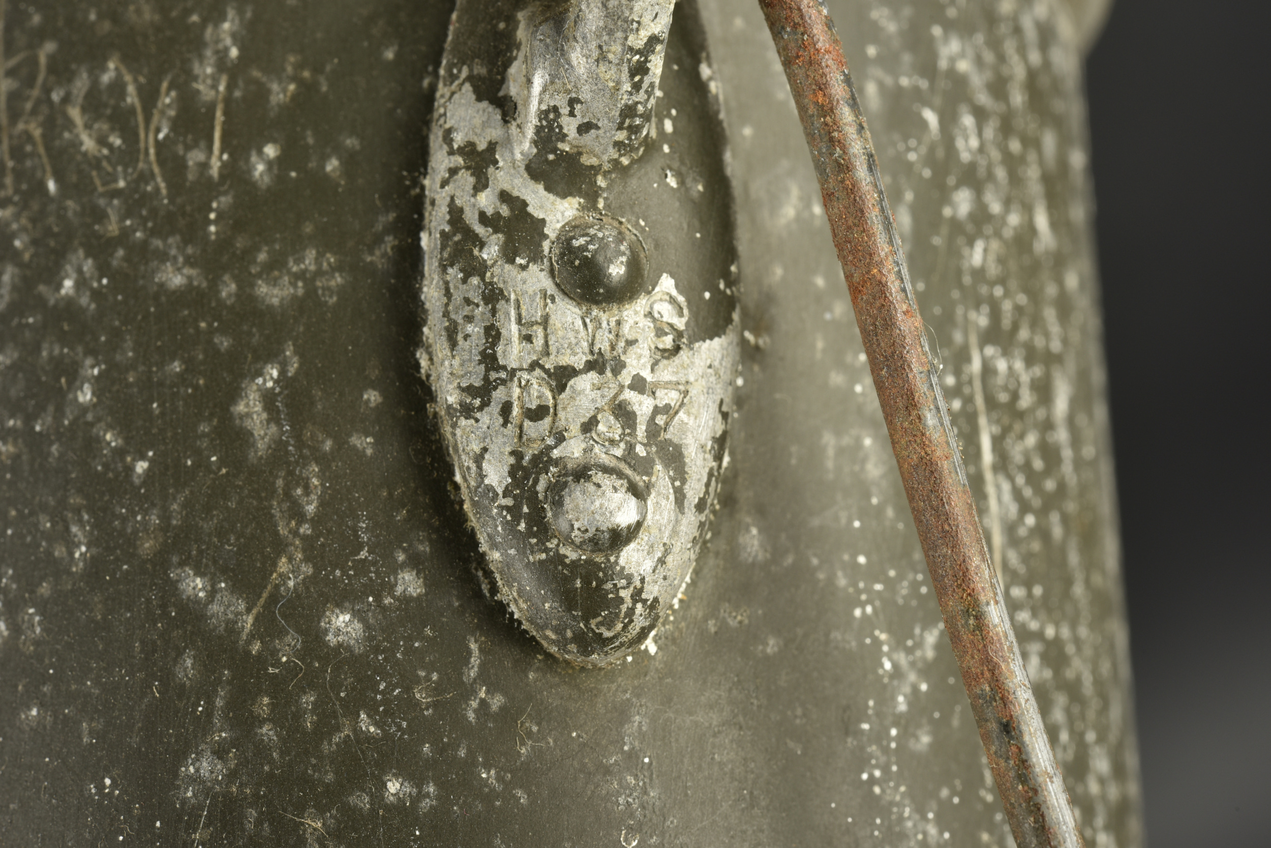 Détails de la vente >Gamelle allemande. En aluminium. La poignée de transport est présente, mais oxydée. Peinture Feldgrau à 40%. Les marquages sont illisibles. A noter une certaine usure et patine de la pièce.... en savoir plus