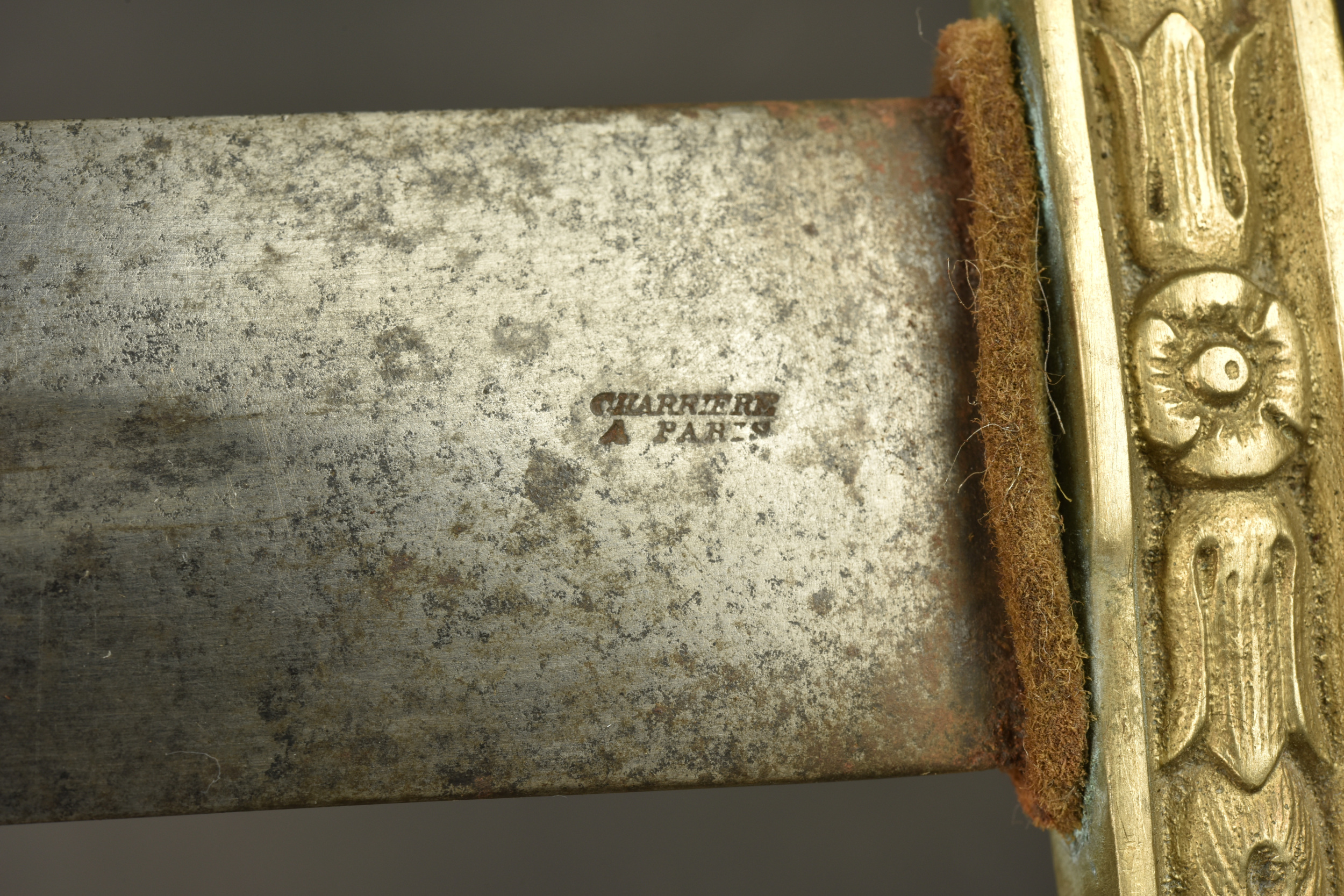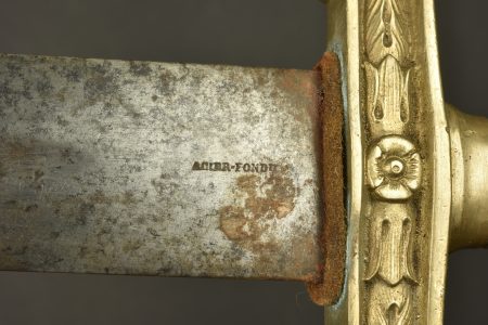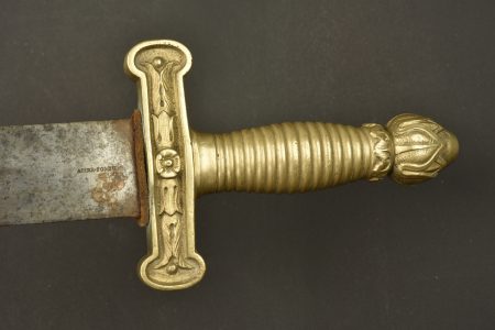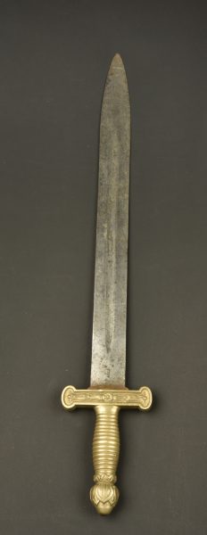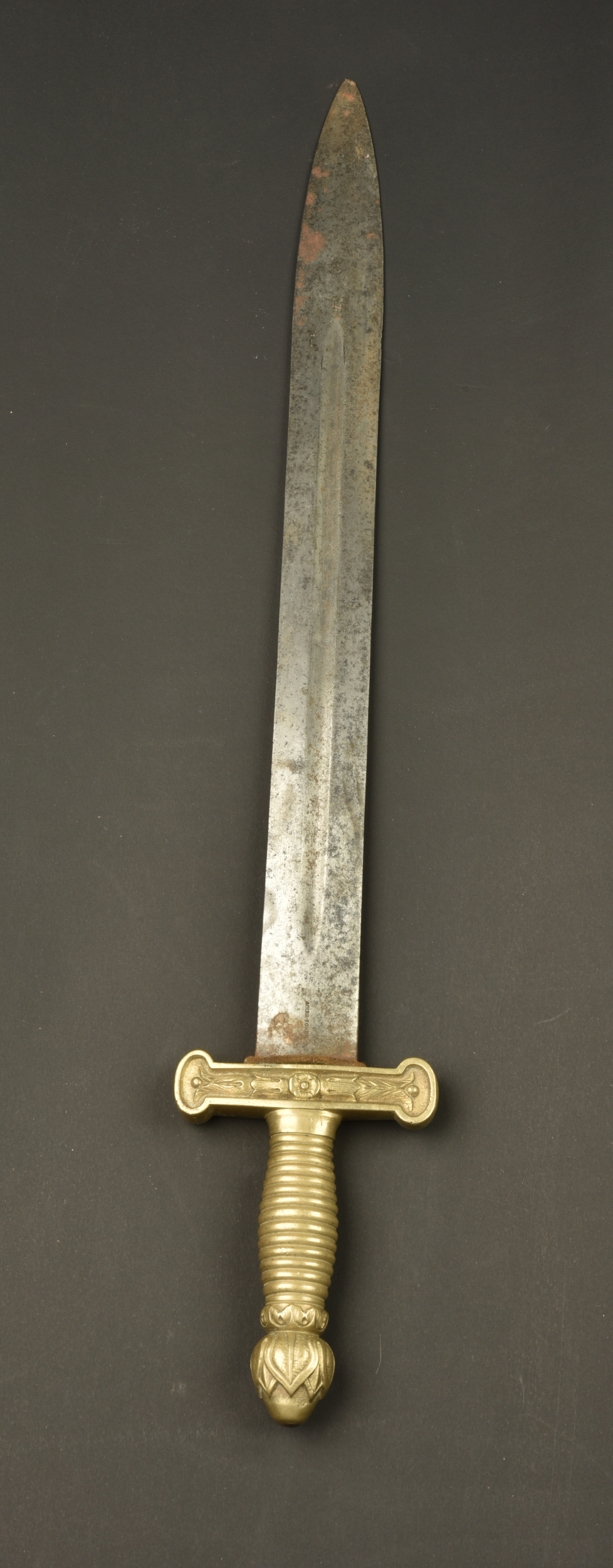 Glaive M1847 de la Garde Civique Pontificale. Glaive à lame de 48,3 cm de long, à double tranchant, marquée d’un côté du fabricant Charrière à Paris et de l’autre côté Acier Fondu. Traces d’oxydation. Poignée en laiton moulée, striée avec décors de feuilles d’acanthe. Sans fourreau.