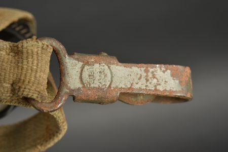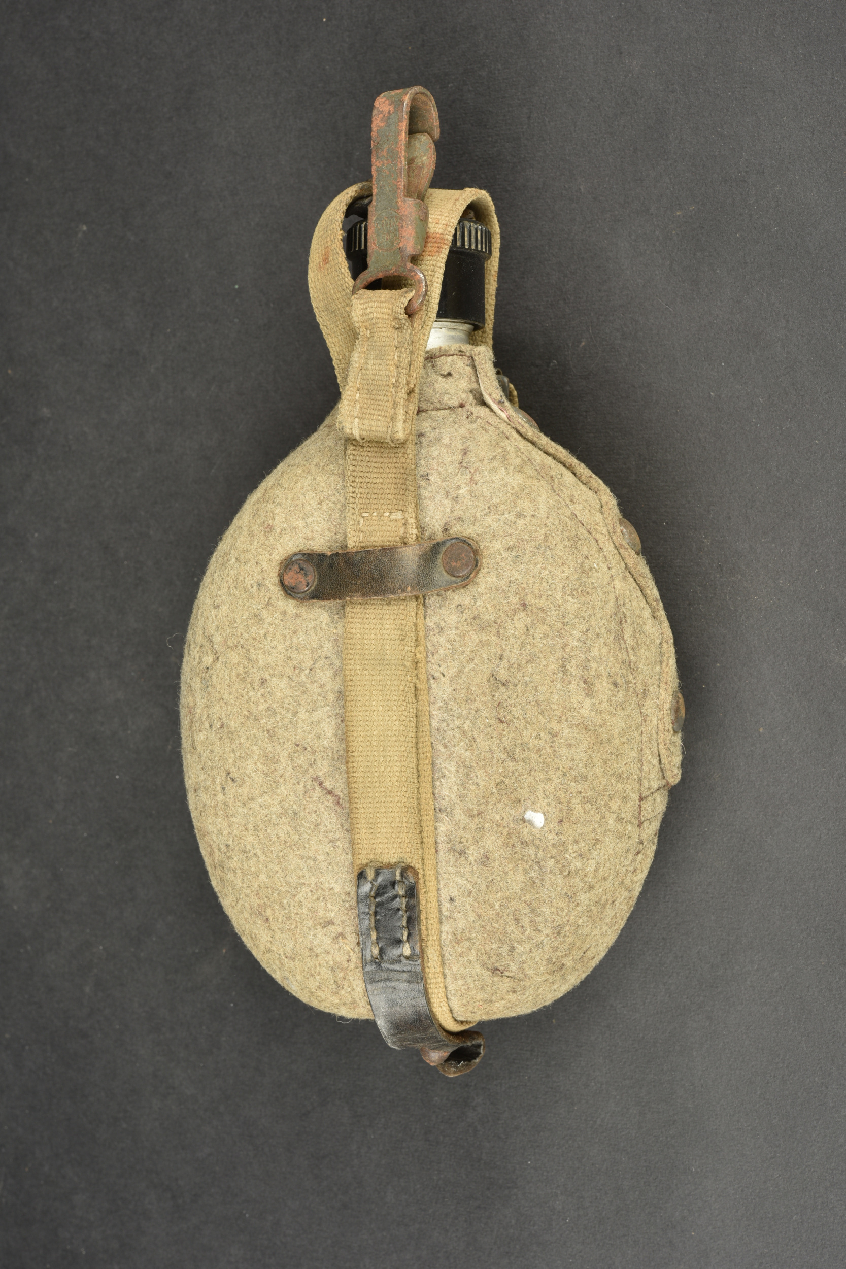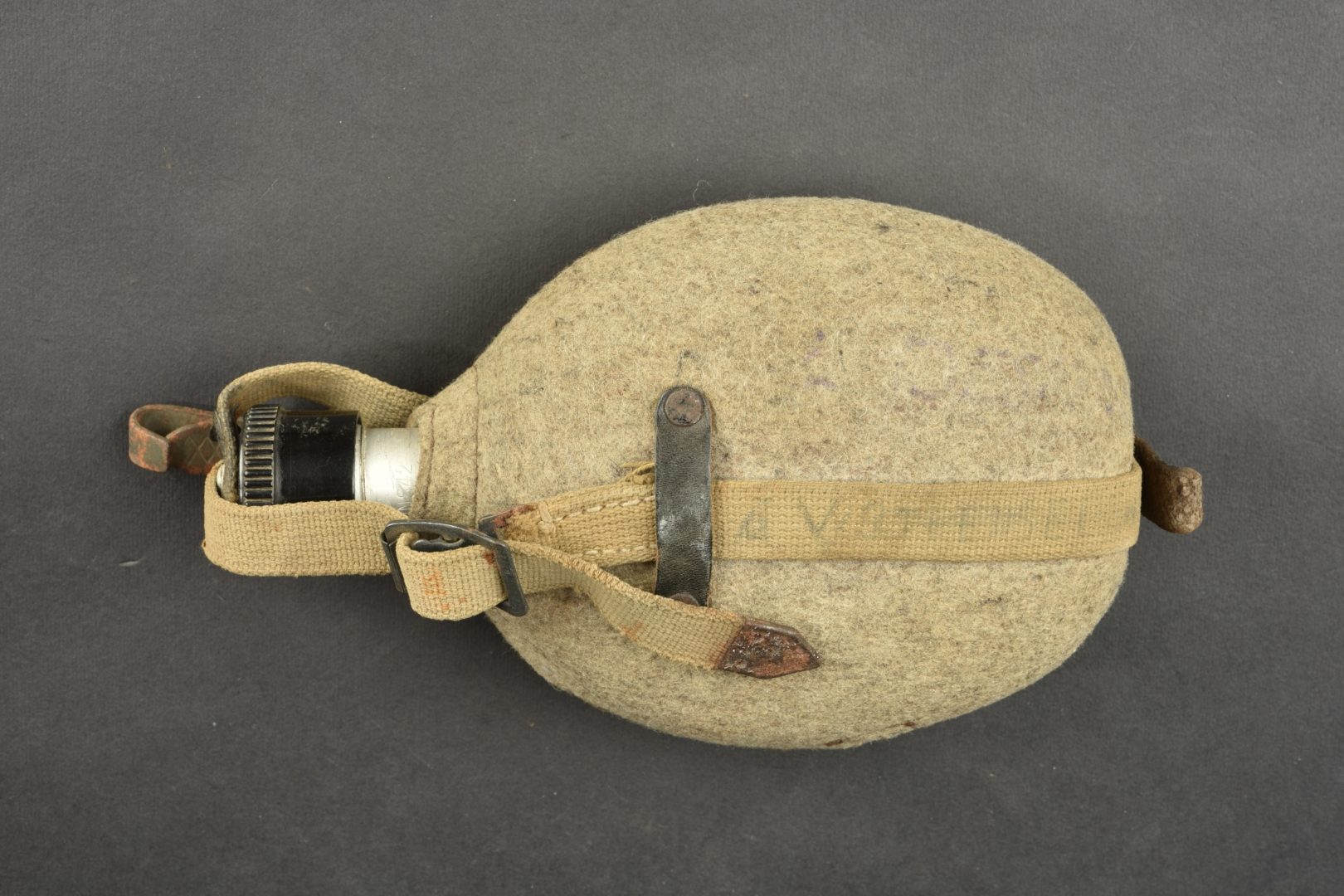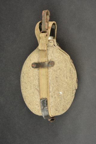 Détails de la vente >Gourde allemande. En aluminium, fabrication VDNS 42. Housse en feutrine présentant quelques trous de mite. Les boutons pressions sont fonctionnels. Quart absent. Harnais en toile complet. A noter... en savoir plus