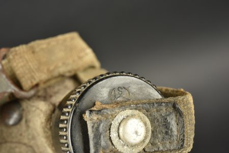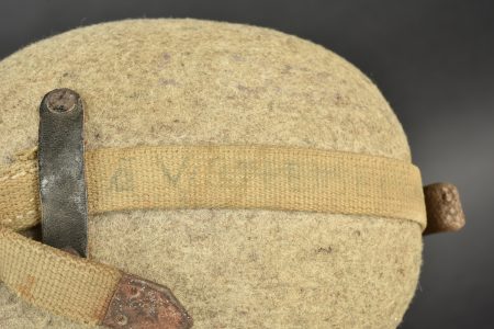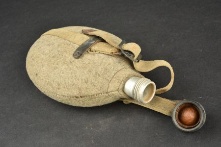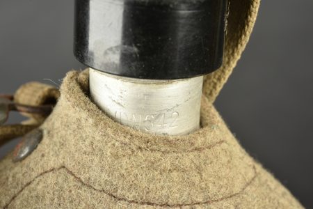 Gourde allemande. En aluminium, fabrication VDNS 42. Housse en feutrine présentant quelques trous de mite. Les boutons pressions sont fonctionnels. Quart absent. Harnais en toile complet. A noter une certaine usure et patine de la pièce. Etat II+.