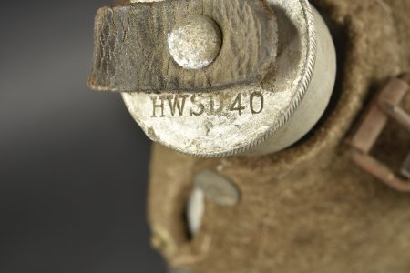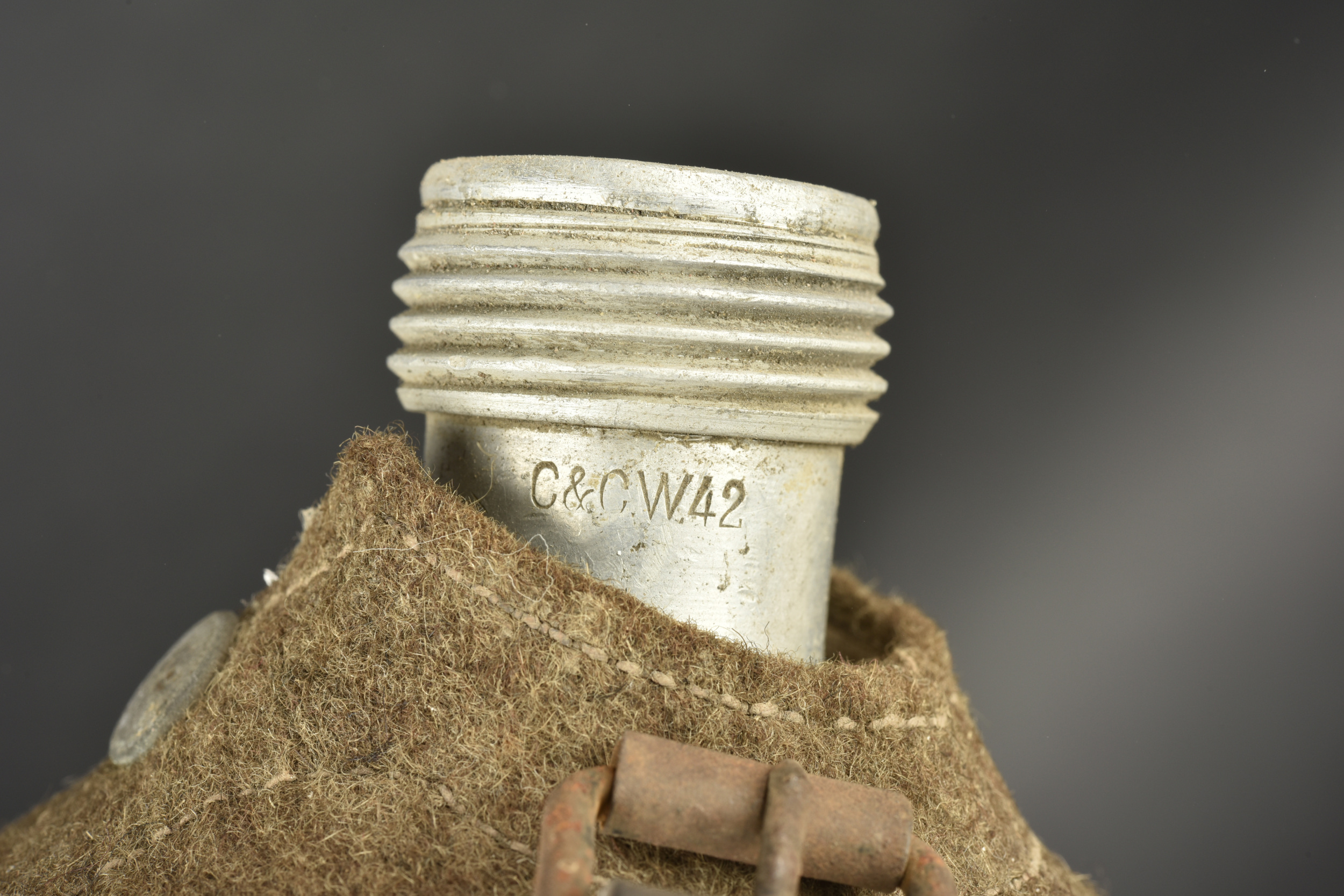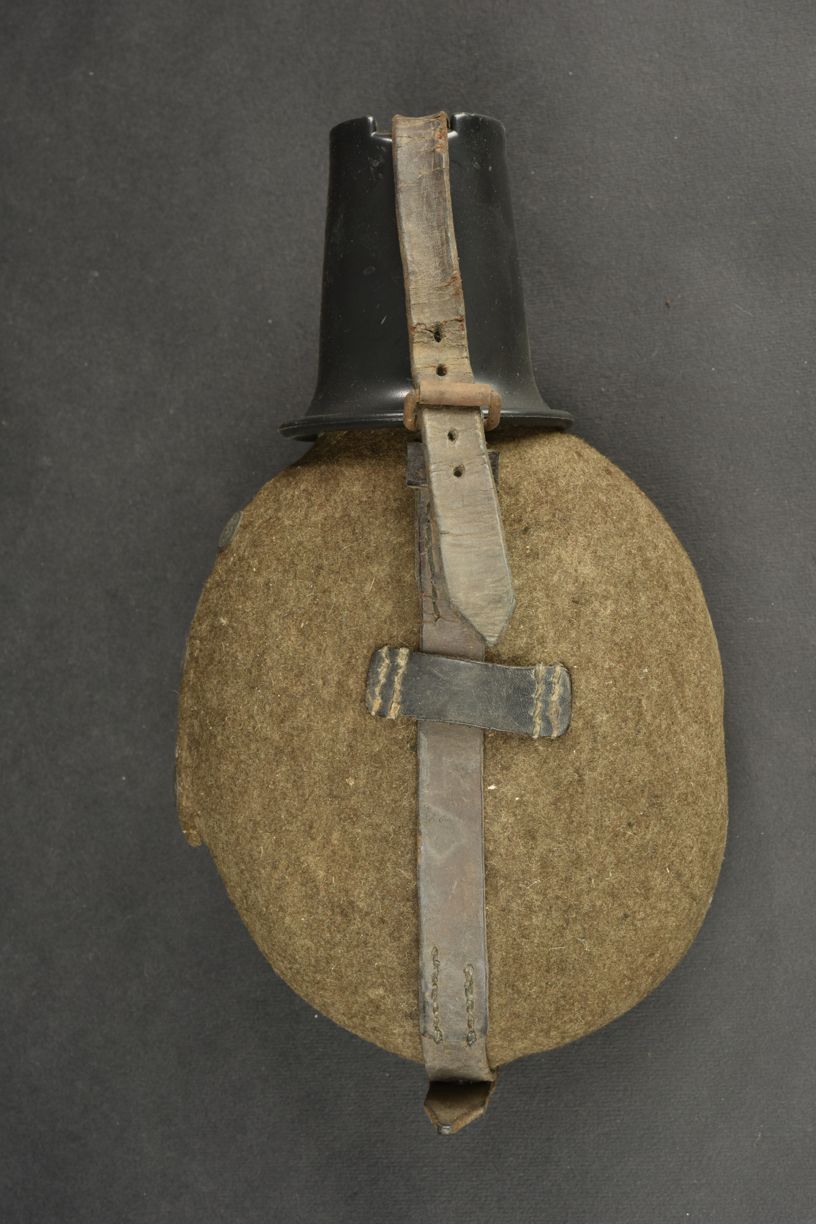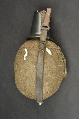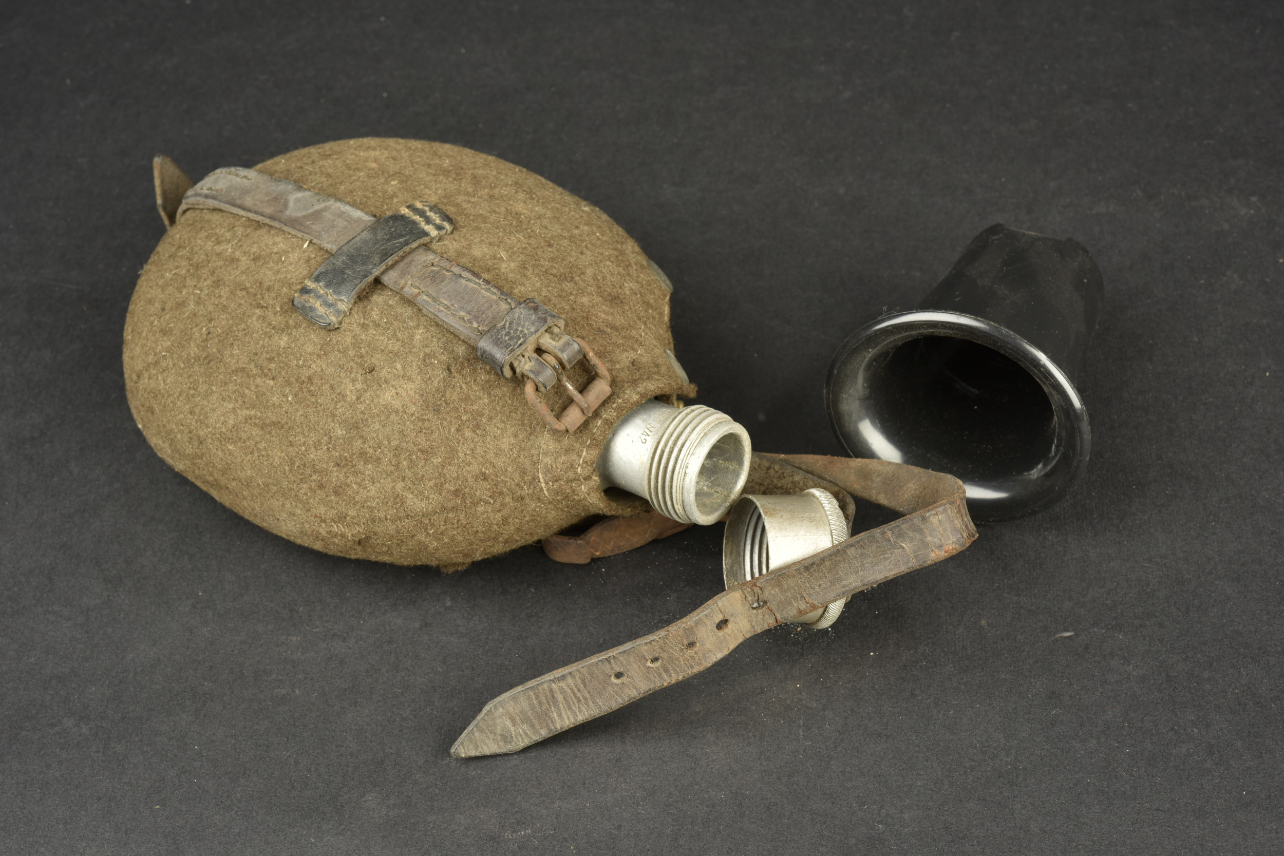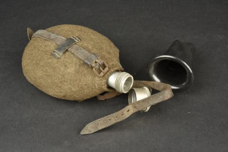 Détails de la vente >Gourde allemande. Gourde en aluminium, fabrication CCW42. Housse en feutrine présentant des traces de mite. Harnais en cuir complet, partiellement décousu. Quart en bakélite noire. A noter une... en savoir plus