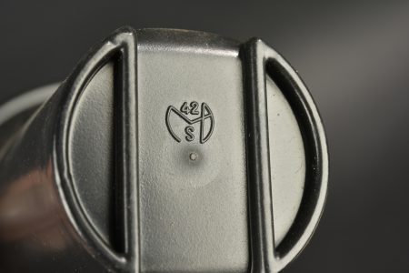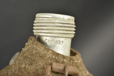 Gourde allemande. Gourde en aluminium, fabrication CCW42. Housse en feutrine présentant des traces de mite. Harnais en cuir complet, partiellement décousu. Quart en bakélite noire. A noter une certaine usure et patine de la pièce. Etat II+.