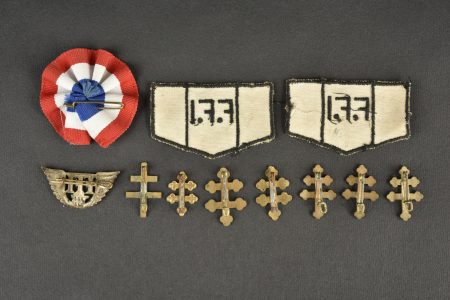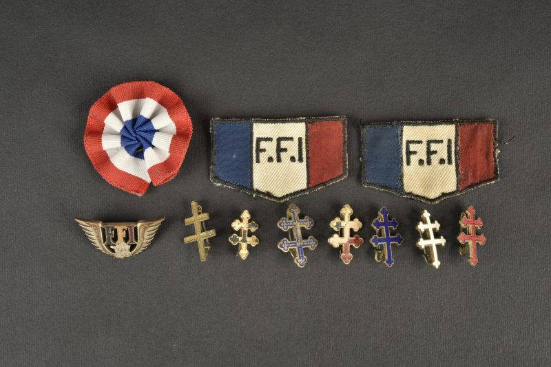 Insignes FFI. Comprenant deux insignes en tissu bleu/blanc/rouge et marqués FFI. Une cocarde bleu/blanc/rouge, attache complète. Un insigne en métal FFI, attache complète. Sept modèles différents de croix de Lorraine en métal, attaches complètes. A noter une certaine usure et patine des pièces. Etat II+.