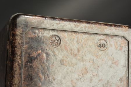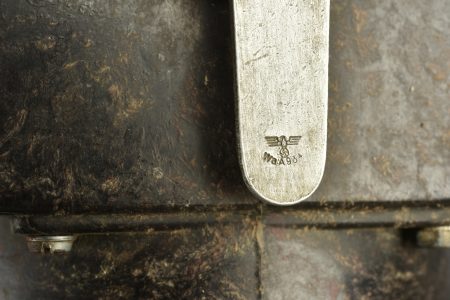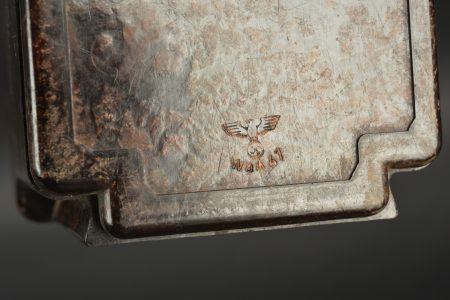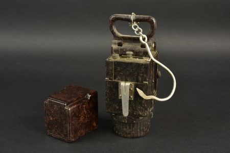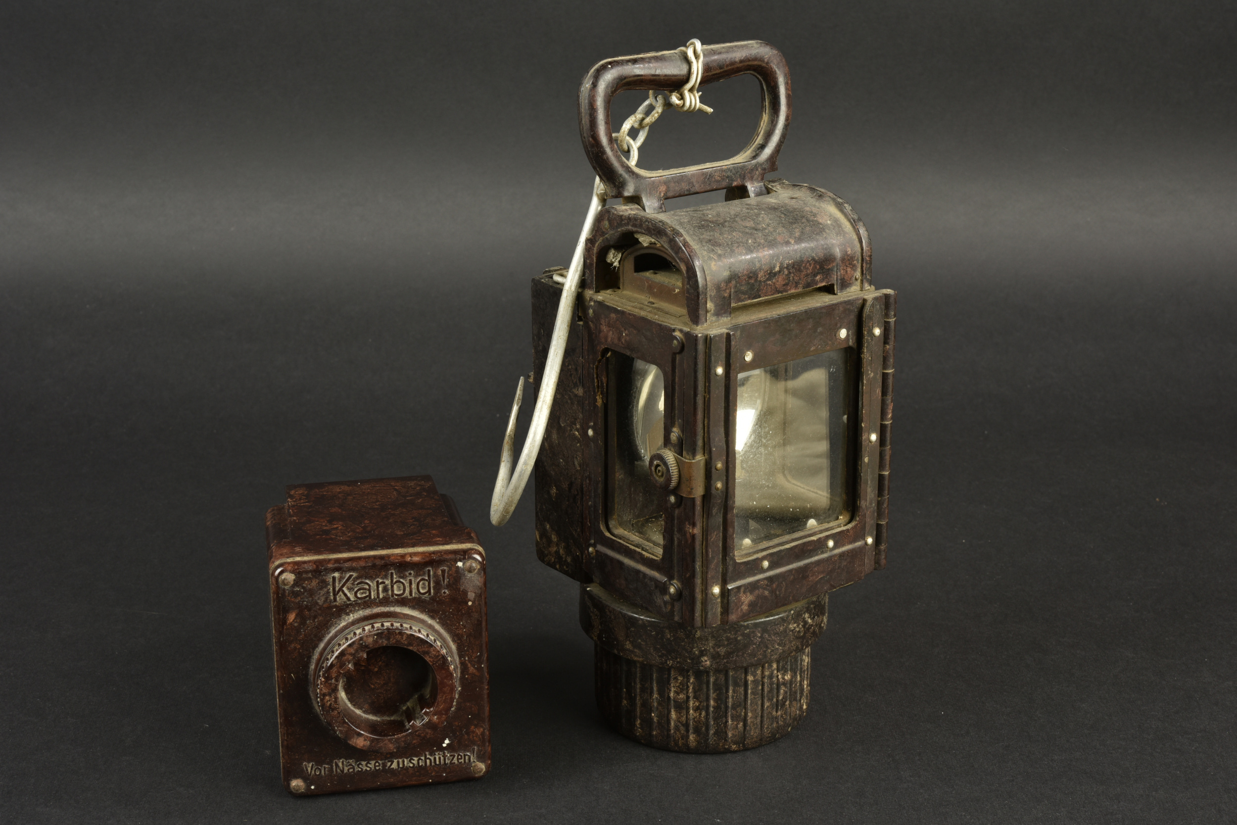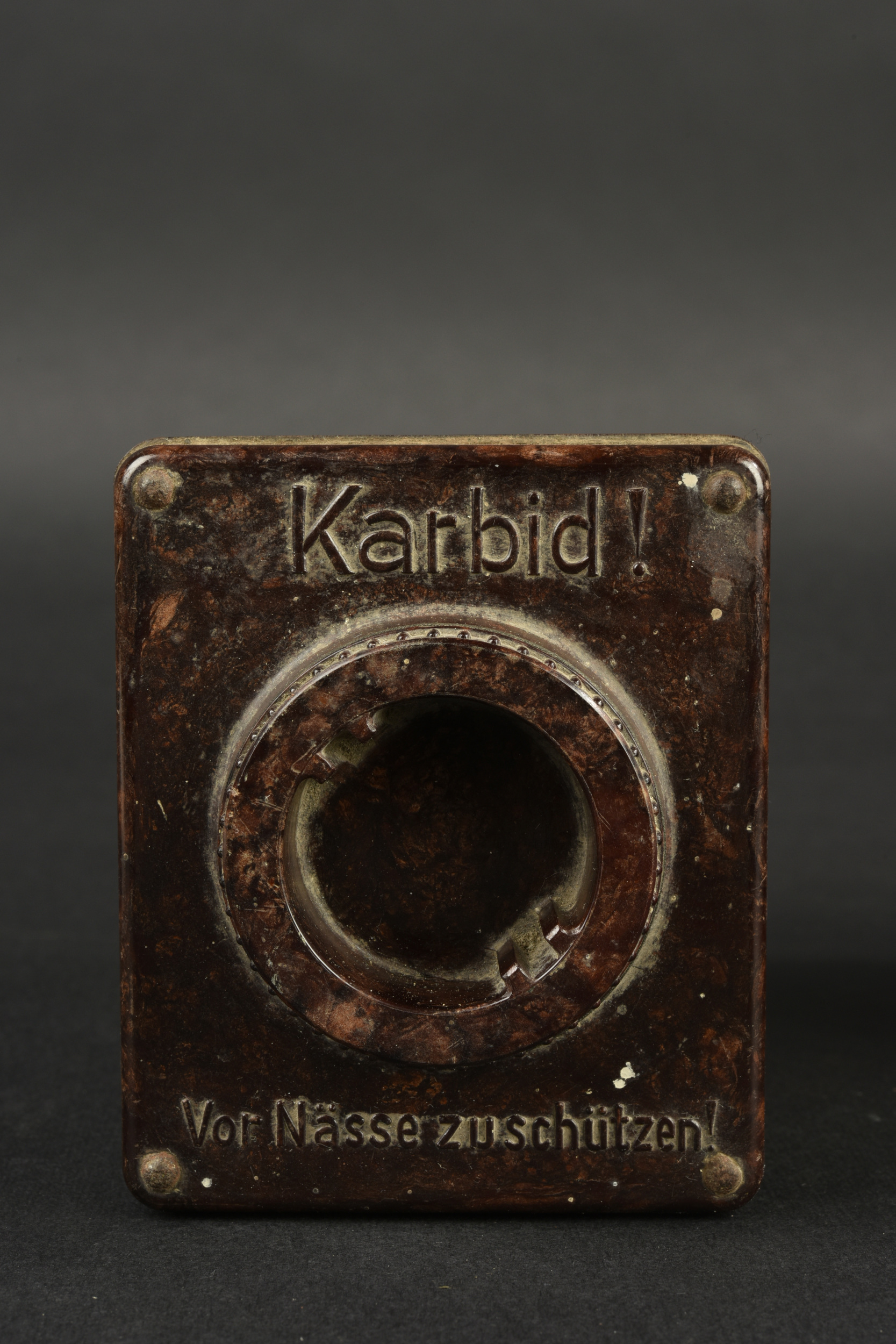 Lanterne à carbure allemande. En bakélite. La poignée de transport est présente, ainsi que le crochet de fixation au plafond. Les verres de protection sont complets. Le crochet arrière dispose d’un bel aigle Waa. Les accessoires sont manquants. On y joint un filtre à carbure en bakélite, marqué Karbid. A noter une certaine usure et patine de la pièce. Etat II+.
