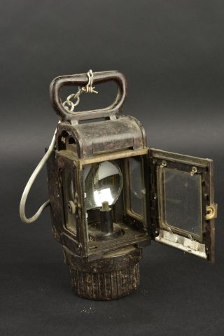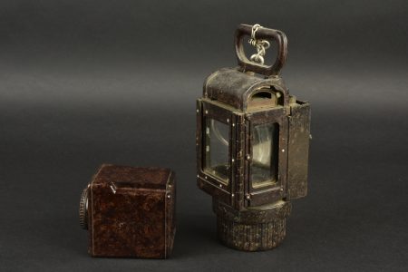 Détails de la vente >Lanterne à carbure allemande. En bakélite. La poignée de transport est présente, ainsi que le crochet de fixation au plafond. Les verres de protection sont complets. Le crochet arrière... en savoir plus