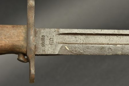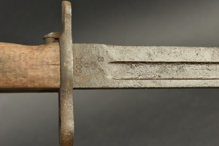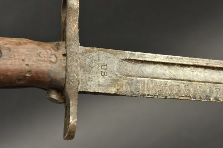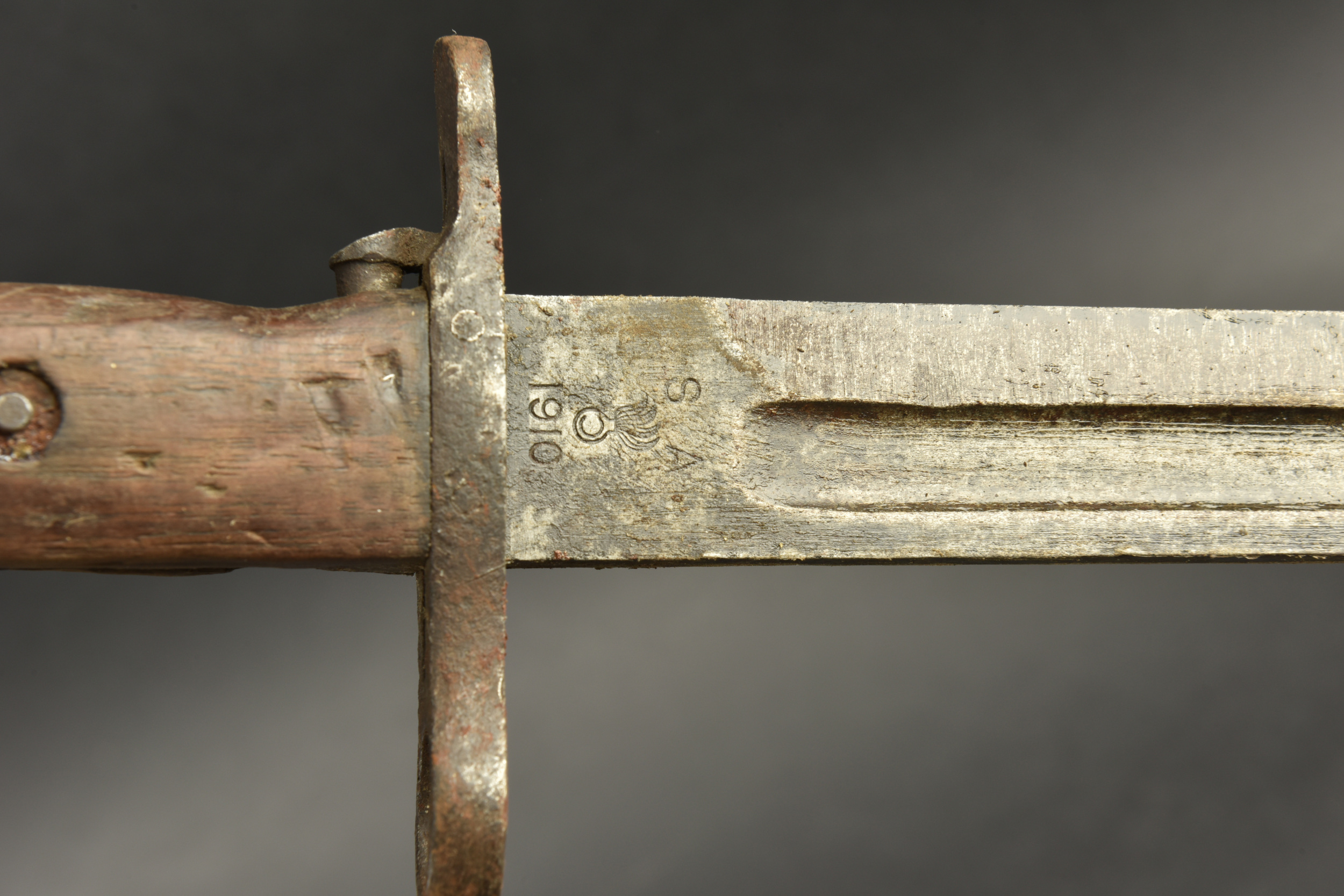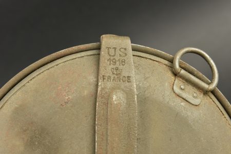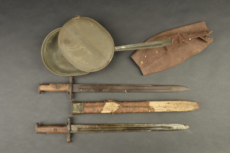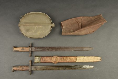 Lot baïonnettes et équipement US 1917. composé d’une baïonnette Springfield en mauvais état, avec fourreau sans toile et peau endommagée, une autre en mauvais état sans fourreau, une gamelle datée 1918 et une housse de culasse en toile marron possiblement de fabrication française.