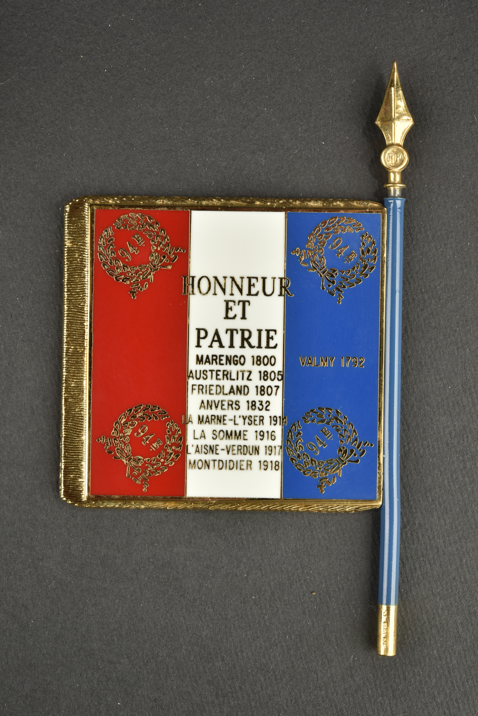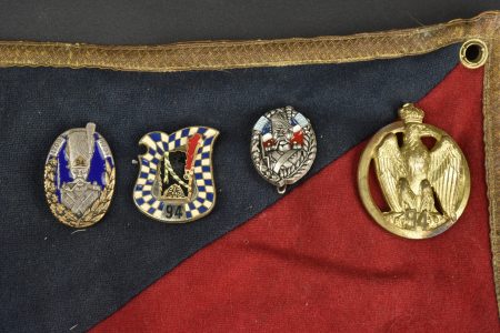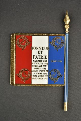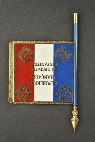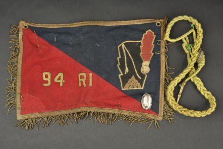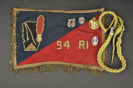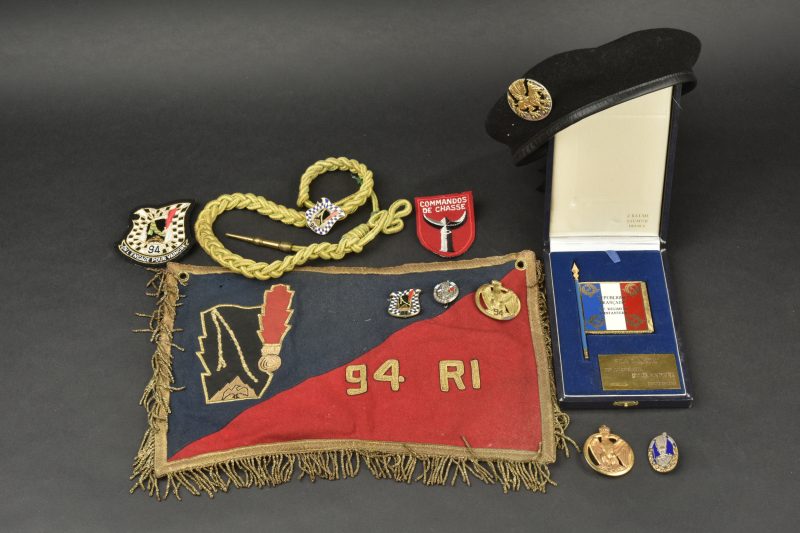 Lot Commando de Chasse 94ème RI. Comprenant les effets d’un ancien commando de chasse en Algérie ayant servi au 94ème RI avec une flamme de trompette de 94ème RI, biface. Un insigne de bérêt du 94ème RI de fabrication Drago Paris, un insigne d’amicale. Un retirage de l’insigne tissu des commandos de chasse. Une refrappe d’insigne de bérêt. Un coffret avec un drapeau régimentaire miniature en métal. Un bérêt avec la refrappe d’insigne du commando.