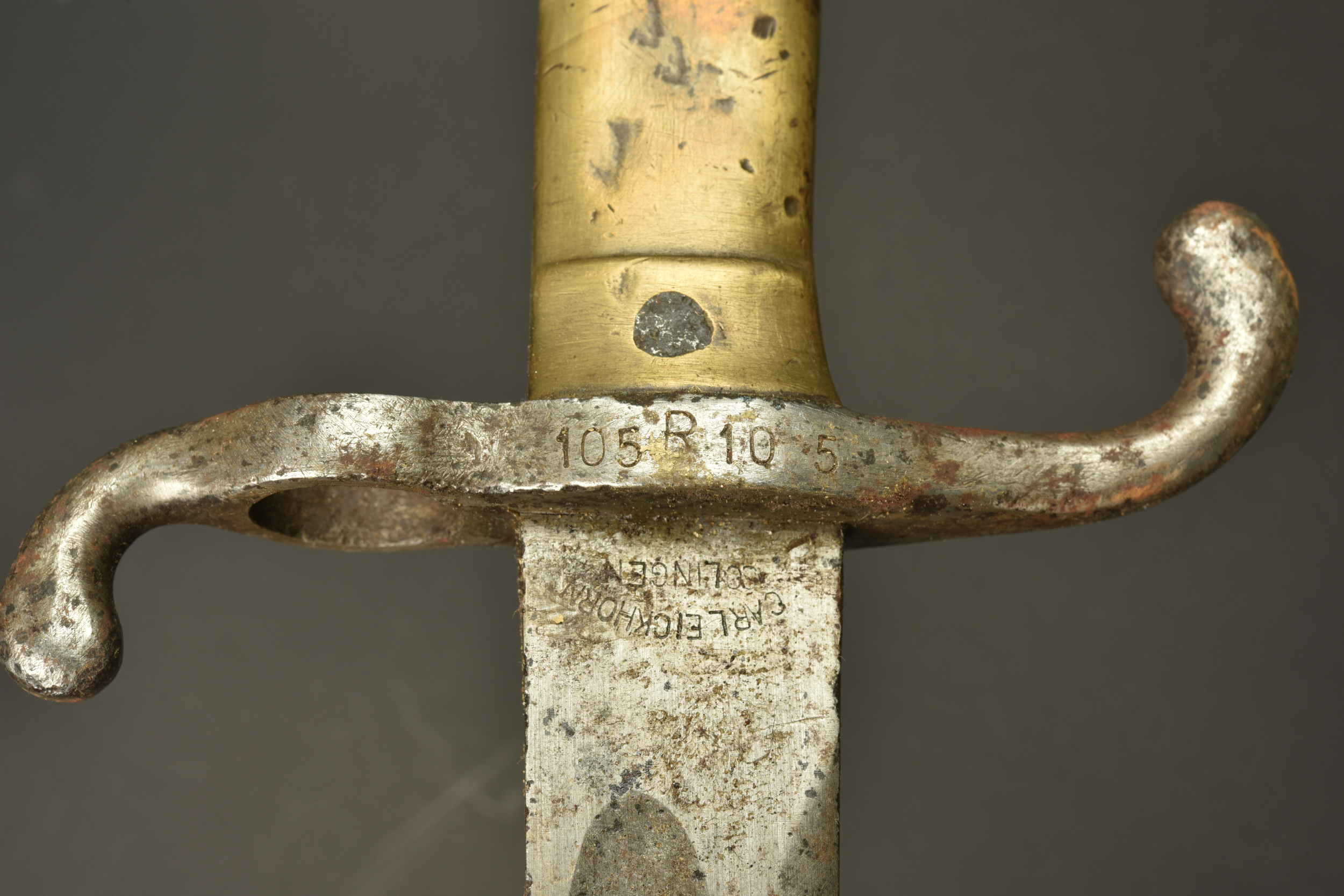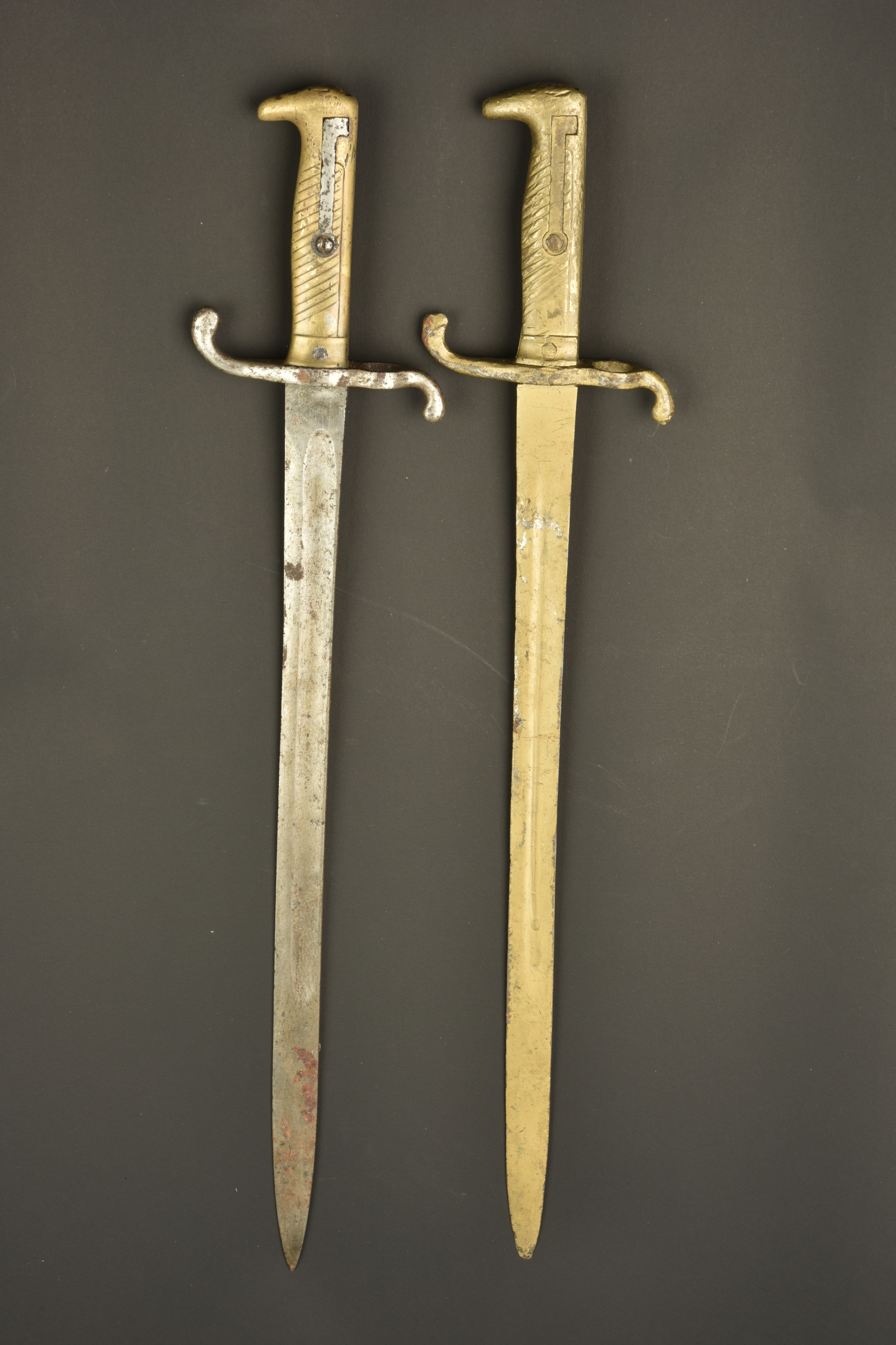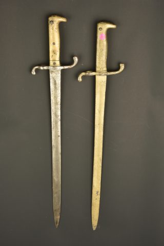 Lot de 2 baïonnettes allemandes M1871. Poignées laiton moulées. L’une avec marquage sur la croisière du 105e Régiment d’Infanterie saxon. L’autre repeinte avec peinture dorée. Les 2 avec usure importante, corrosion, sans fourreau