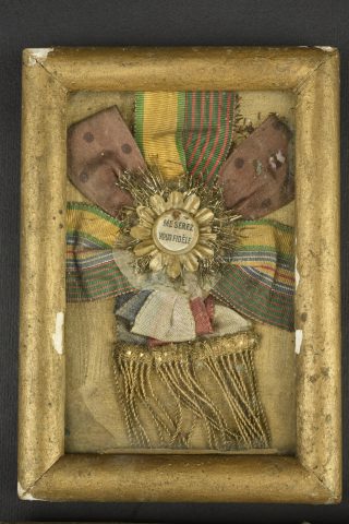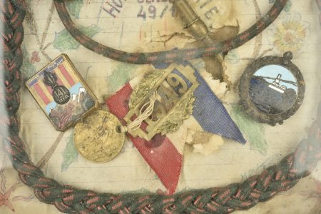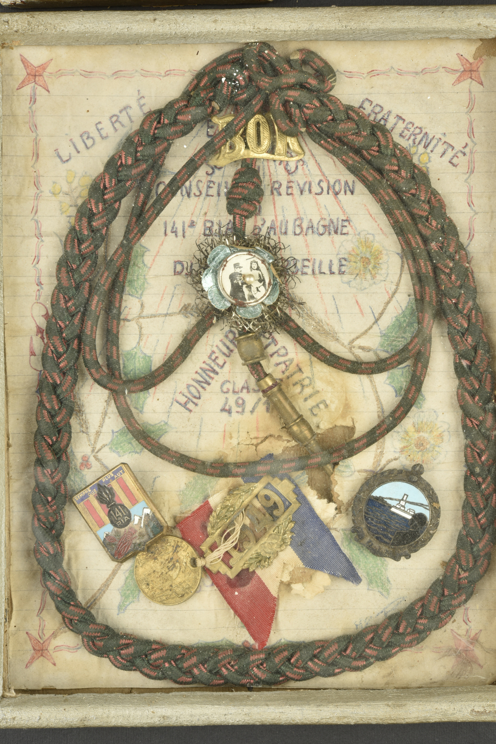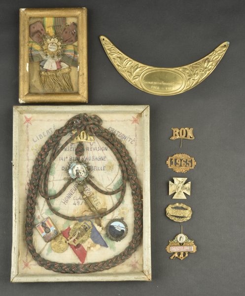 Lot de 2 cadres avec insignes 141e RIA, DIM et breloques de conscrits. Cadre d’un soldat de la classe 1949 comprenant insigne du 141e régiment d’infanterie alpine, dépôt des isoles métropolitains ,fourragère croix de guerre. Un petit cadre avec rubans de médailles 1ère guerre, et lot de breloques de conscrits et insigne de journée. Une plaque soldat de la Grande Guerre vierge