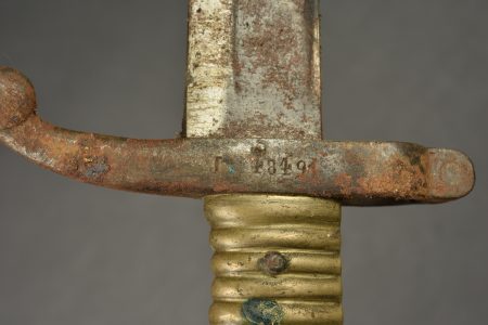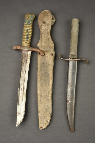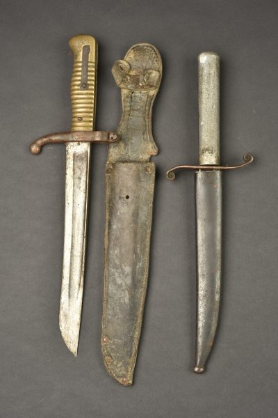 Lot de 2 poignards de tranchée artisanaux. Un poignard réalisé à partir d’une baïonnette Chassepot M1866 raccourcie, dans un étui cuir. Un poignard dont la lame est la partie terminale d’un sabre, poignée en métal blanc avec un fourreau de baïonnette raccourci. Garde en cuivre non solidaire du poignard. Usure, patine, légère corrosion, à nettoyer