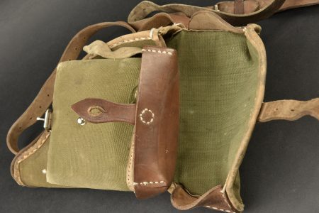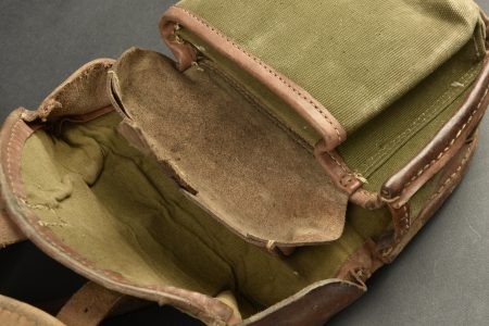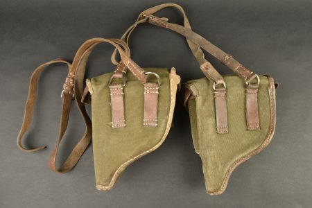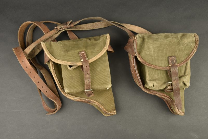 Lot de 2 sacoches pour lance fusée Pacte de Varsovie. Sacoche en toile verte et cuir fauve, avec leurs sangles de fermeture, poches à fusées, et sangles de portage. Roumanie ou autre pays de l’Est. Bon état