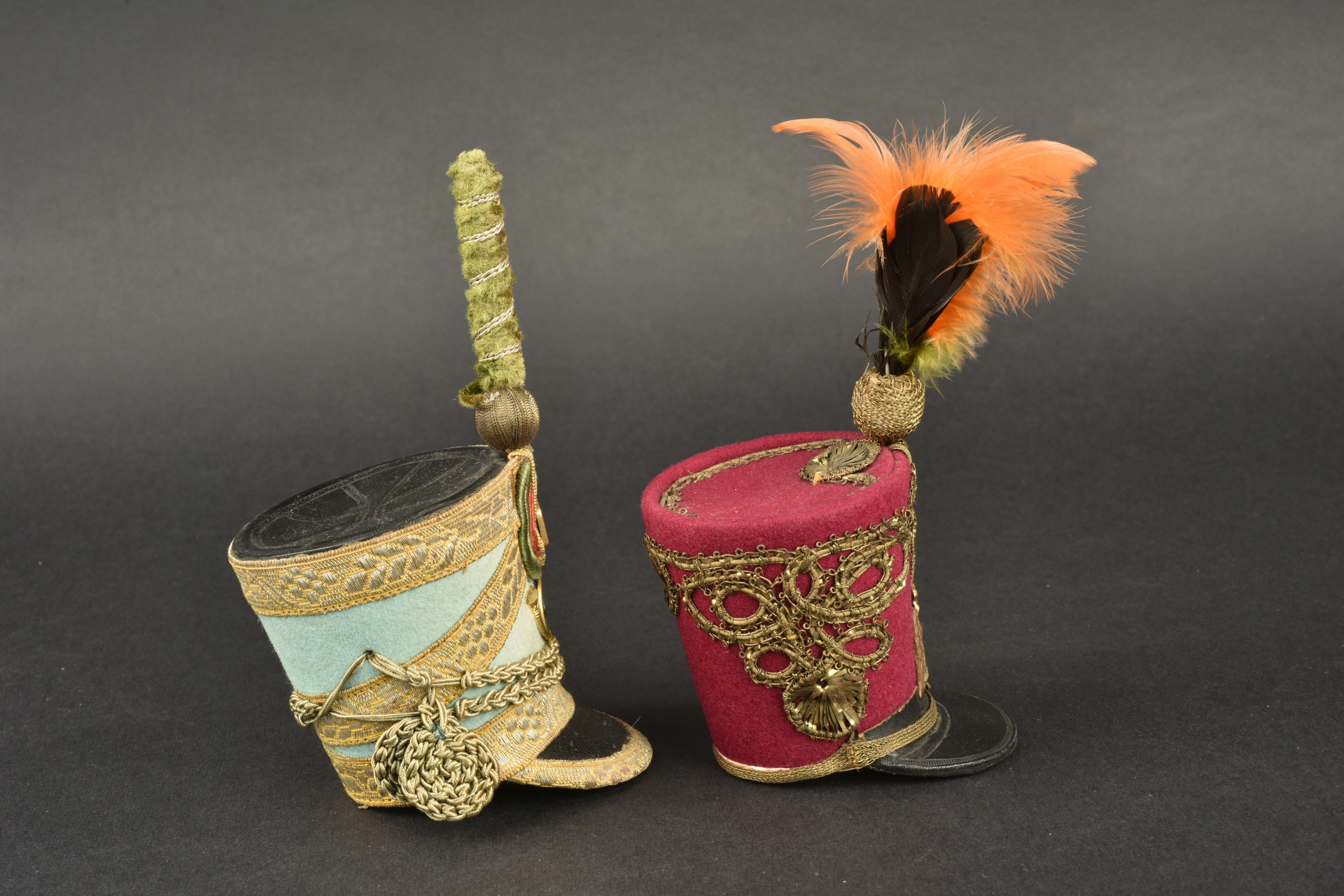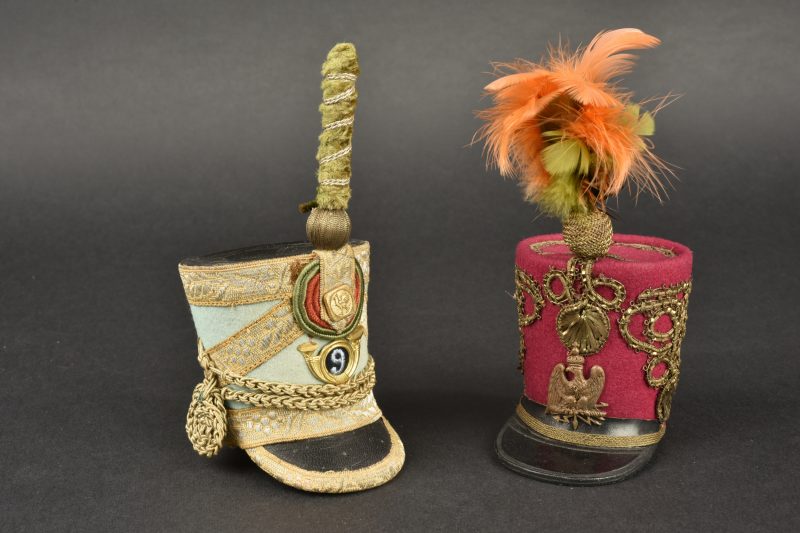 Lot de 2 Shakos miniatures. Dans le gout du 1er Empire et Restauration. Un couleur fuschia avec aigle impérial,l’uatre bleu de ciel avec insigne 9e Chasseur et bouton au coq. Avec plumets. Très joli en vitrine