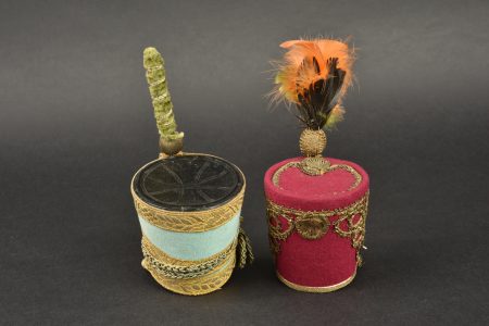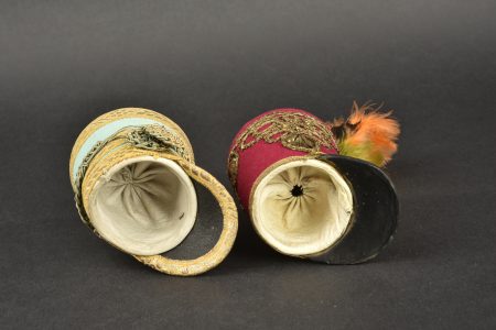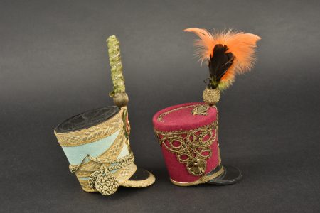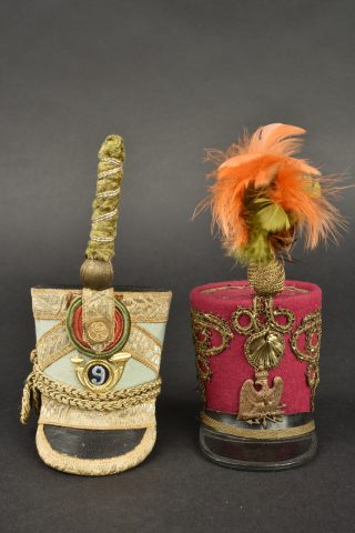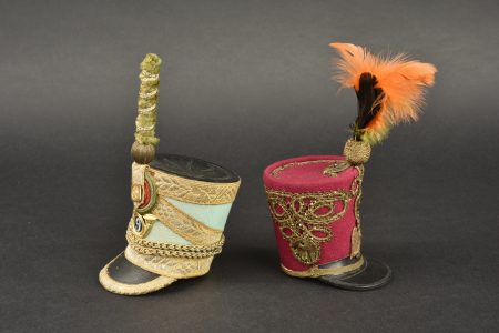 Lot de 2 Shakos miniatures. Dans le gout du 1er Empire et Restauration. Un couleur fuschia avec aigle impérial,l’uatre bleu de ciel avec insigne 9e Chasseur et bouton au coq. Avec plumets.... en savoir plus