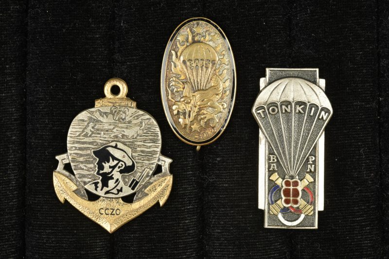 Lot de 3 insignes Commandement et Bases Aéroportées Indochine. Compagnie de Commandement Zone Ouest Cochinchine, base aéroportée Nord Tonkin et base aéroportée Sud. Tous 3 fabrication Drago Olivier Metra, bon état
