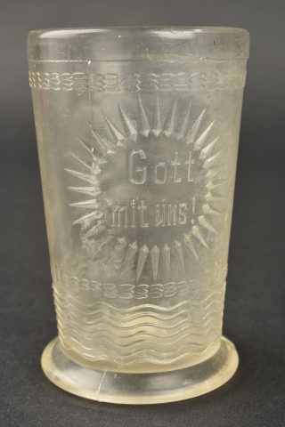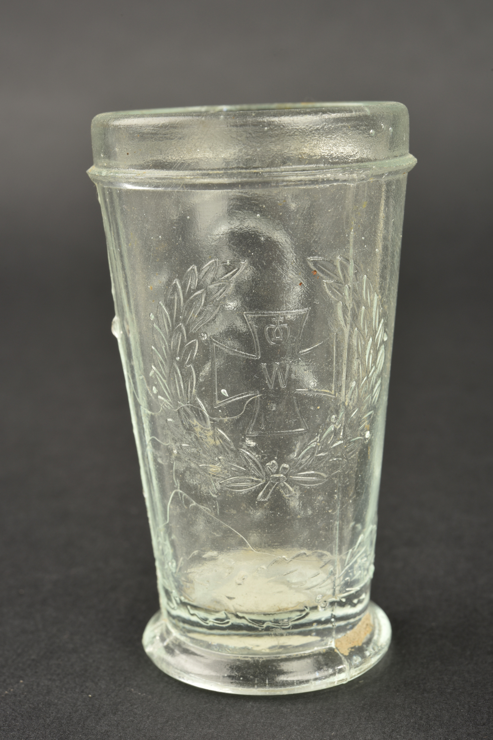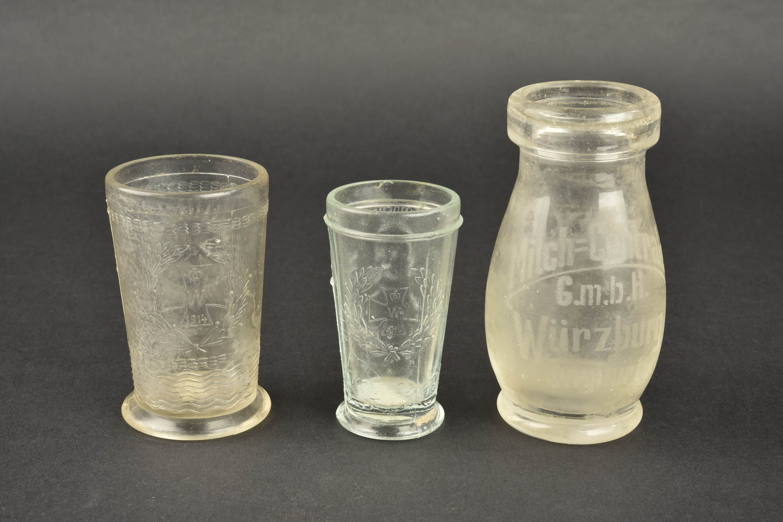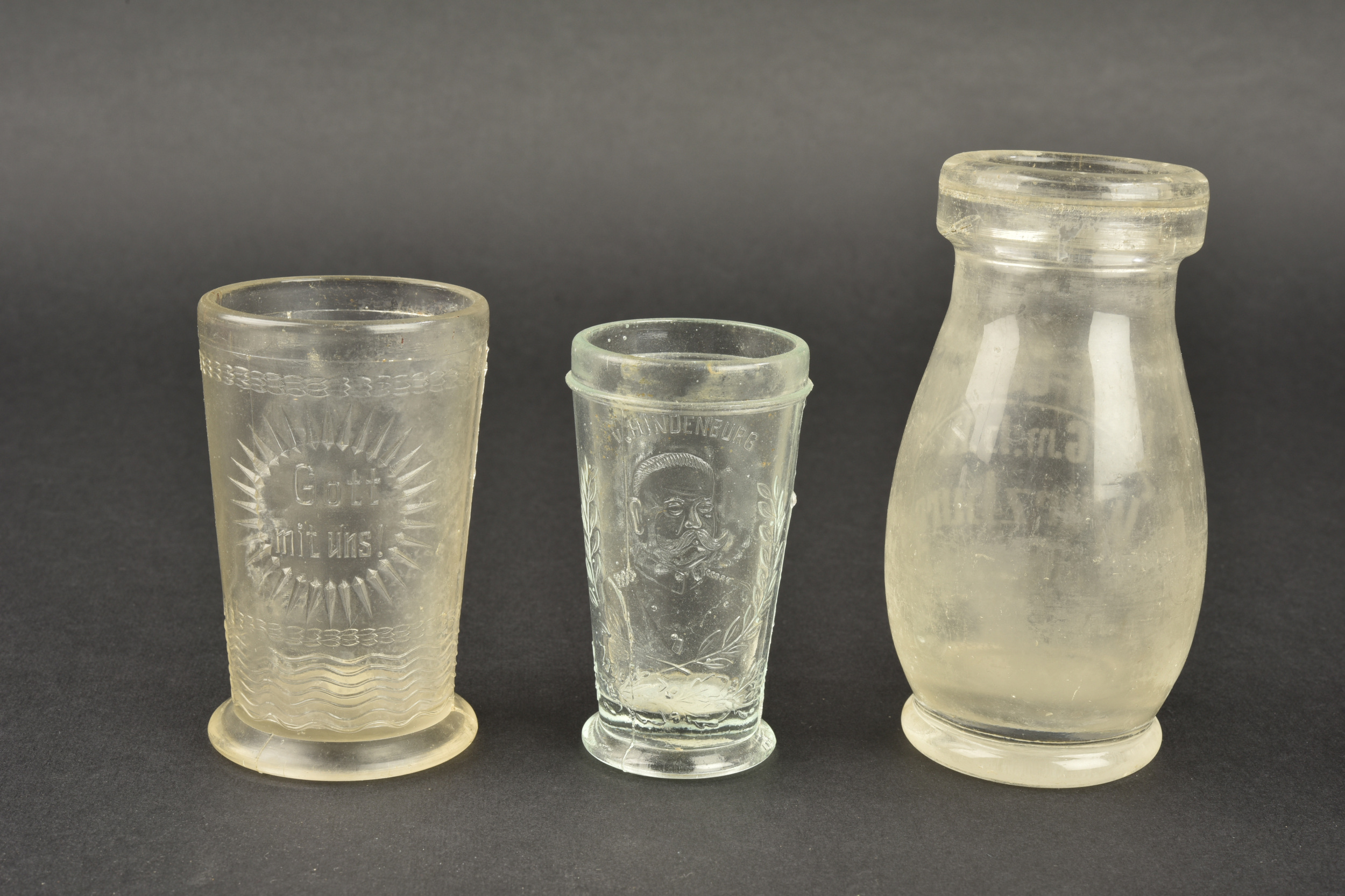 Lot de 3 verreries allemandes. Un verre Hindenburg et Croix de Fer, Un croix de fer et Gott mit Uns. On joint un pot Milch Centrale Gmbh Würzburg Joghurt à dater. Bon état.