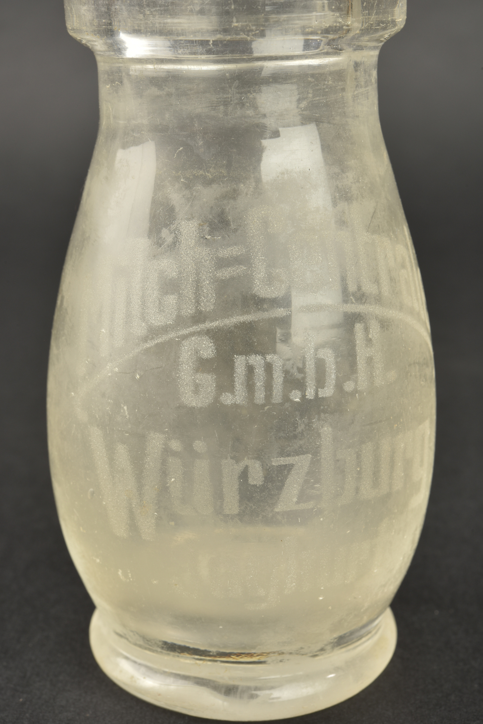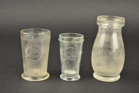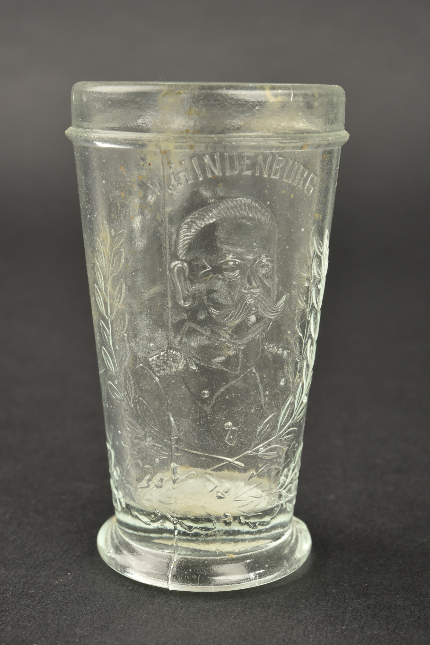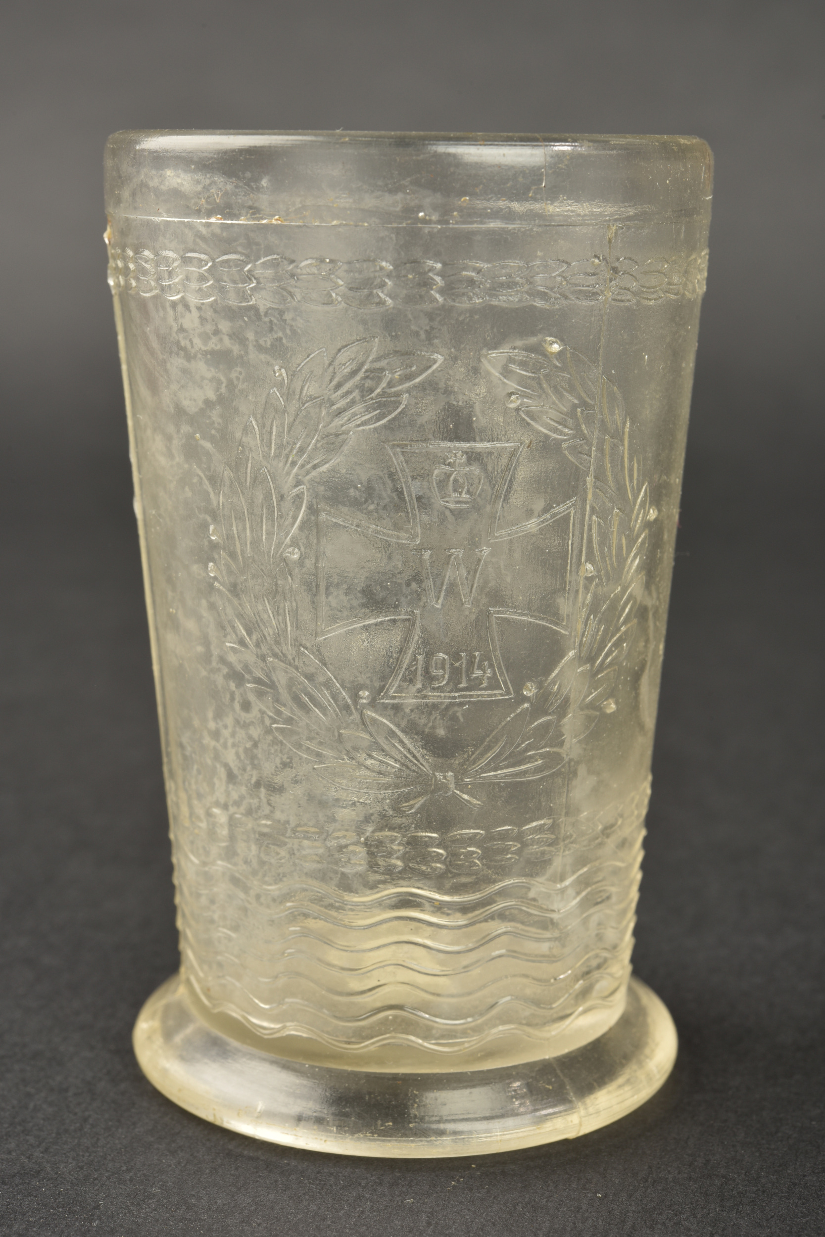Lot de 3 verreries allemandes. Un verre Hindenburg et Croix de Fer, Un croix de fer et Gott mit Uns. On joint un pot Milch Centrale Gmbh Würzburg Joghurt à dater. Bon état.