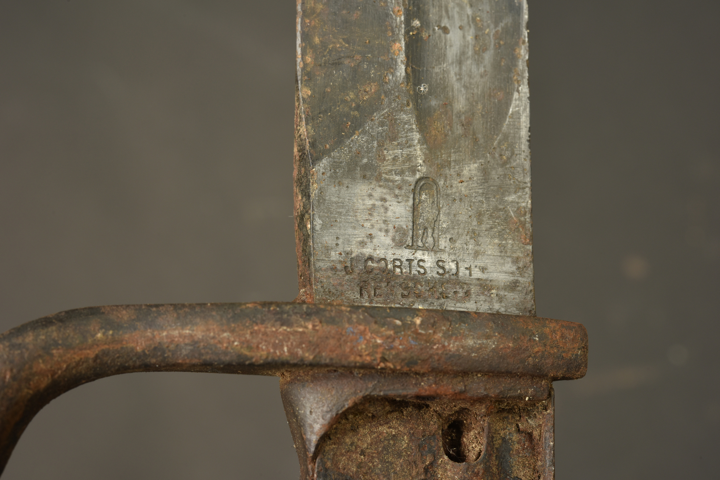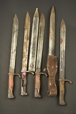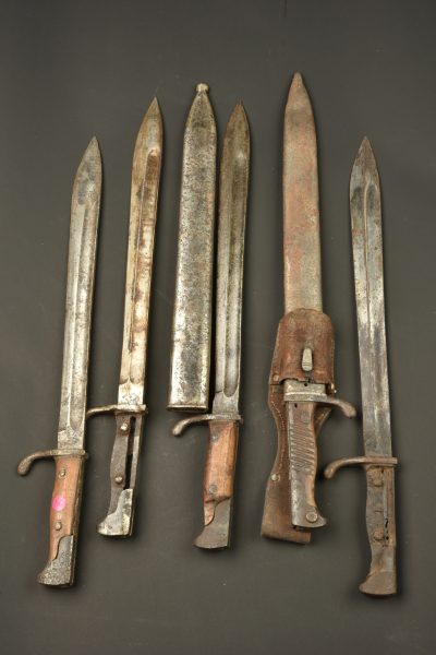 Lot de 5 baïonnettes allemandes 98-05. Une avec ses plaquettes, lame oxydée, son fourreau oxydé et un porte fourreau cuir, abimé. Une avec plaquettes artisanales postérieures, avec fourreau. 3 sans plaquettes et sans fourreau. Toutes fortement oxydées, mauvais état.