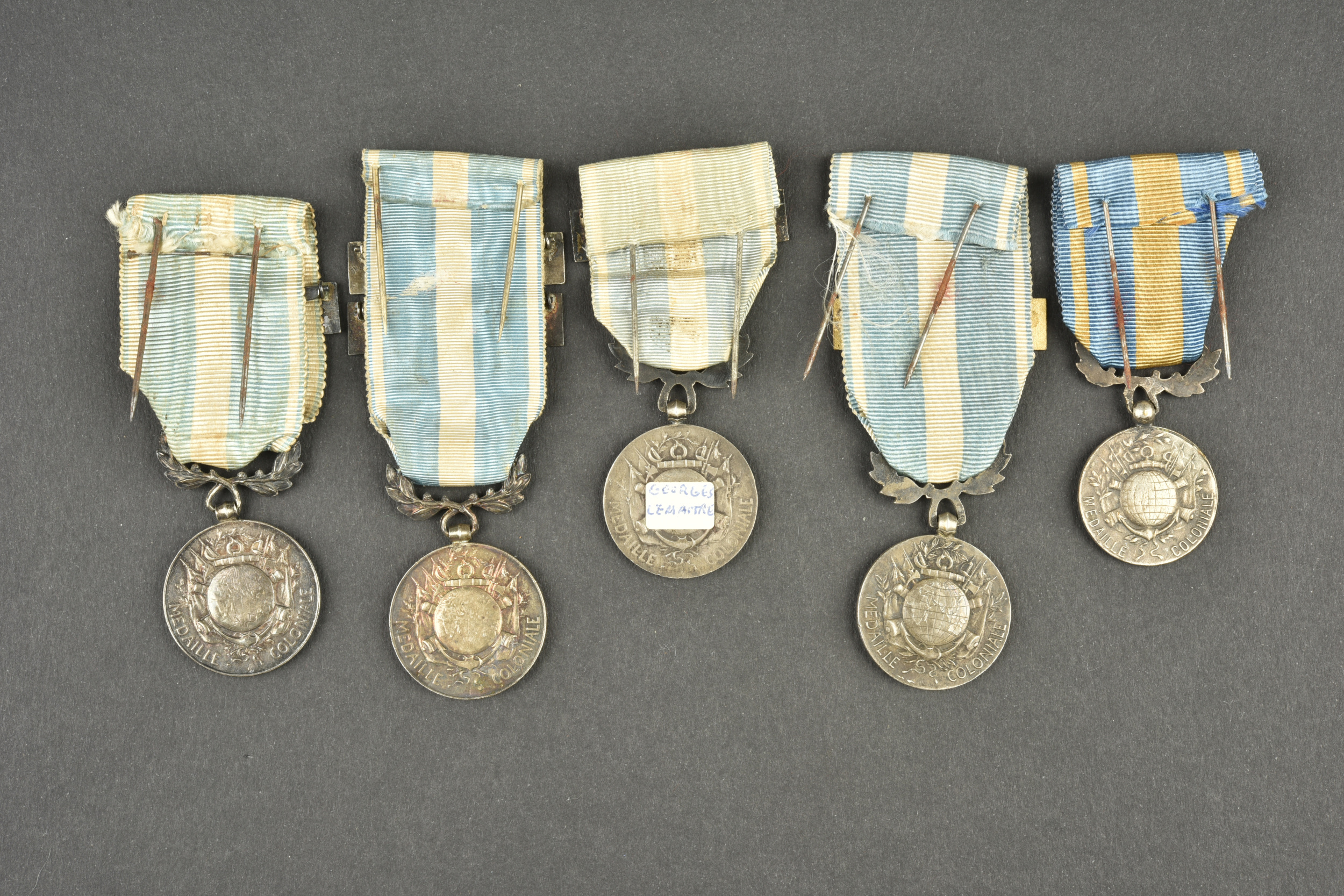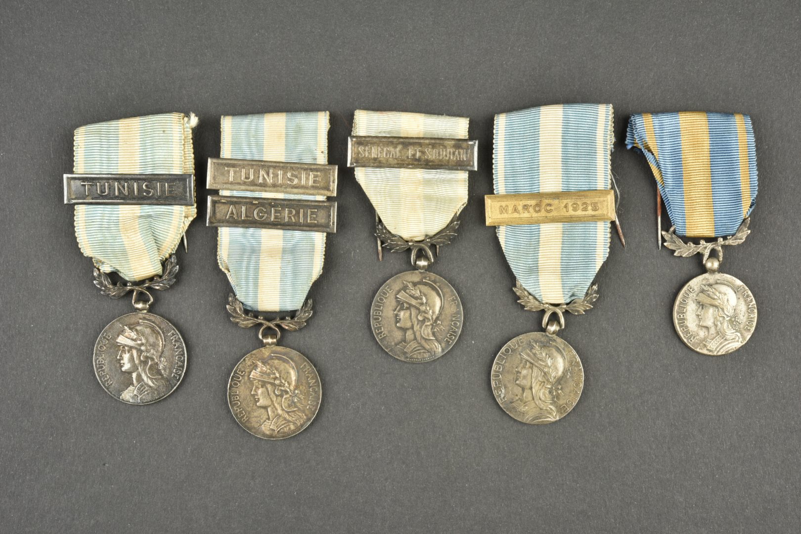 Détails de la vente >Lot de 5 médailles coloniales. Une avec agrafes Tunisie et Algérie, une avec agrafe Tunisie, une avec agrafe Maroc 1925, une avec agrafe Sénégal et Soudan et une sans agrafe. Divers états,... en savoir plus