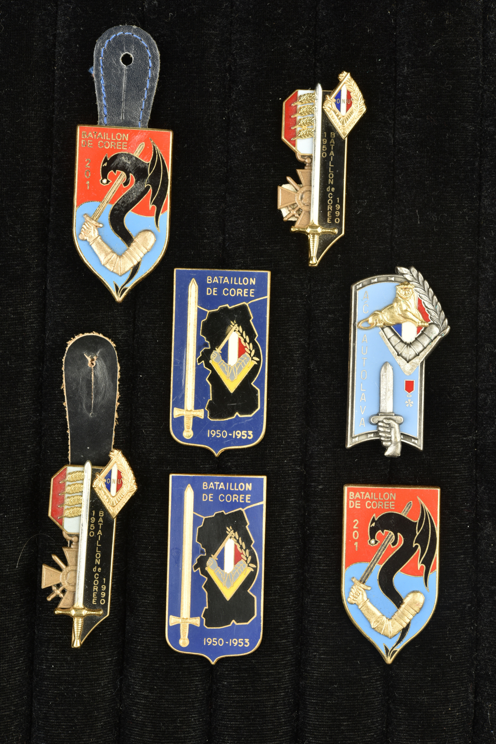 Détails de la vente >Lot de 7 insignes de promotions relatifs au Bataillon de Corée. Comprenant 2 insignes EOR Ecole d’Applic, ation de l’ABC 201 Bataillon de Corée, 2 insignes EOR Coëtquidan, 2... en savoir plus