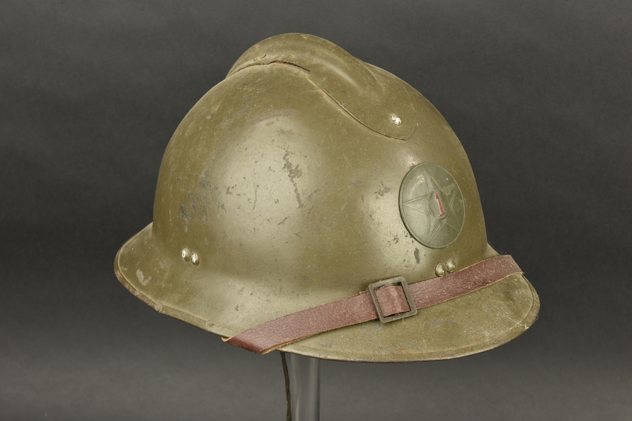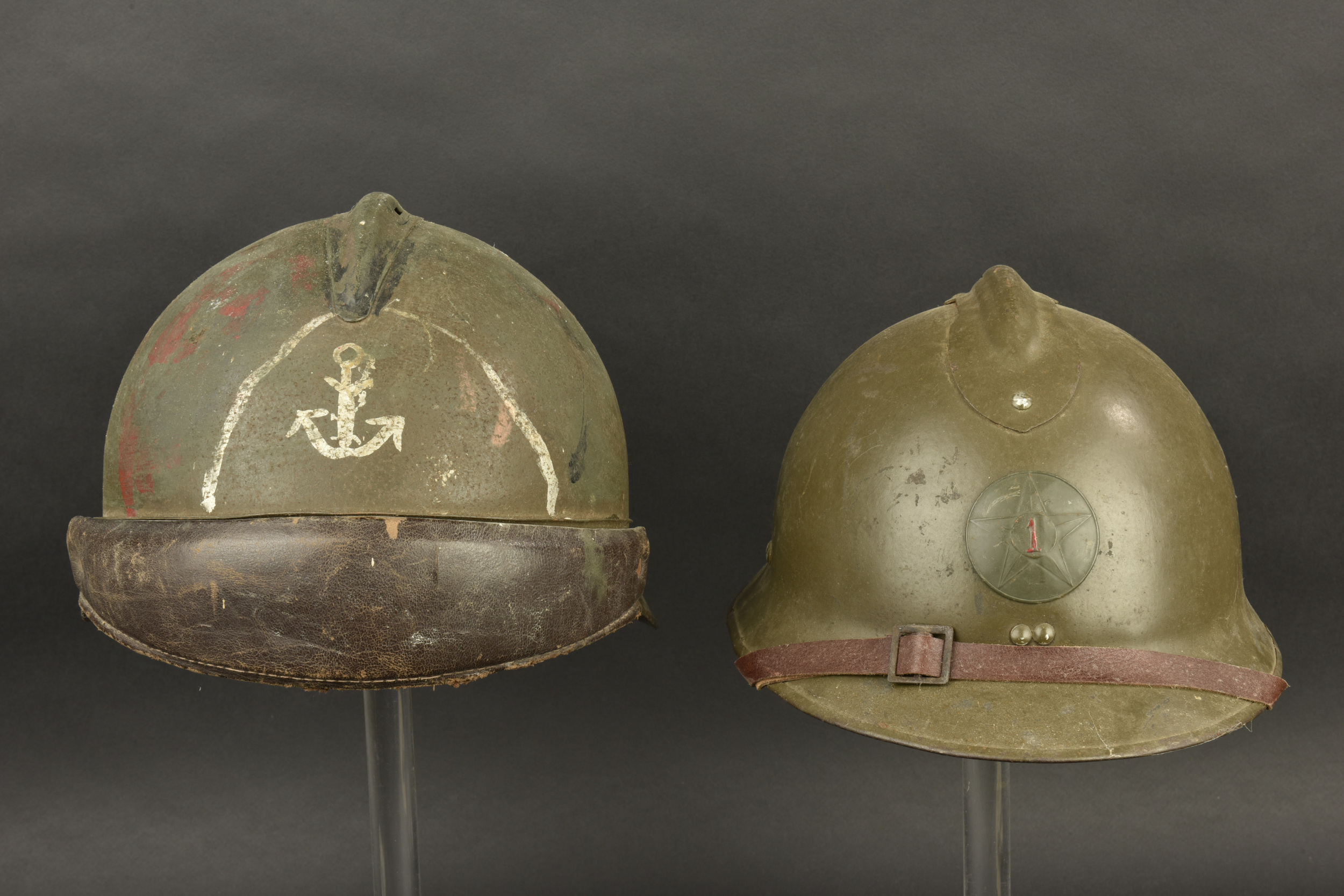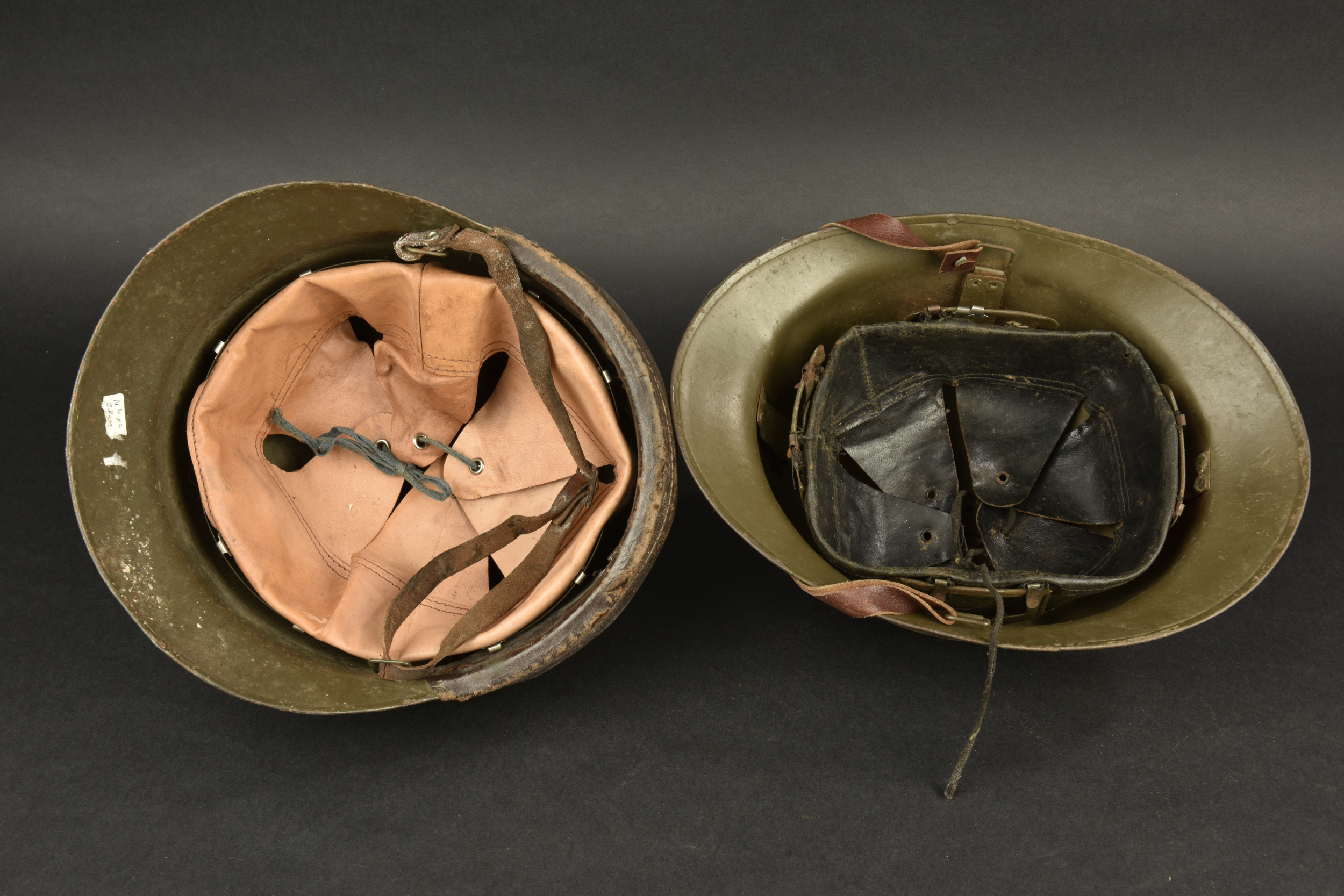 Lot de casques. Comprenant un casque modèle 1945 Jeanne d’Arc en peinture kaki d’origine, insigne frontal de l’infanterie coloniale peint surmonté d’un arc de cercle. Coiffe du type Adrian 1926. Un casque Adrian modèle 1926 avec reproduction d’insigne modèle 1937 du 1er Spahis, coiffe à six dents de loup, jugulaire présente.