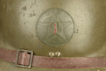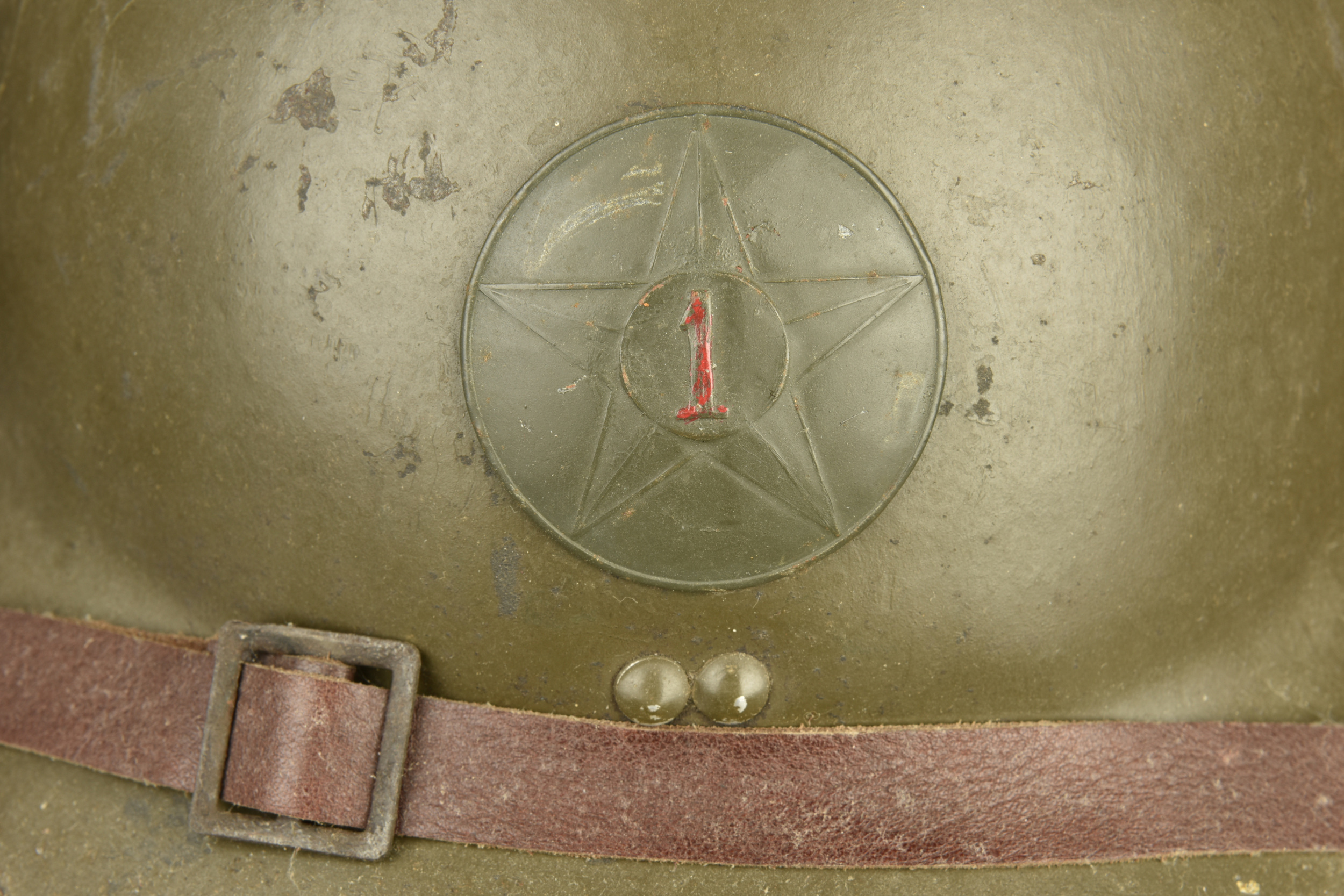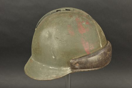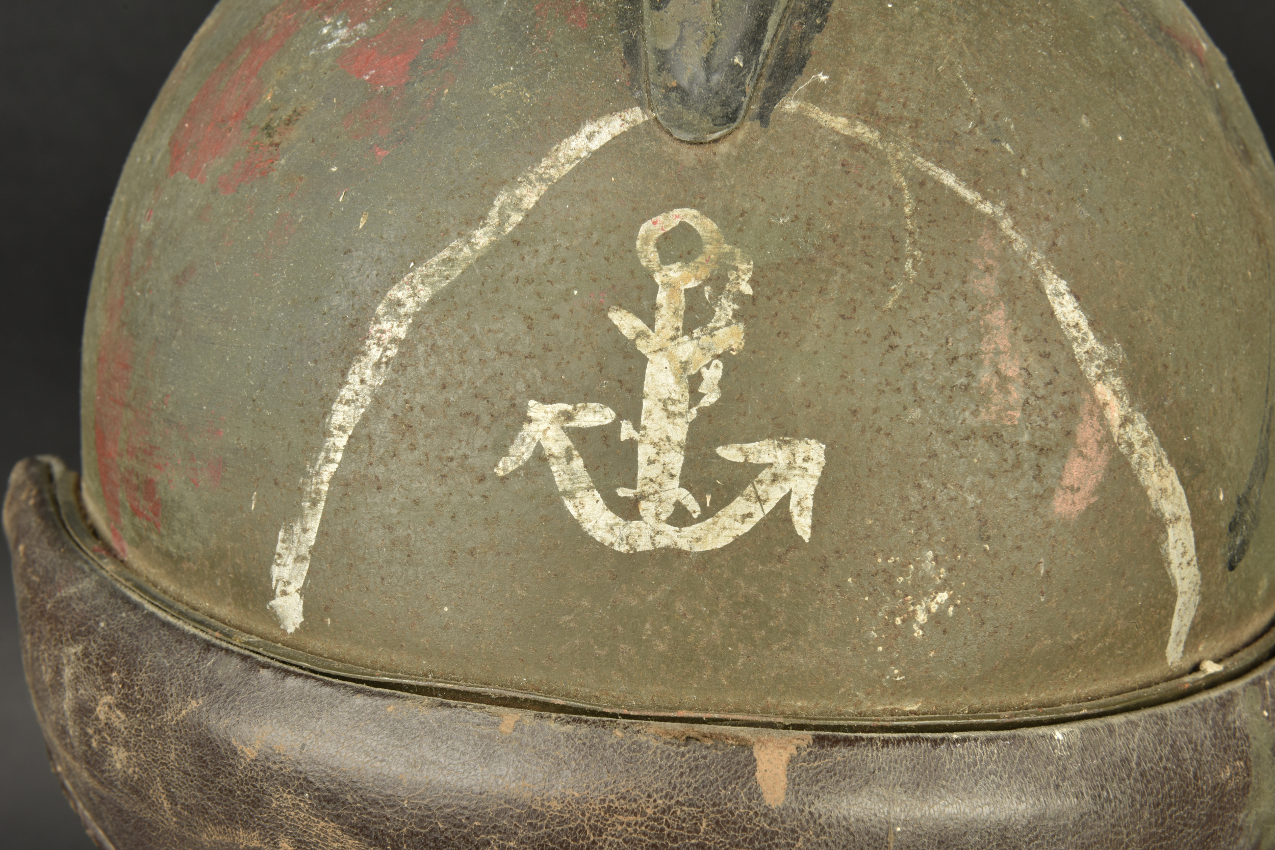 Lot de casques. Comprenant un casque modèle 1945 Jeanne d’Arc en peinture kaki d’origine, insigne frontal de l’infanterie coloniale peint surmonté d’un arc de cercle.... en savoir plus