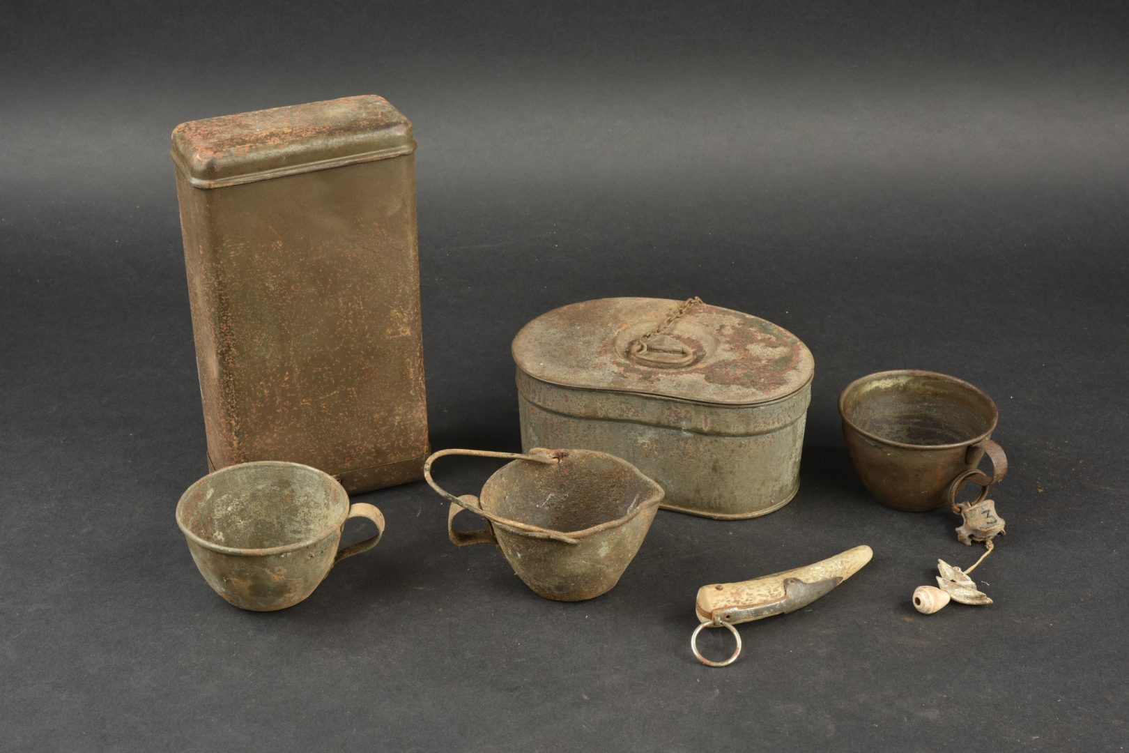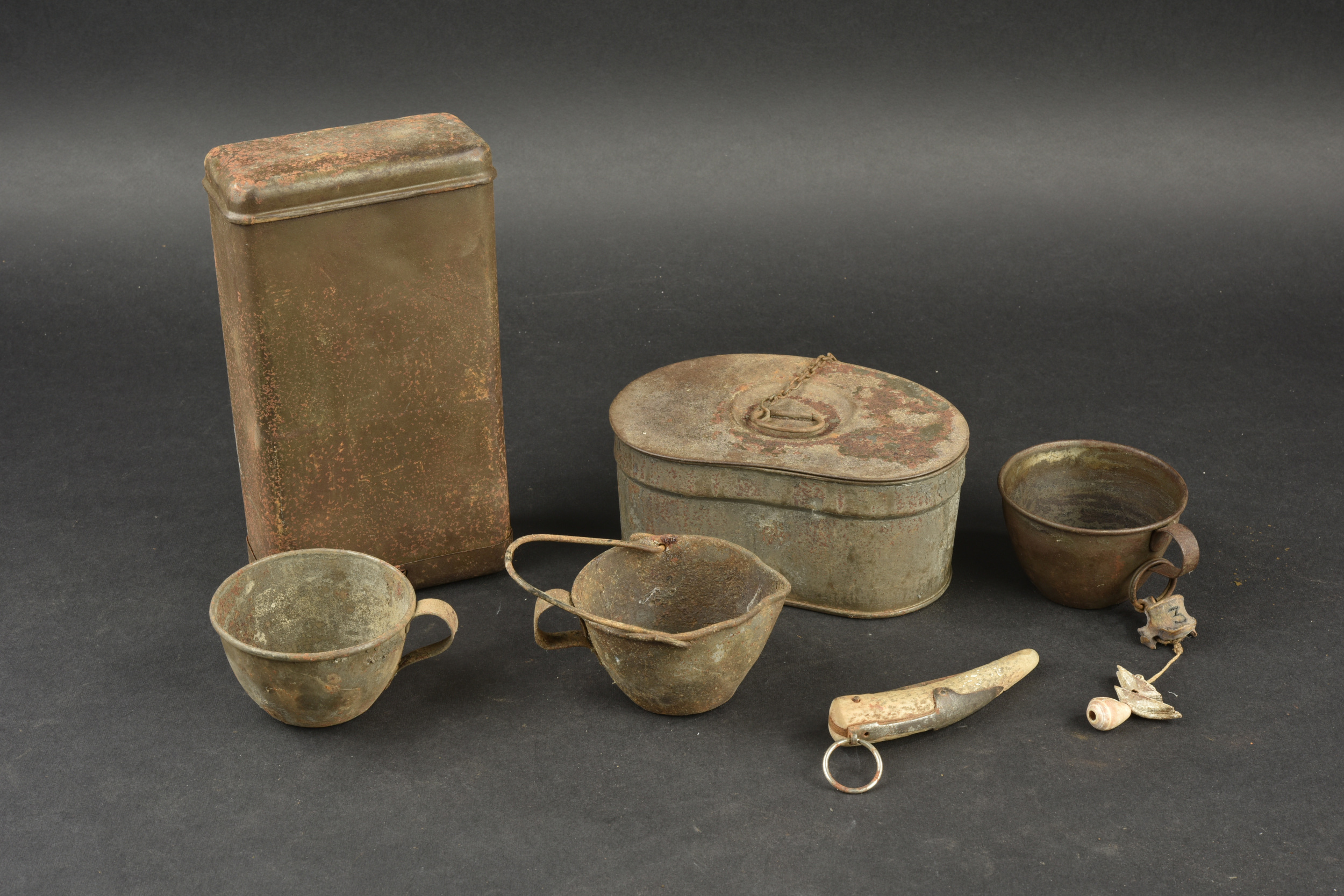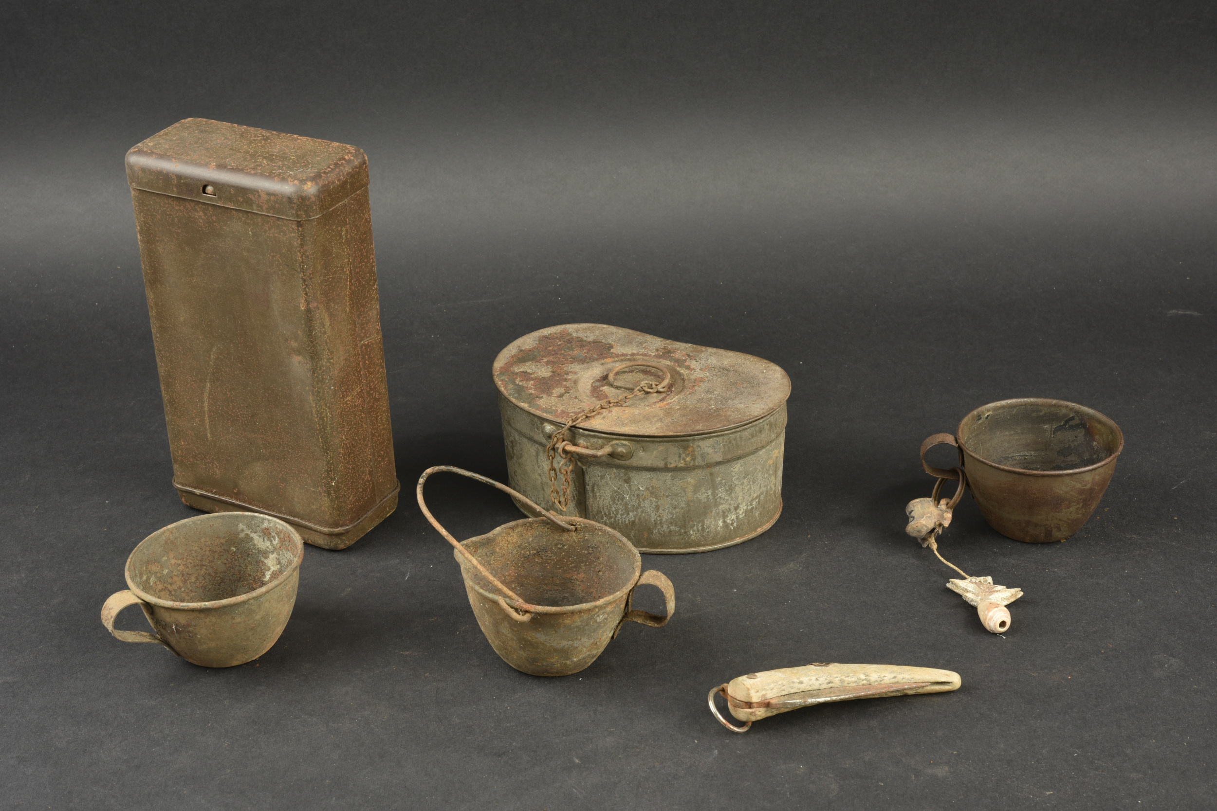 Lot d’équipement français 1e Guerre. Comprenant une gamelle haricot avec son couvercle, une boîte à vivres, un couteau, un quart, un quart avec anse et un quart décoré avec os et coquillage typique des troupes coloniales. Usure, patine