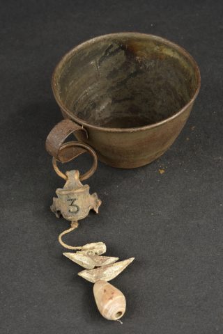 Détails de la vente >Lot d’équipement français 1e Guerre. Comprenant une gamelle haricot avec son couvercle, une boîte à vivres, un couteau, un quart, un quart avec anse et un quart décoré avec os et... en savoir plus