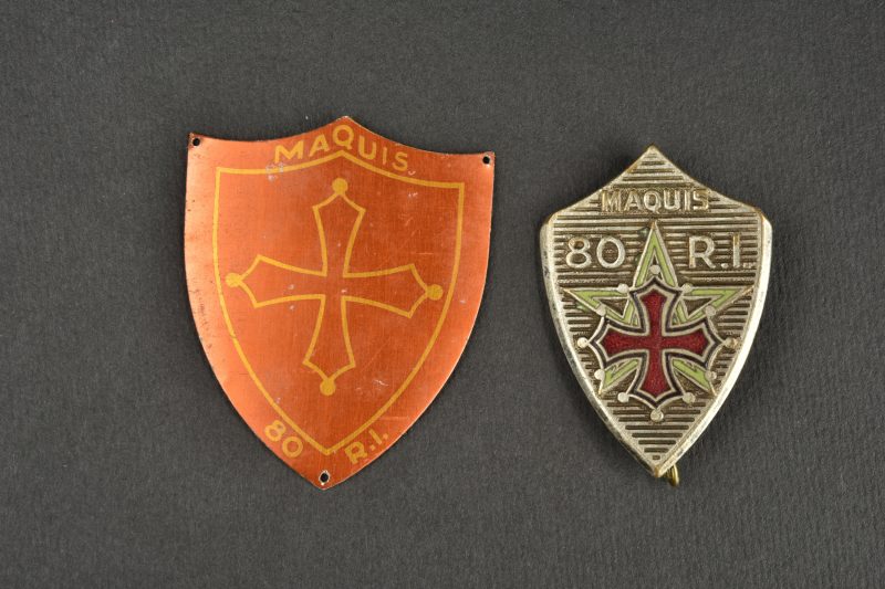 Lot d’insignes Maquis du 80ème RI. Comprenant un insigne en métal émaillé du maquis du 80ème régiment d’infanterie, fabrication Drago déposé. Un insigne en fin métal anodisé marqué Maquis 80ème RI, trois trous de couture.