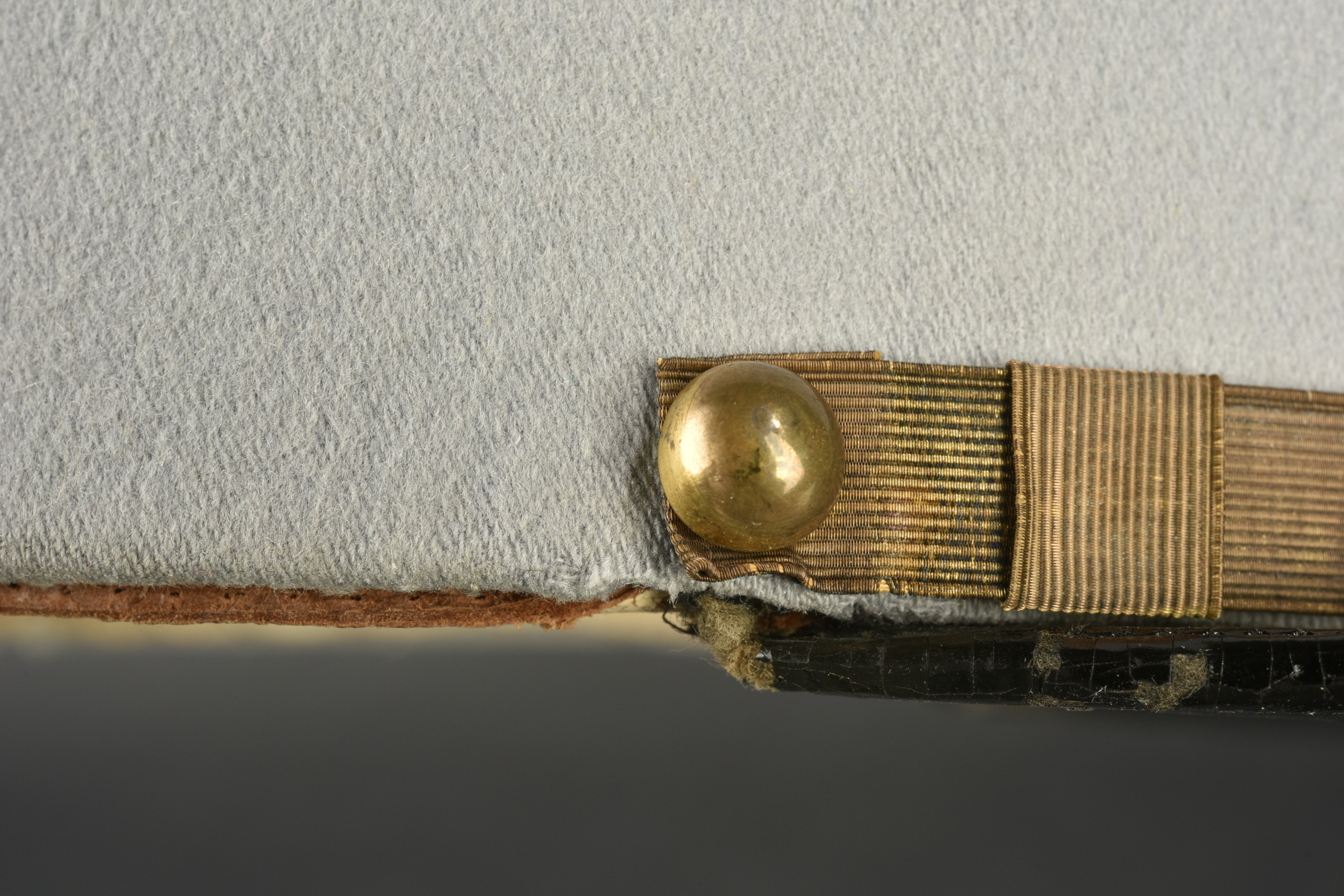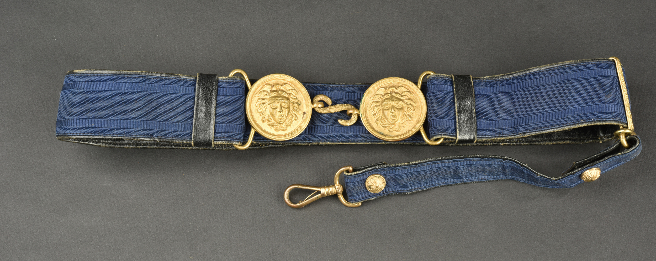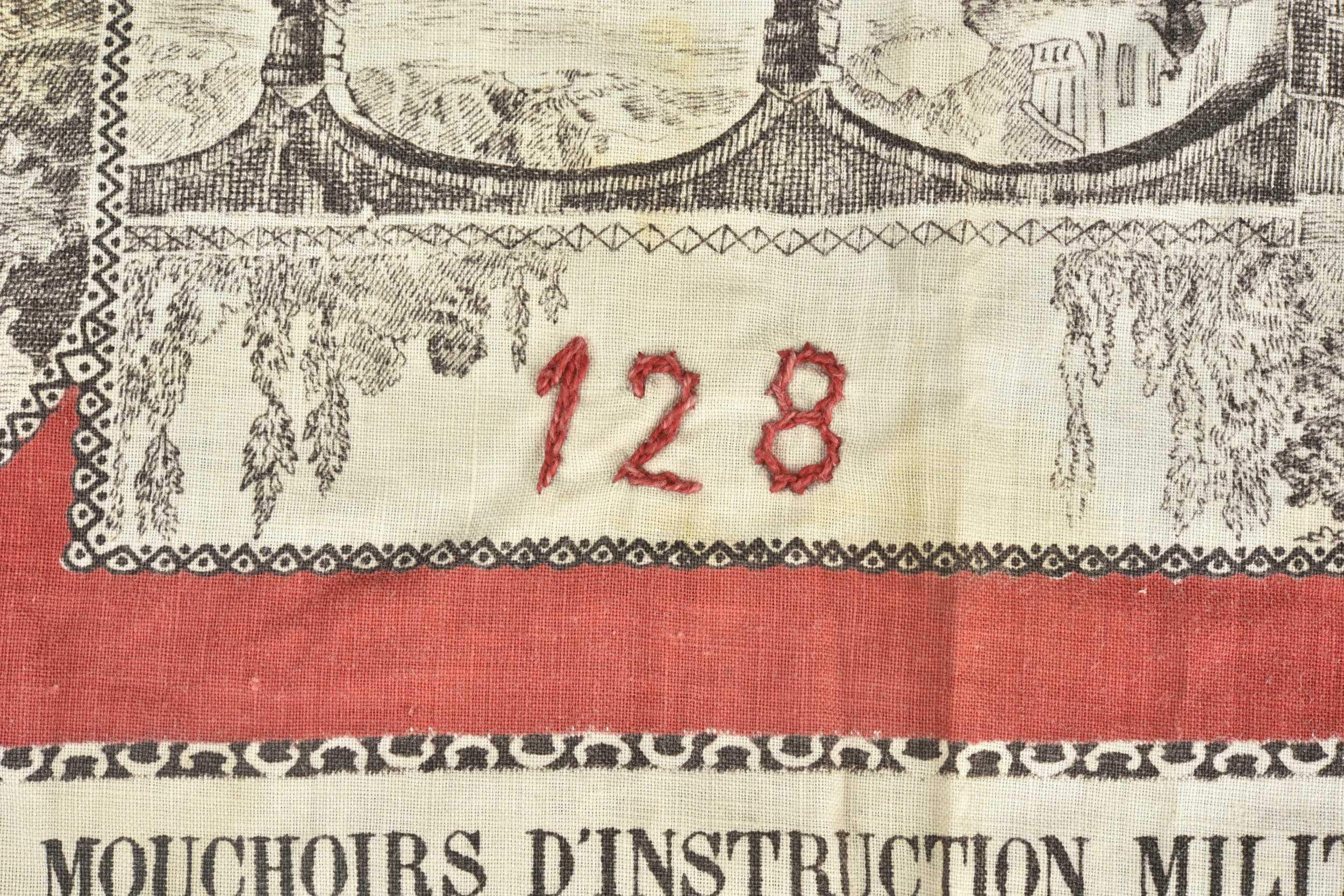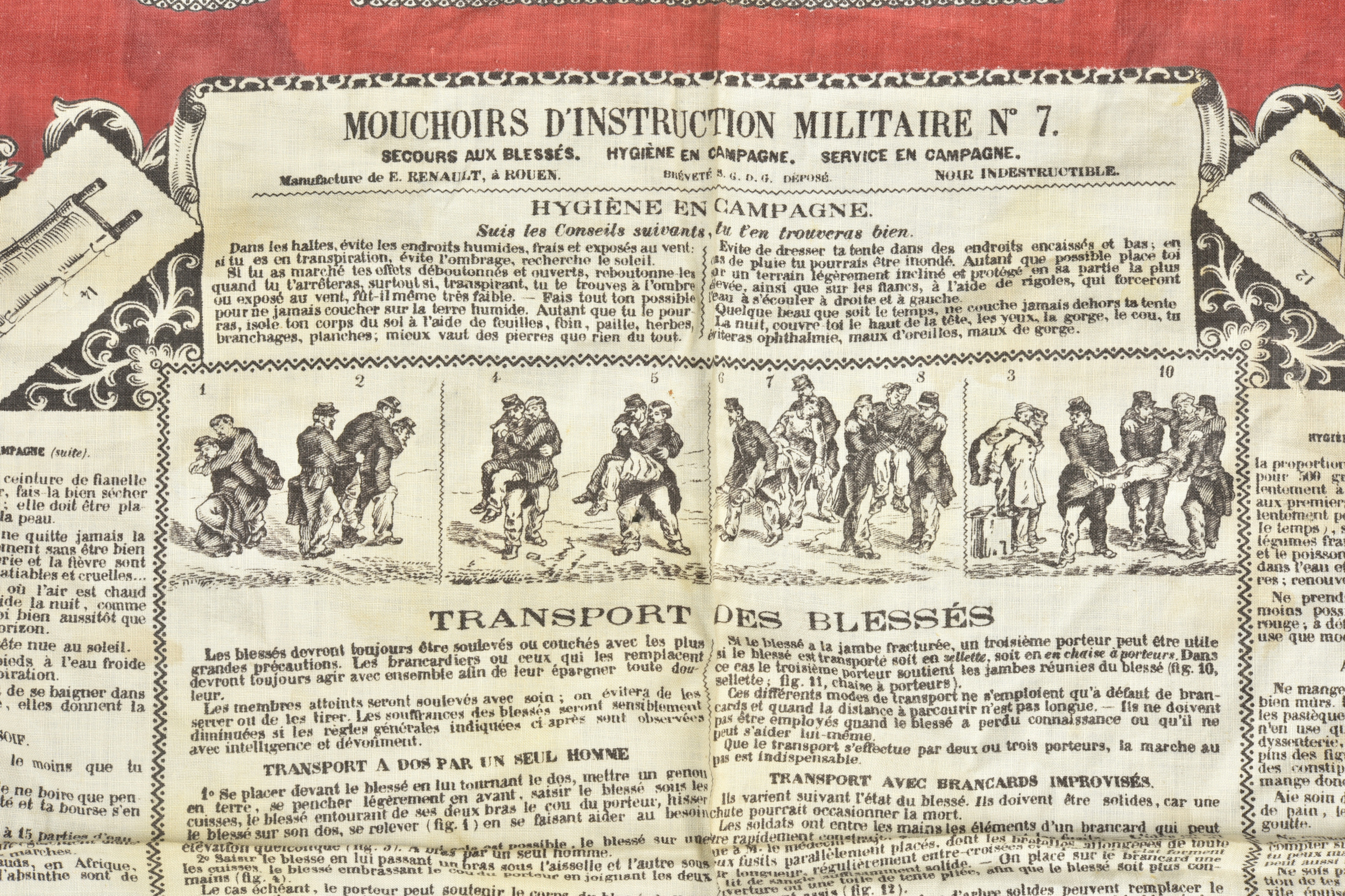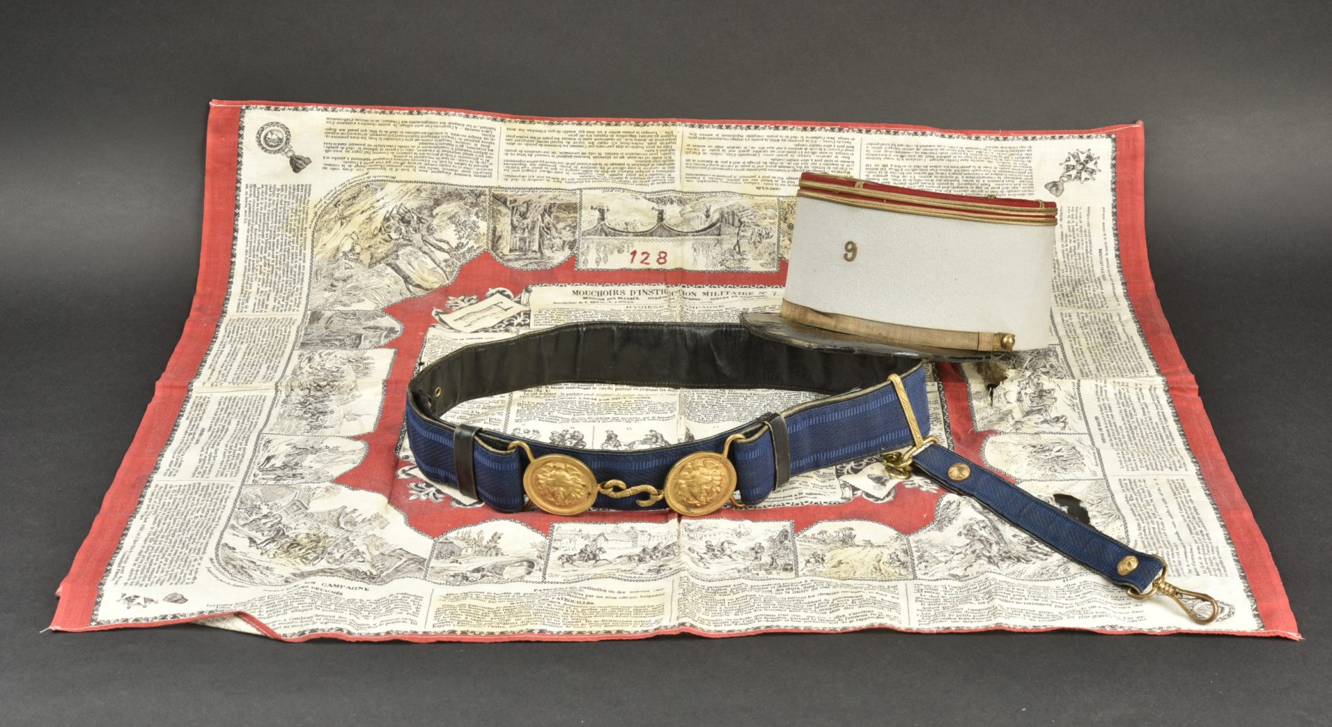 Lot divers. Comprenant un képi modèle 1935 du 9ème tirailleur ou spahis algérien, plateau rouge en drap garance, grades de lieutenant, chiffre 9 brodé cannetille, boutons dorés lisses retenant une fausse jugulaire dorée, visière en cuir, marquage d’un tailleur de Lyon sur le bandeau de sudation. Un mouchoir d’instruction militaire numéro 1 matriculé 128, celui ci illustre le transport des blessés, trois trous. Un ceinturon de grande tenue modèle 1931, plateau à double tête, tissu bleu roi, bélière de sabre présente.